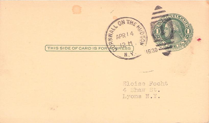 Cornwall on the Hudson (1873-1979) 1939 date-out duplex on Postal Card