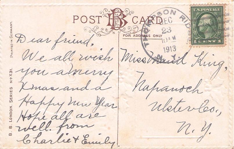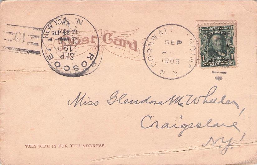 Cornwall Landing (1863/1963) 1905 duplex on post card, also Roscoe (Sullivan Co.) NY Doane 10 as transit mark, crease at bottom