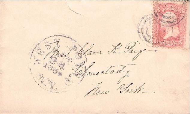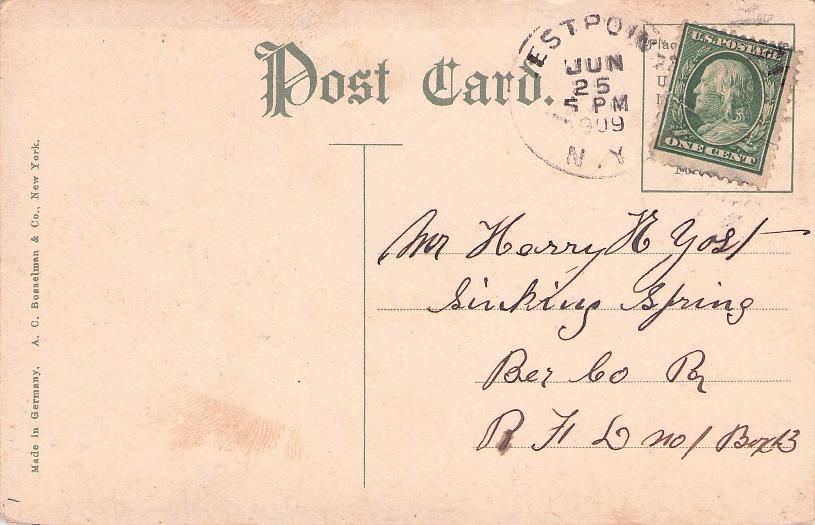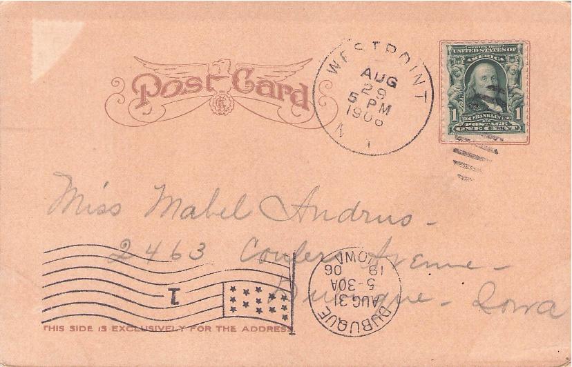 West Point 1864 cds on cover (Civil War cover); very light 1887 double circle on cover w/ contents; 1906 duplex on post card; 1909 duplex on post card; 1937 machine cancel on cover.