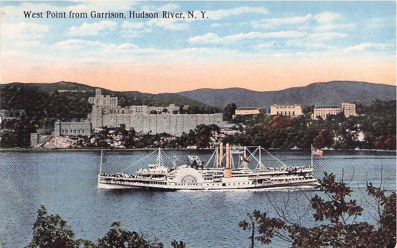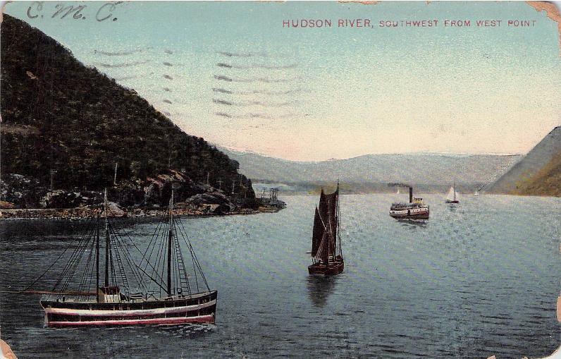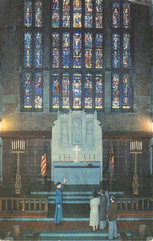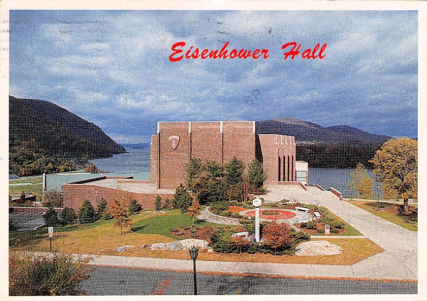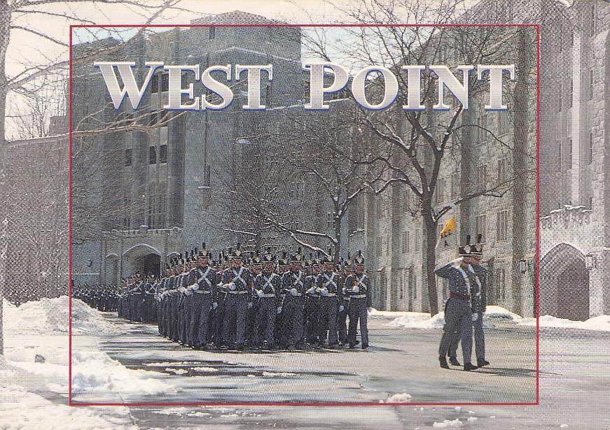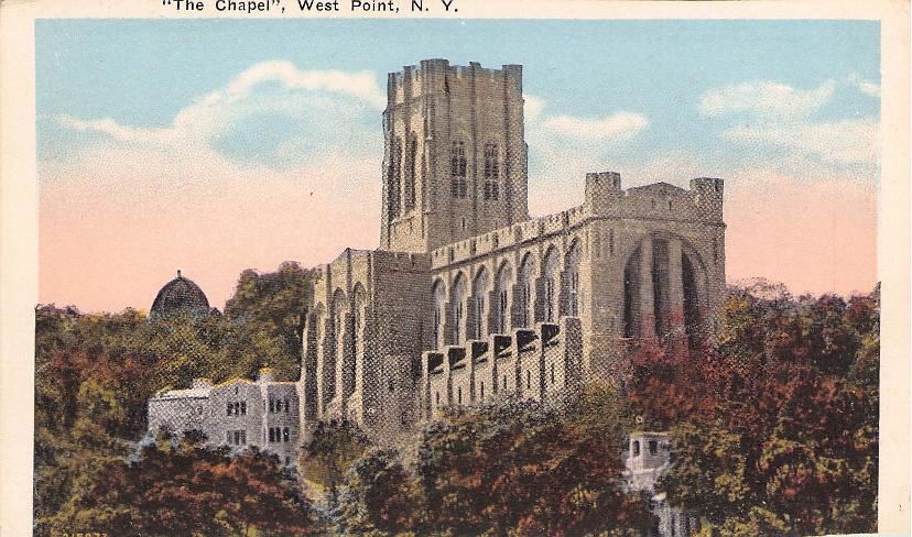 Post cards: “West Point from Garrison” [c.1910]; Hudson River [1909]; The Chapel [white border]; “Trophy Point from Battle Monument” [white border]; Trophy Point [chrome]; Cadet Chapel interior [chrome]; Cadet Color Guard [chrome, Continental]; Eisenhauer Hall (Continental)