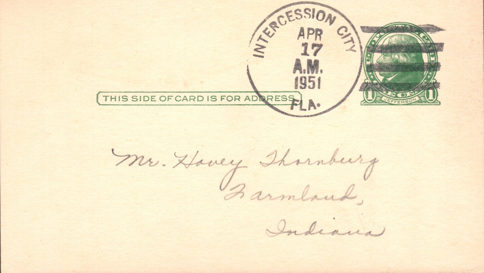 - Intercession City 1951 4-bar on Postal Card