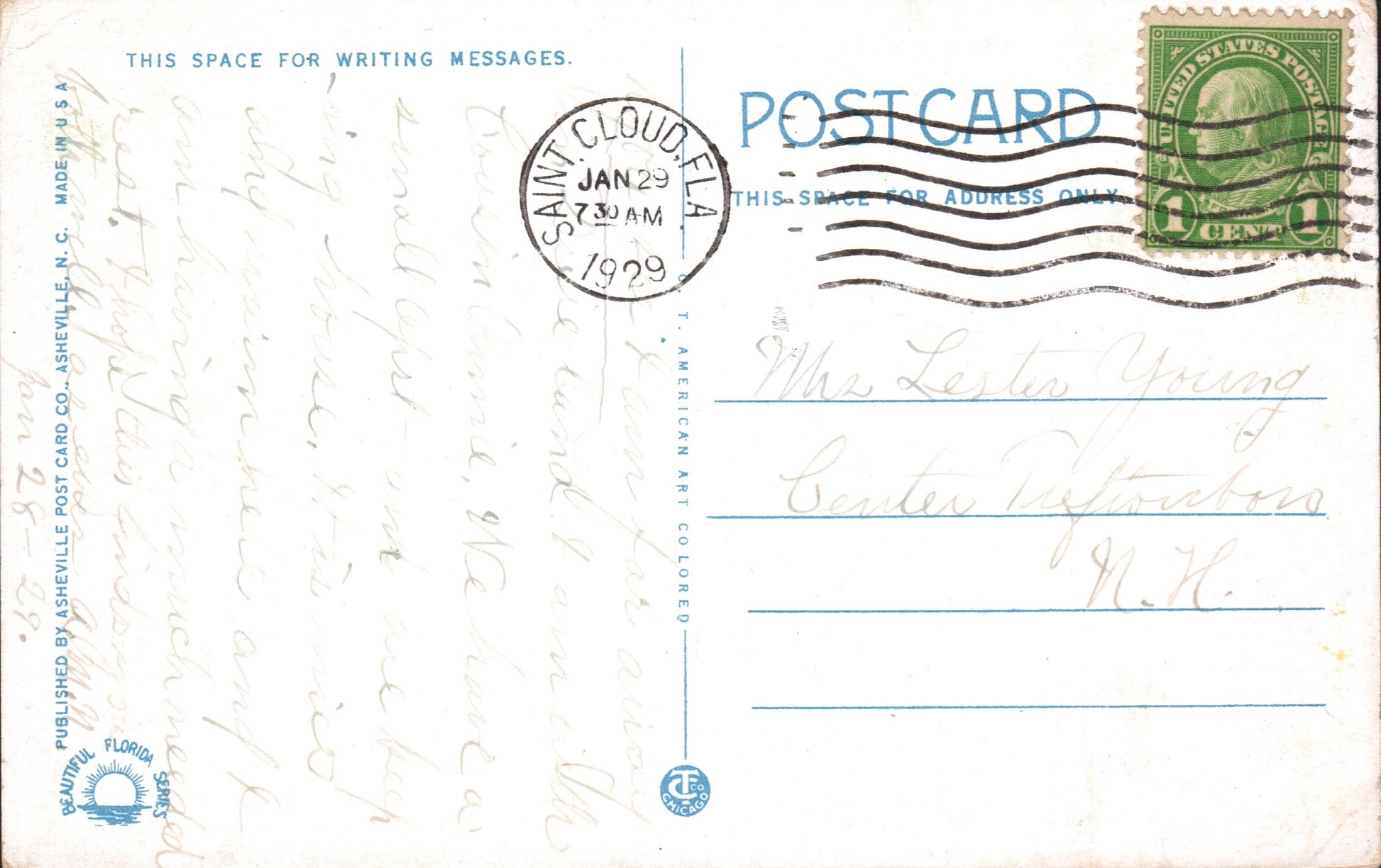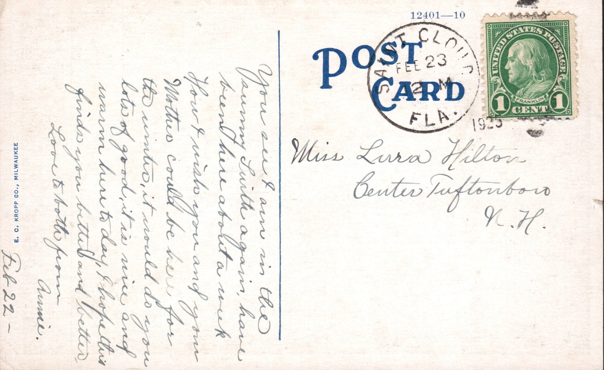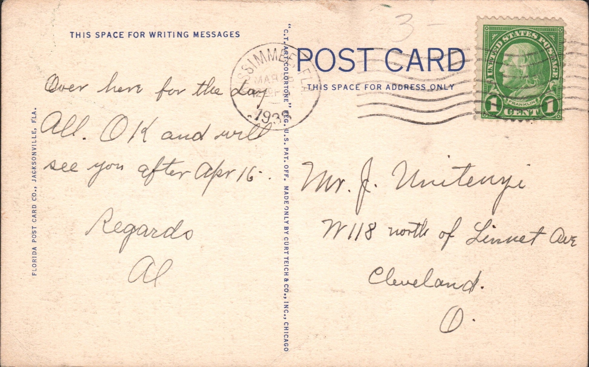 - Kissimmee 1938 machine cancel on post card