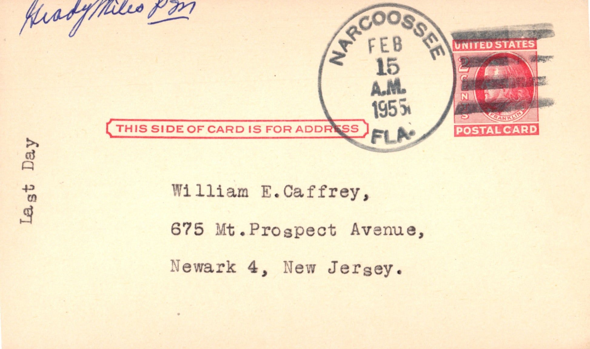 - Narcoossee (1887-1955) 1955 4-bar on Postal Card, PM autograph