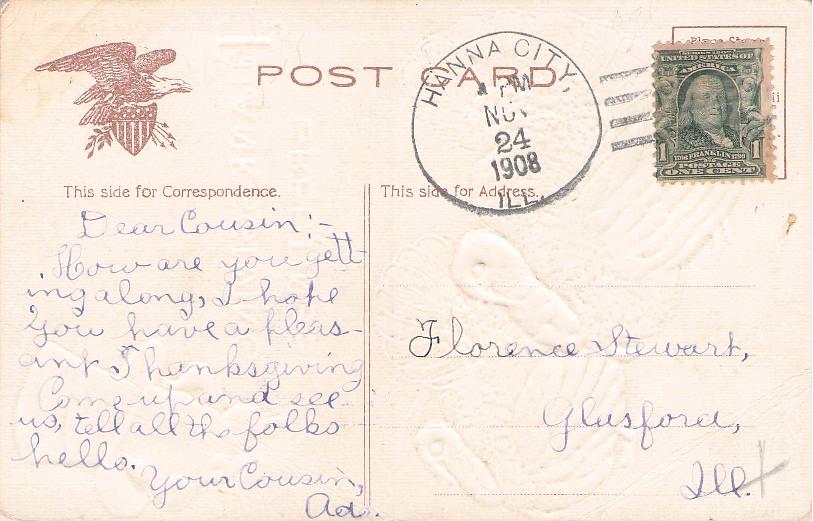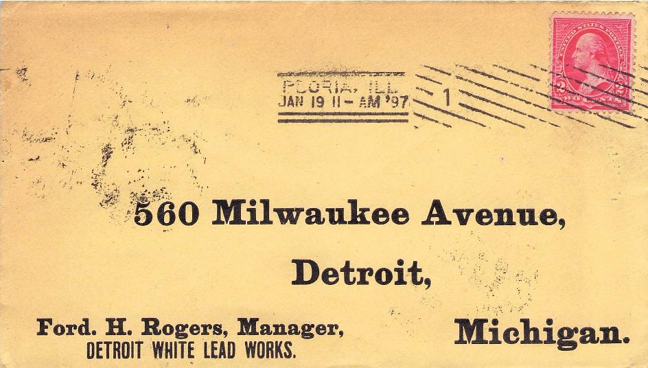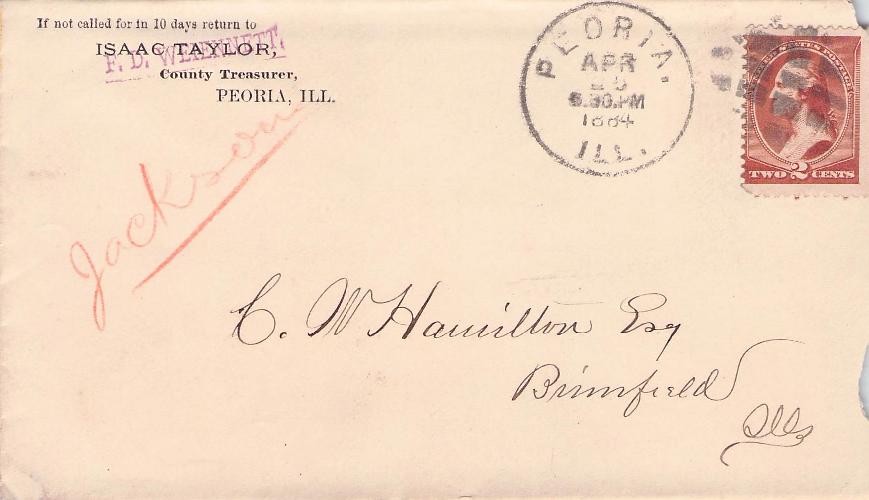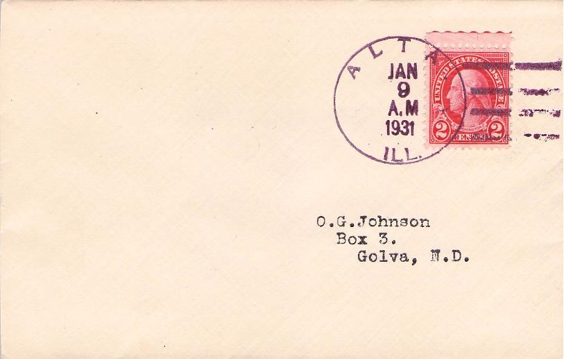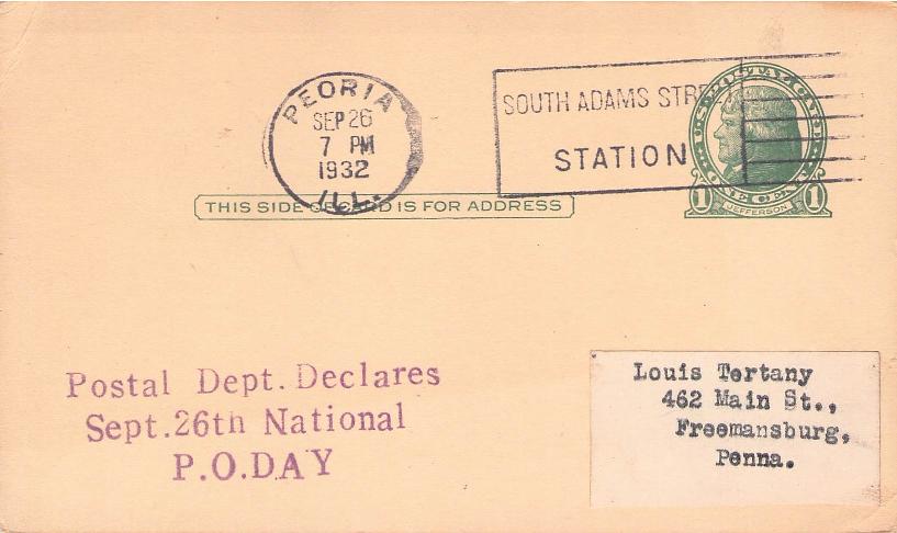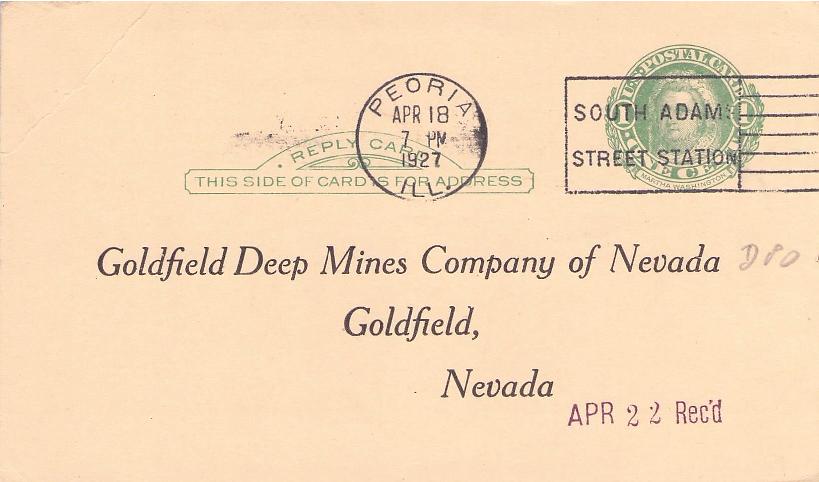 South Adams St. Sta. 1927 machine cancel on Postal Card, return card to Goldfield Deep Mines Co., Goldfield, Nev.; 1932 machine cancel on Postal Card; 193? machine cancel on cover cacheted for Peoria’s First Airmail, with 3¢ Postage Due stamp slapped over the postmark dial