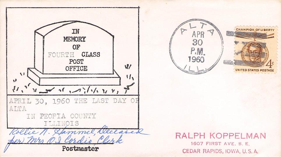 Alta 1914 4-bar on post card; 1931 4-bar on cover; 1960 non-standard 4-bar on LD cover, pm autograph