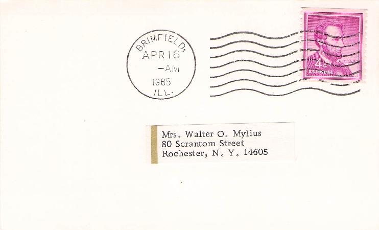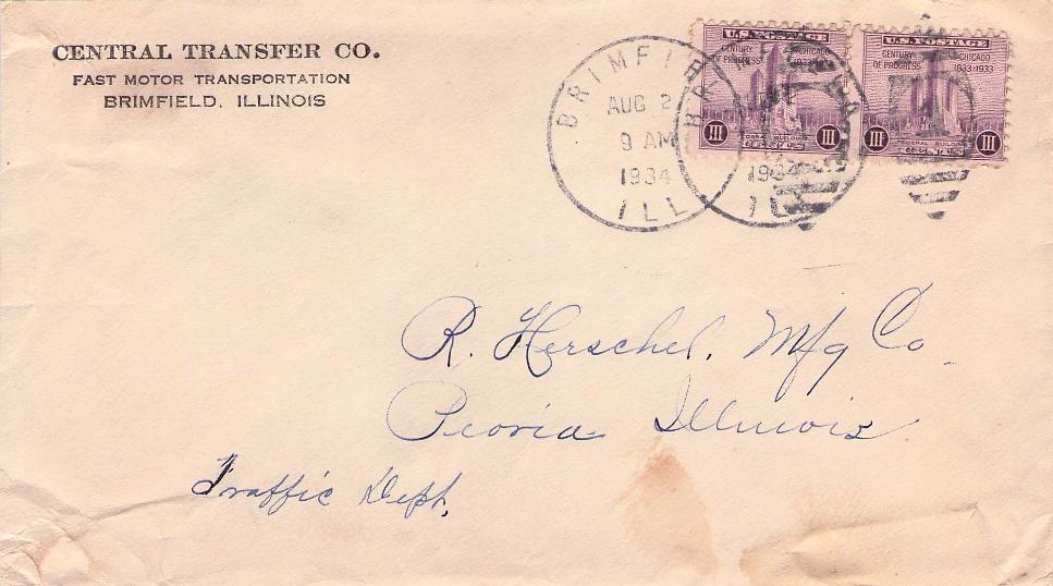 Brimfield 1934 duplex on cover, “Central Transfer Co.” corner; 1965 machine cancel on 3x5 card