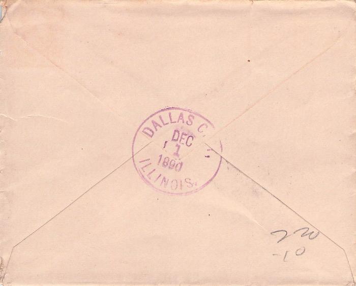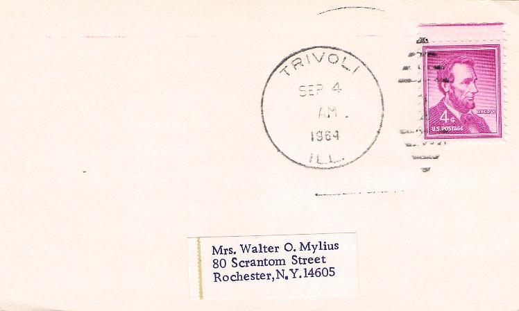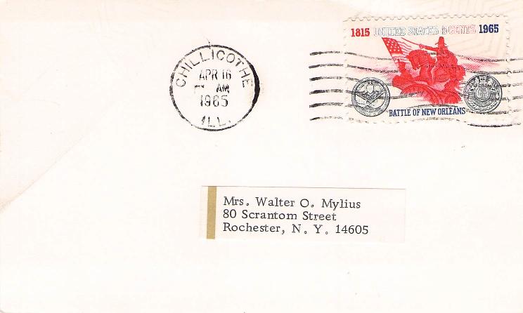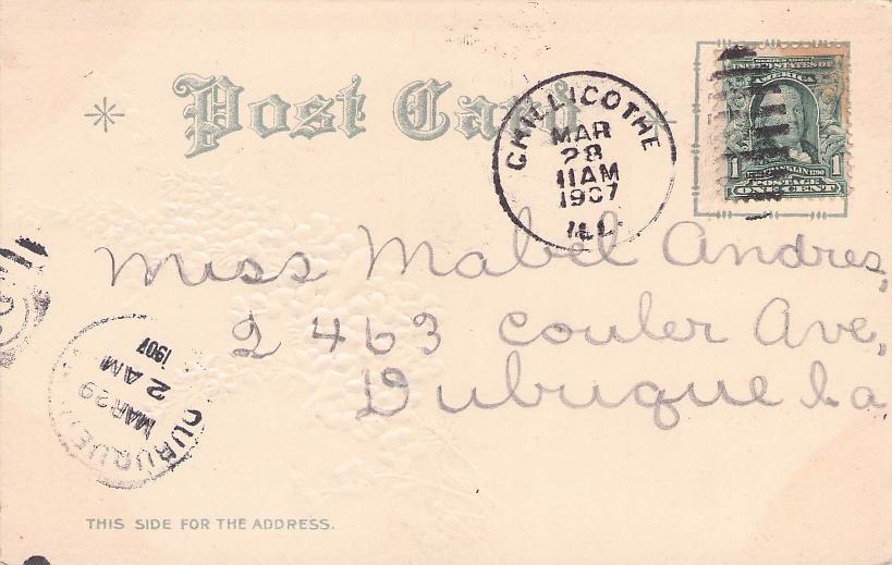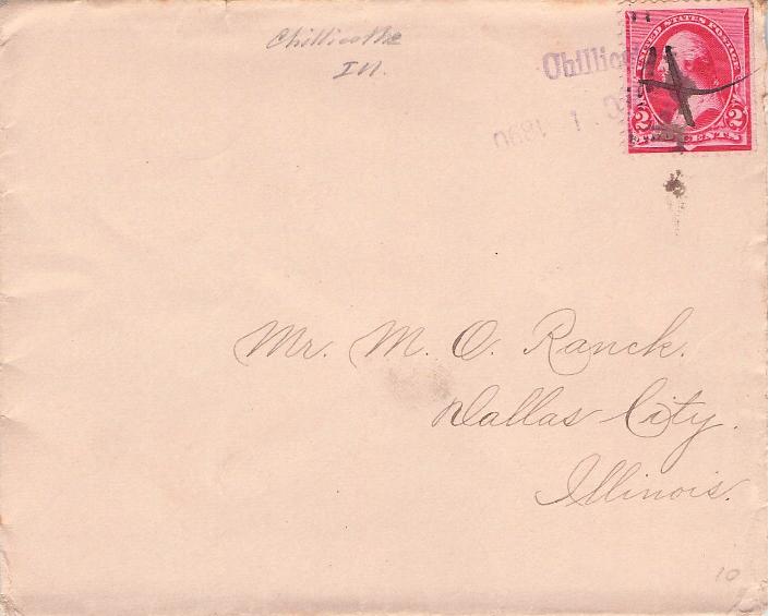 Chillicothe 1890 straight-line on cover, nice Dallas City, Ill. backstamp; 1907 duplex on post card, Dubuque recg. mark; 1965 machine cancel on 3x5 card