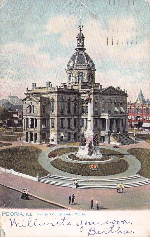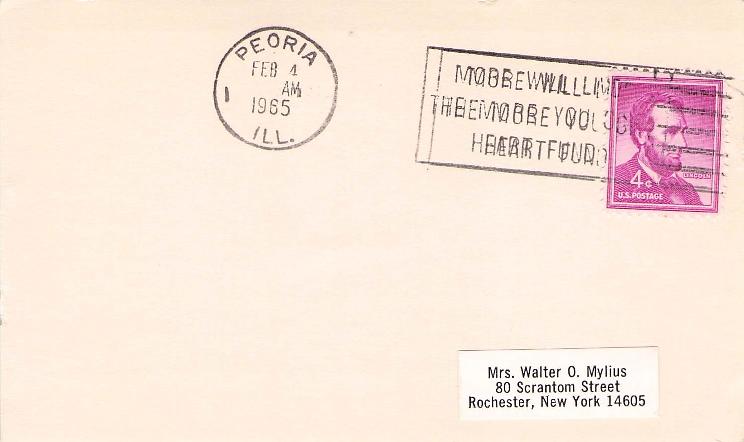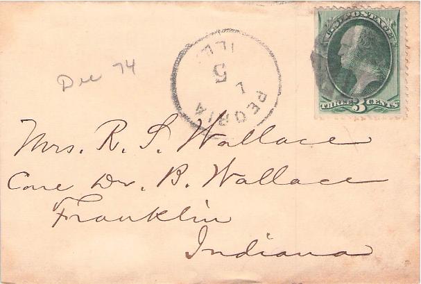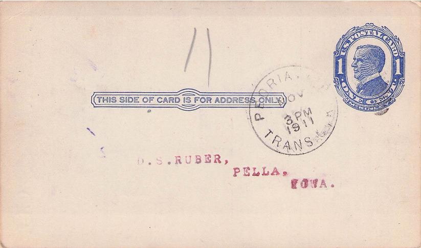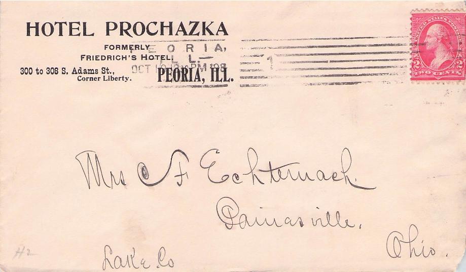 Peoria c.1880 cds upside-down on small cover; 1884 cds on cover, County Treasurer corner; 1897 machine cancel on cover; 1898 straight line machine cancel on cover, Hotel Prochazka corner; 19-- machine on post card; unreadable cds on illustrated cover for “The Transcript Co.” (newspaper); 1911 Peoria Transfer Clerk on Postal Card, back quotes grain prices; 1926 machine cancel on Postal Card; 1948 machine on cover, Underwood Electric corner; 1965 machine slogan double-struck on 3x5 card; July 4 1976 4-bar on cover.