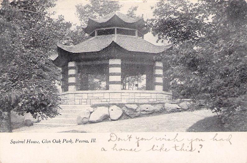 Hanna City 1907 4-bar on post card, view of Glen Oak Park Squirrel House