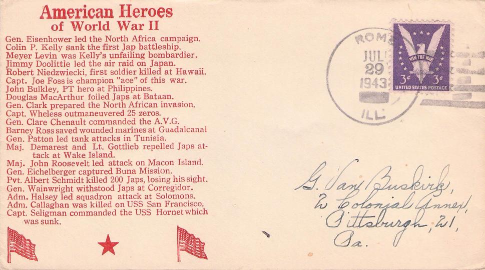 Rome 1912 4-bar on post card; 1943 4-bar on patriotic cover listing American Heroes; 1970 4-bar on cover