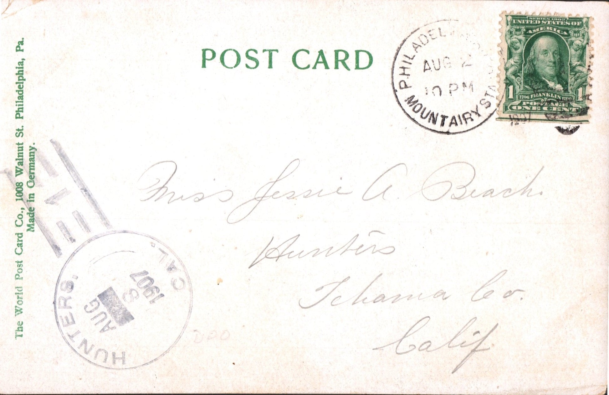 Mount Airy Sta. 1907 duplex on post card, also Hunters, Calif. (DPO) Doane as rec’d