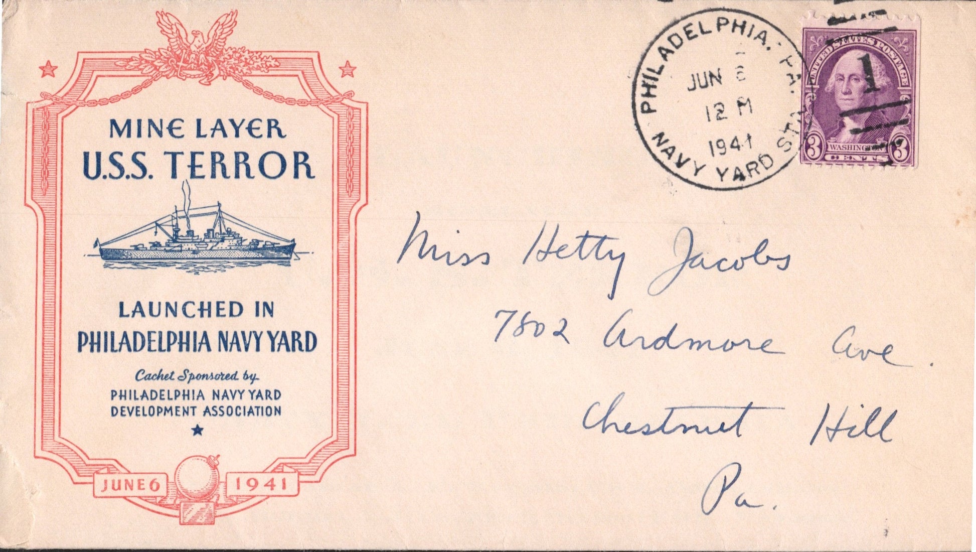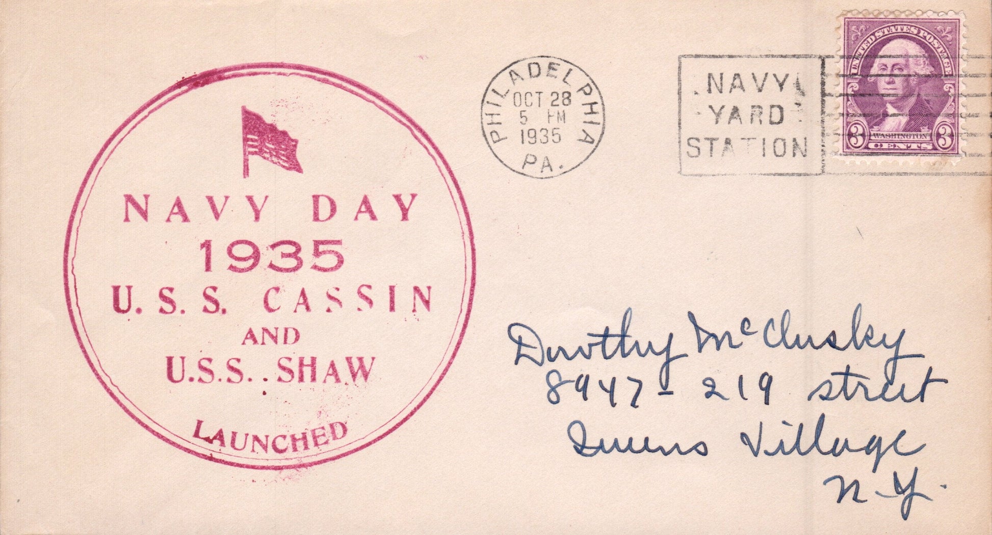 Navy Yard Sta. 1935 machine cancel on cover with cachet “Navy Day 1935 U.S.S. Cassin and U.S.S. Shaw Launched”; 1941 duplex on cover with cachet “Mine Layer U.S.S. Terror Launched”