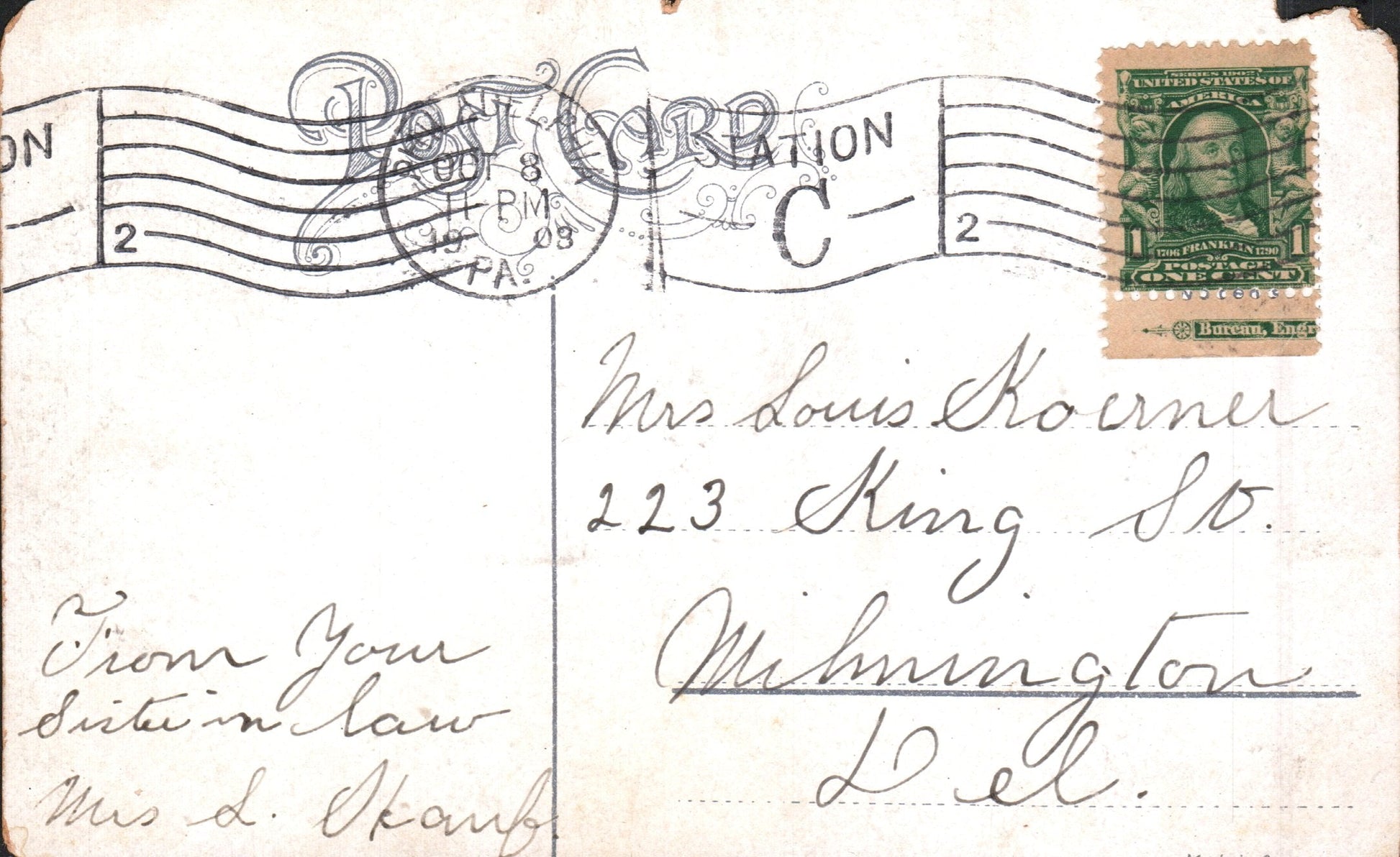Fairhill Sta. 1909 Flag cancel on post card, also Kintersville PA Flag cancel