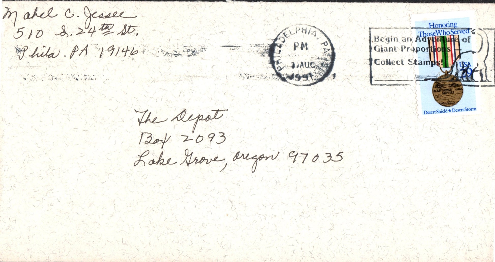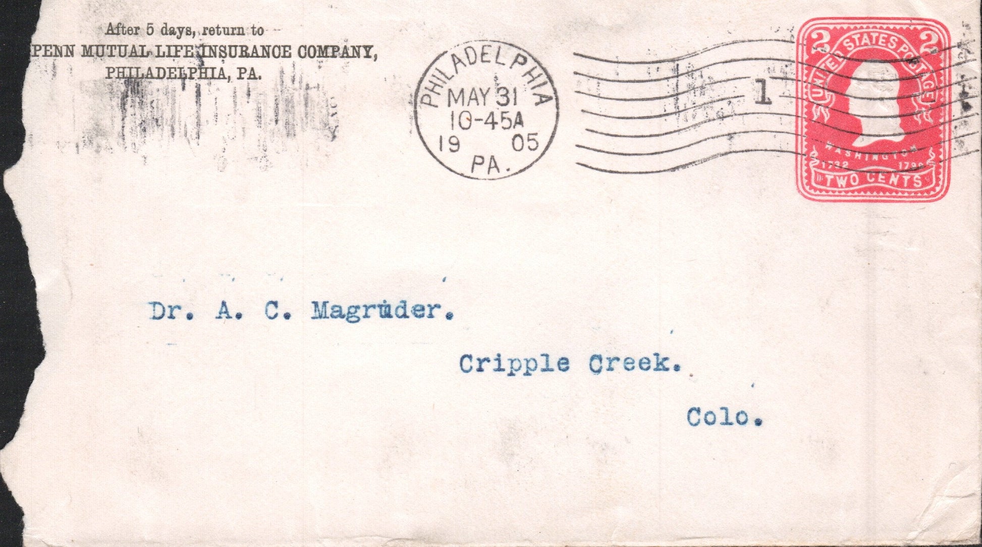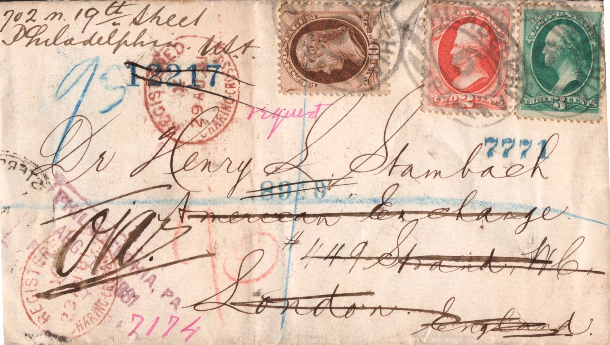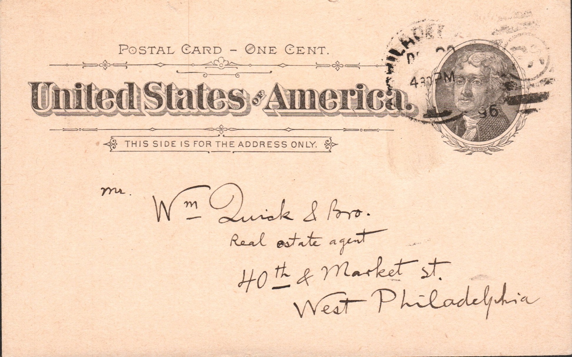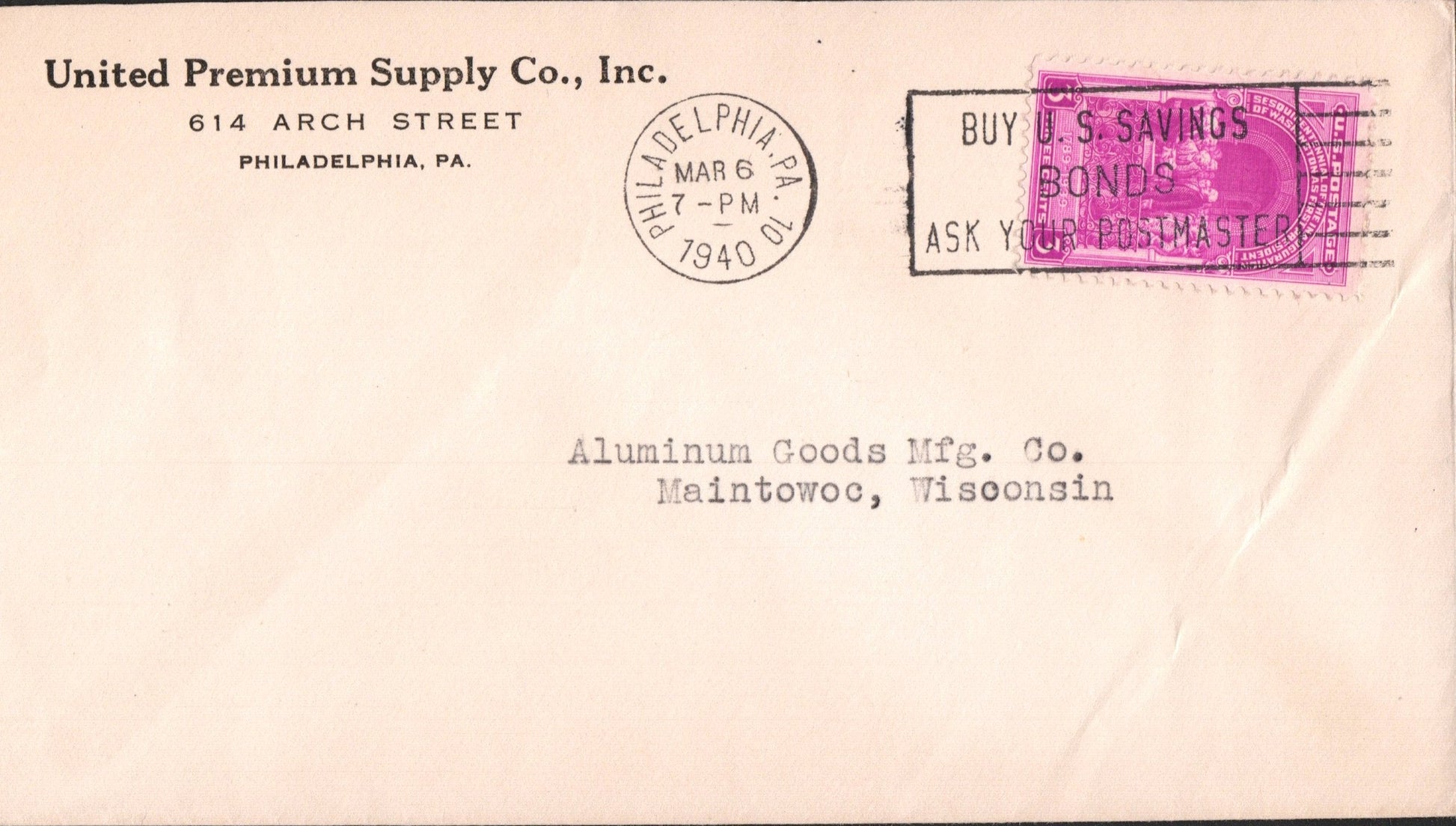 Philadelphia 1881 VERY BUSY registered cover to New York with markings front & back including a clear Philadelphia oval; poor 1881 duplex on cover, “Titus Bros. Carpet Dealers” corner, original contents; 1896 duplex on Postal Card; 1898 duplex on great cover, corner “George W. Jenkins, (P)ure Confections by Steam Power” and “Finest Pure Marsh Mallows” on back; 1900 machine cancel on cover 1905 Flag cancel on cover, “Penn Mutual Life Insurance Co. corner, Cripple Creek, Colo. backstamp; 1916 machine slogan to buy bonds on Postal Card; 1932 duplex on cover, 9¢ stamp; 1937 machine FD of Issue 3¢ Constitution Sesquicentennial stamp on cover; 1940 machine slogan “Buy U.S. Savings Bonds Ask Your Postmaster” on cover, “United Premium Supply Co.” corner; 1940 machine slogan “Air Mail Saves Time” on post card; 1970 machine cancel over Philadelphia meter on cover, “Victor Dye Works” corner; 1971 machine slogan “Always Use Zip Code” on cover 1973 FD of issue of 8¢ “Love” stamp on cover with a hole where a medallion should be; 1976 fancy cancel of Ben Franklin’s signature on cacheted cover, 200 years of postal service; 1991 machine cancel on cover