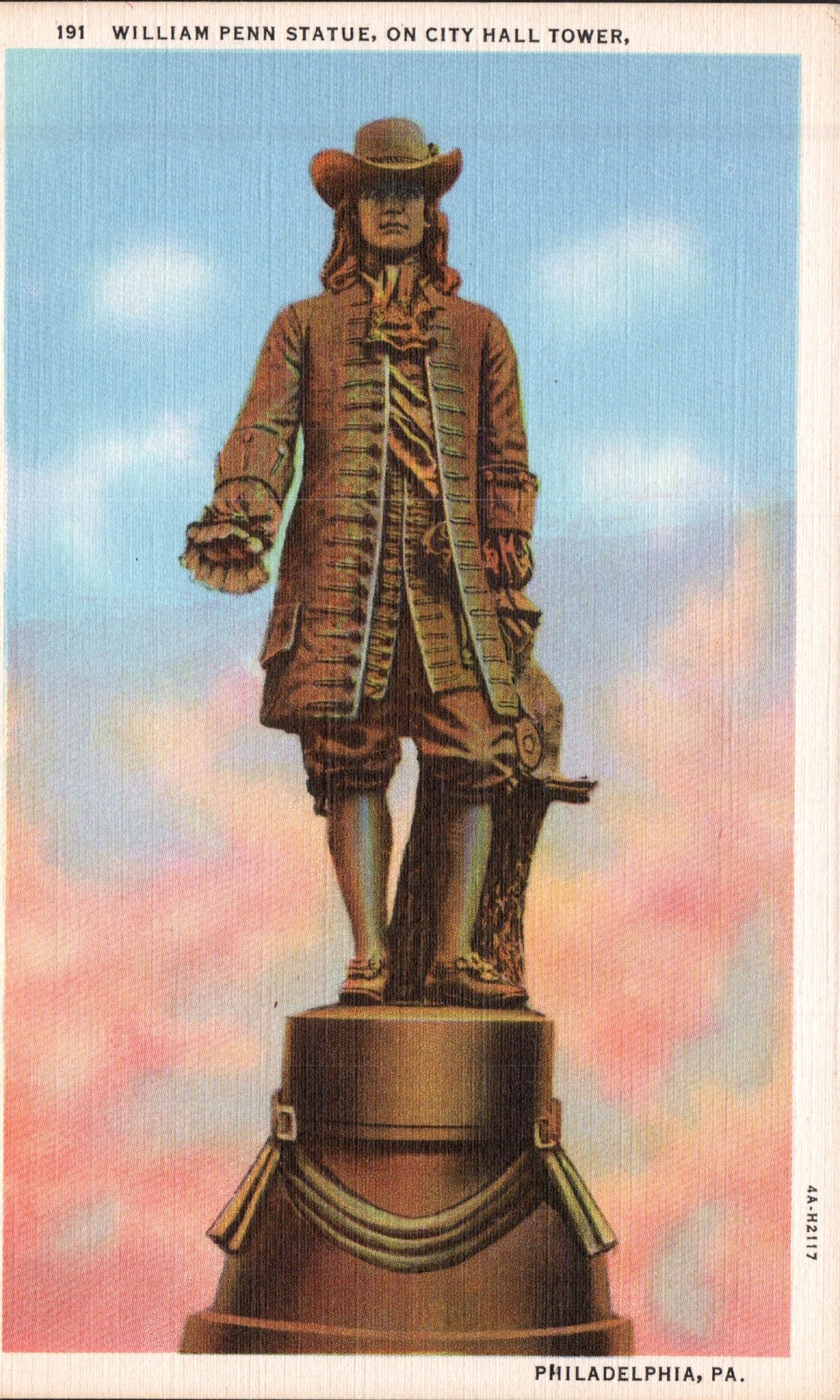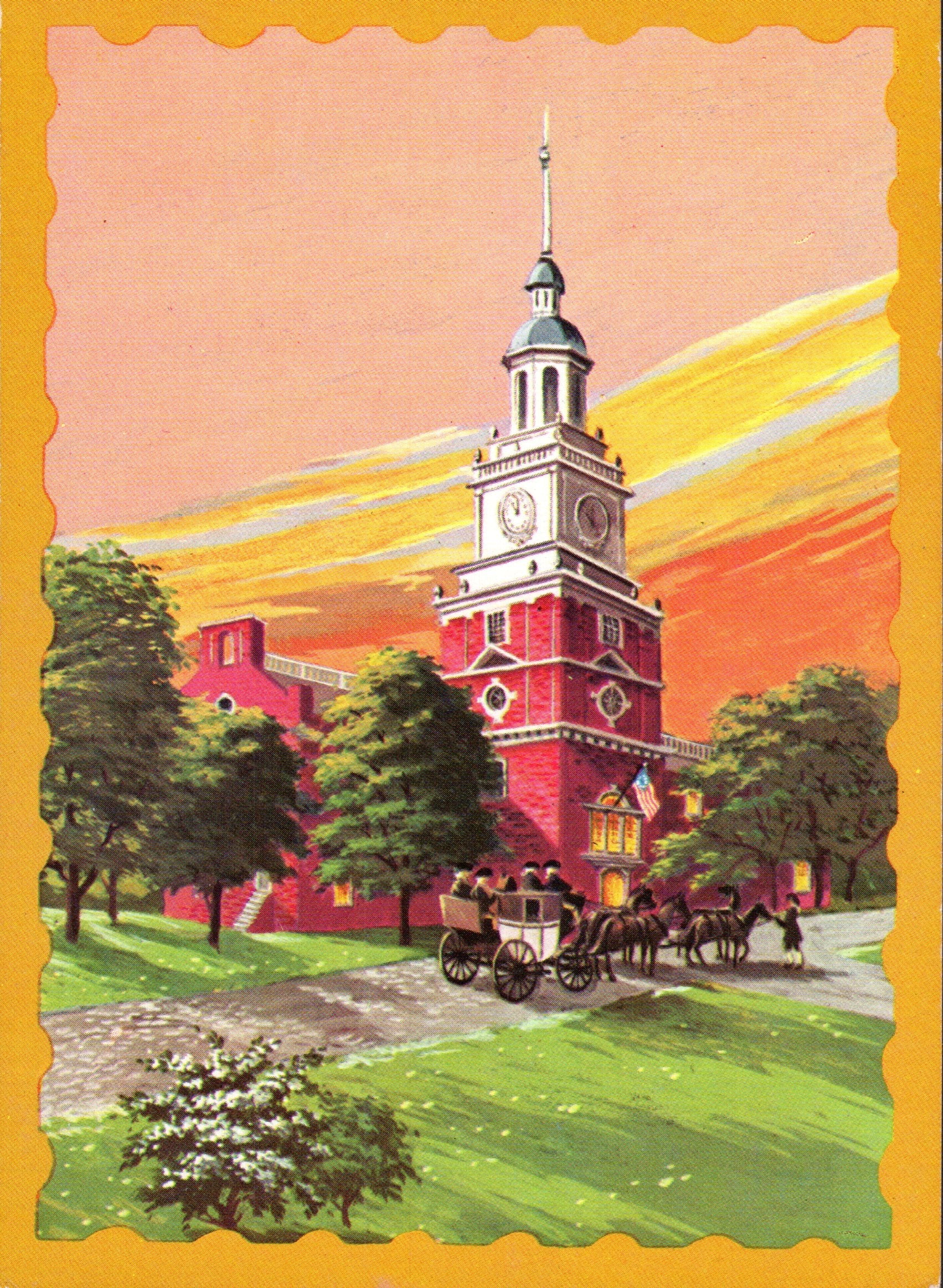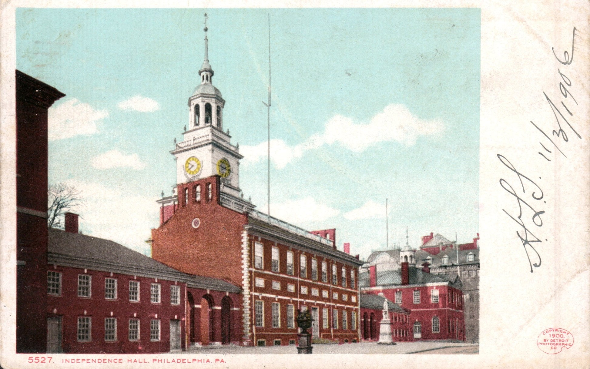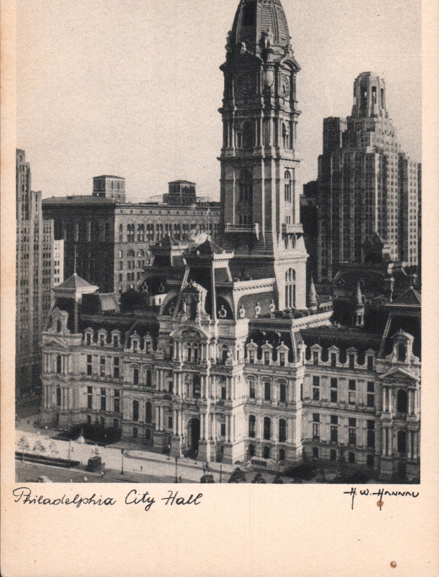 Post cards: “Broad Street North from Spruce” (B&W. corner damage; “Fidelity-Philadelphia Trust” art work [linen]; “Newspaper Building (B&W); “Bellevue Stratford Hotel” [2 views, 1906, c.1910]; Bookbinder’s Restaurant dining room [chrome]; Post office [linen]; City Hall [2views, 1916 and B&W];Wm. Penn statue atop City Hall [2 linen views]; Independence Hall [8 exterior views, 7 interior or thematic]; “Congress Hall” [linen]; “Public Library” [linen]; “Museum of Art” [3 views]; “Rodin Museum” [2 linen views]; “Drexel Institute of Technology” [linen]; Girard College” [3 early views]; “Cornwall Hall Temple University” [linen]; Temple University Hospital” [sepia]; Christ Church” [5 views]; “St. John’s Church” art [chrome]; “St. Peter’s and St. Paul’s Cathedral” [line ]; “Mouth of the Schuylkill River” [c.1910]; “Boat Houses, Schuylkill River” [c.1910]; “Elfreth’s Alley” [3 chrome views]; Betsy Ross