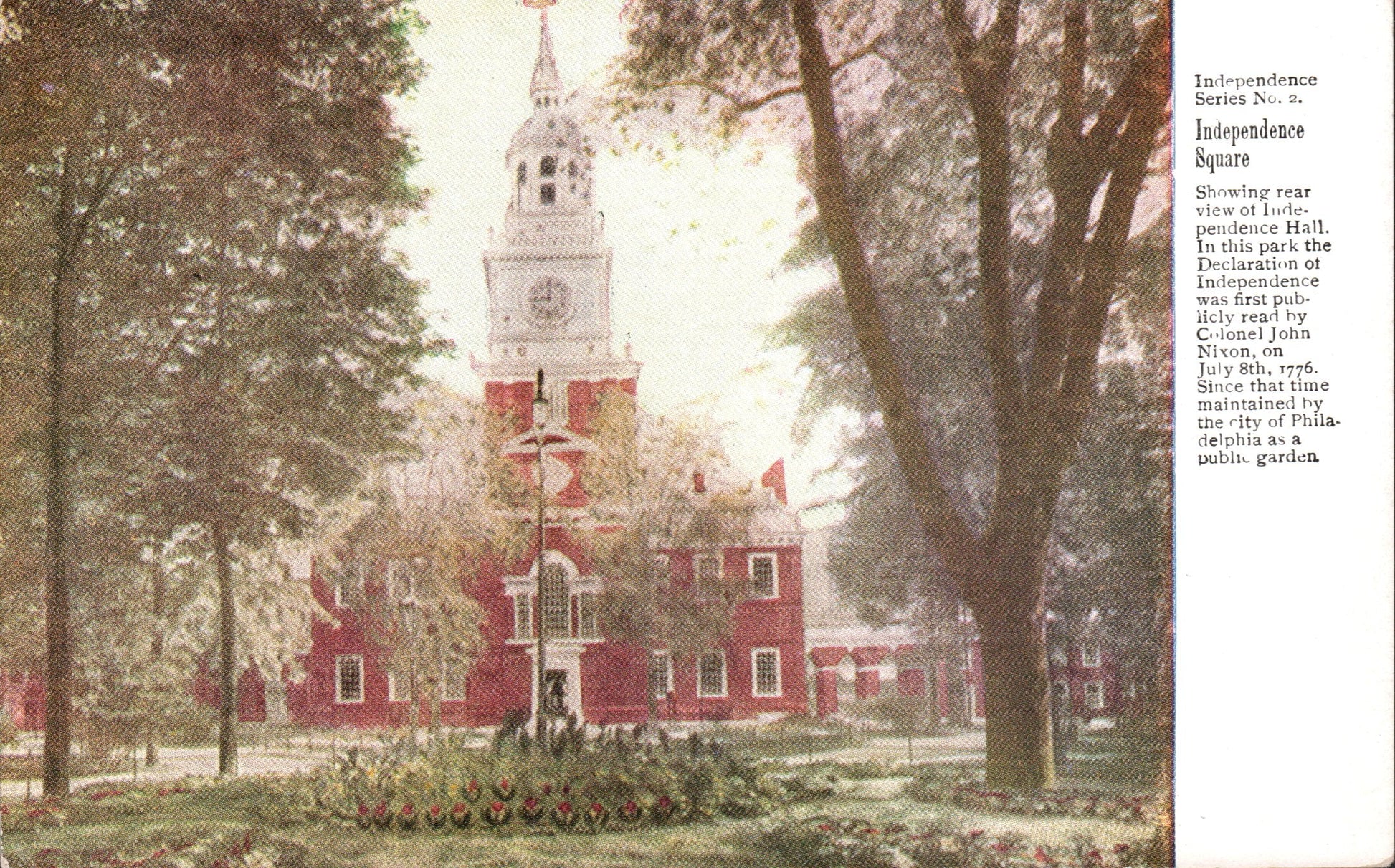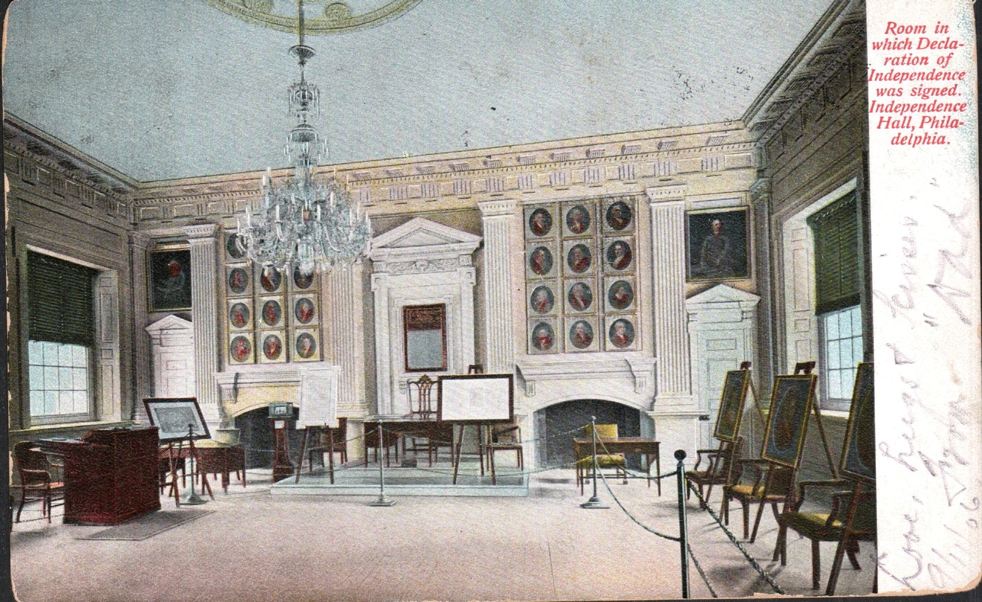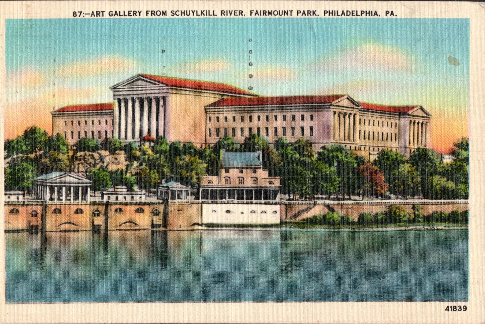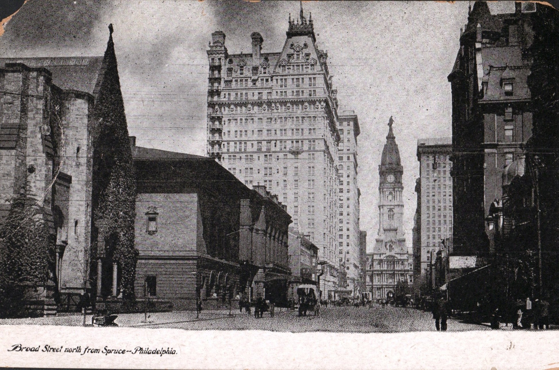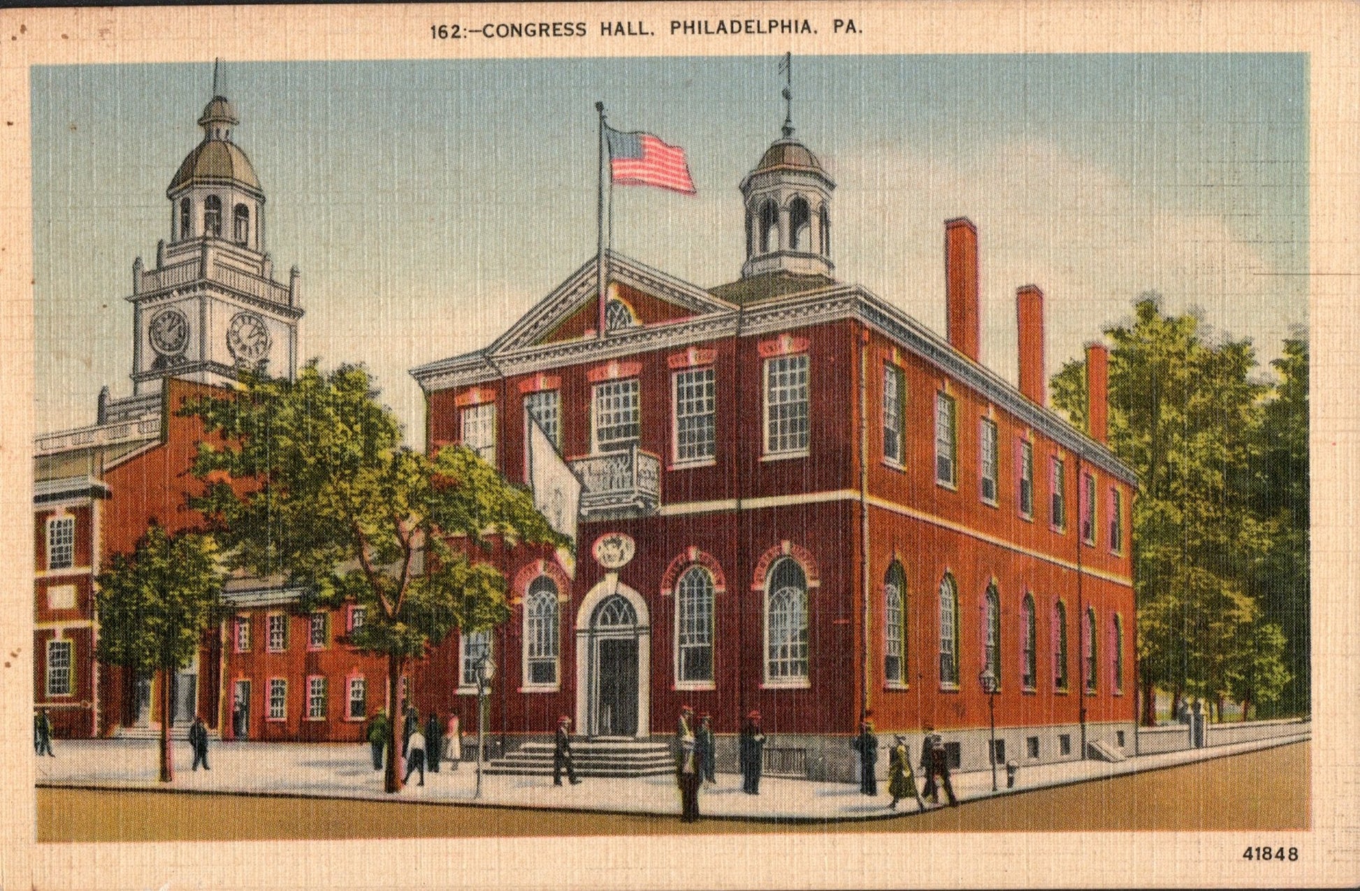 Post cards: “Broad Street North from Spruce” (B&W. corner damage; “Fidelity-Philadelphia Trust” art work [linen]; “Newspaper Building (B&W); “Bellevue Stratford Hotel” [2 views, 1906, c.1910]; Bookbinder’s Restaurant dining room [chrome]; Post office [linen]; City Hall [2views, 1916 and B&W];Wm. Penn statue atop City Hall [2 linen views]; Independence Hall [8 exterior views, 7 interior or thematic]; “Congress Hall” [linen]; “Public Library” [linen]; “Museum of Art” [3 views]; “Rodin Museum” [2 linen views]; “Drexel Institute of Technology” [linen]; Girard College” [3 early views]; “Cornwall Hall Temple University” [linen]; Temple University Hospital” [sepia]; Christ Church” [5 views]; “St. John’s Church” art [chrome]; “St. Peter’s and St. Paul’s Cathedral” [line ]; “Mouth of the Schuylkill River” [c.1910]; “Boat Houses, Schuylkill River” [c.1910]; “Elfreth’s Alley” [3 chrome views]; Betsy Ross