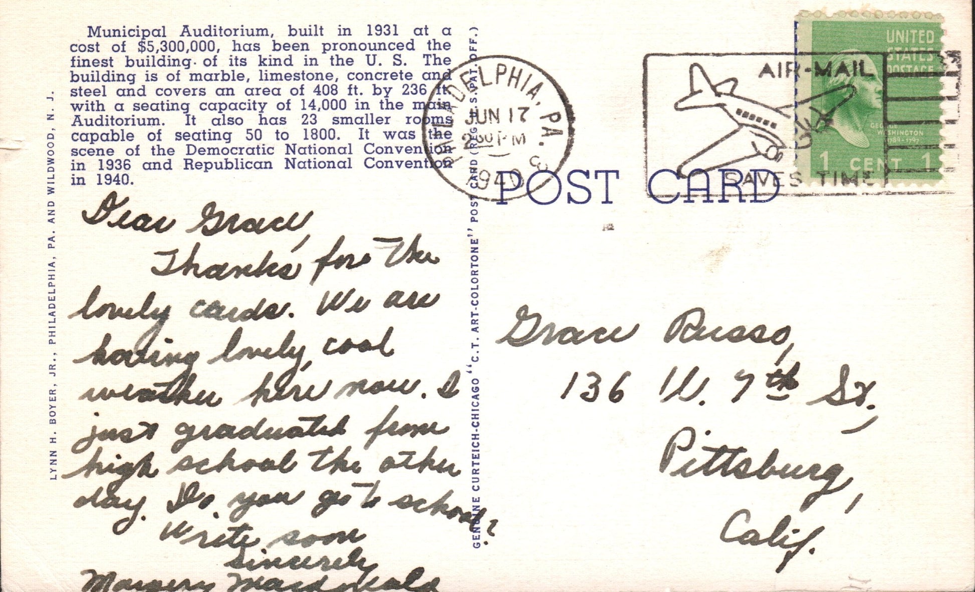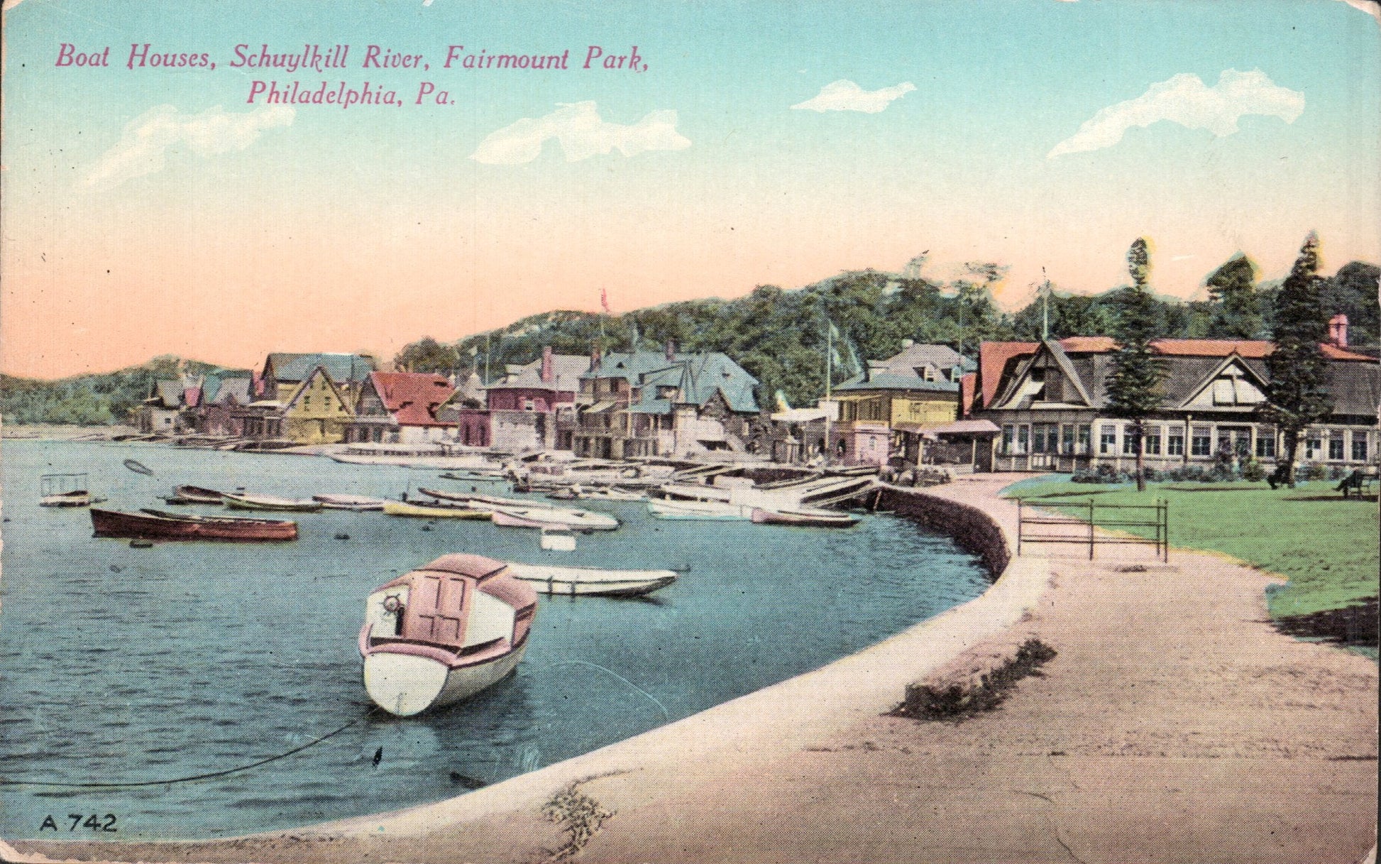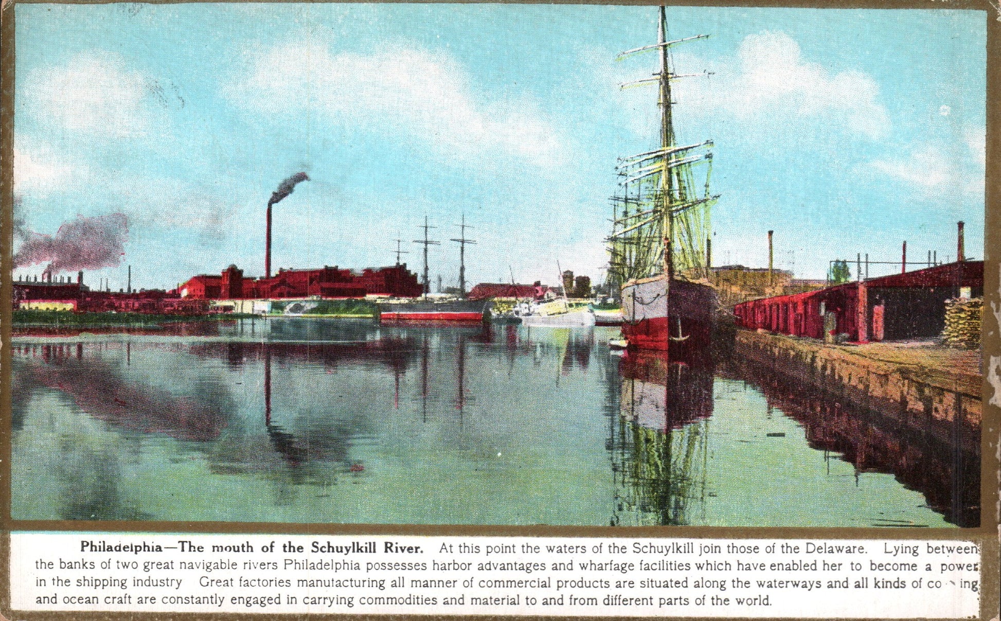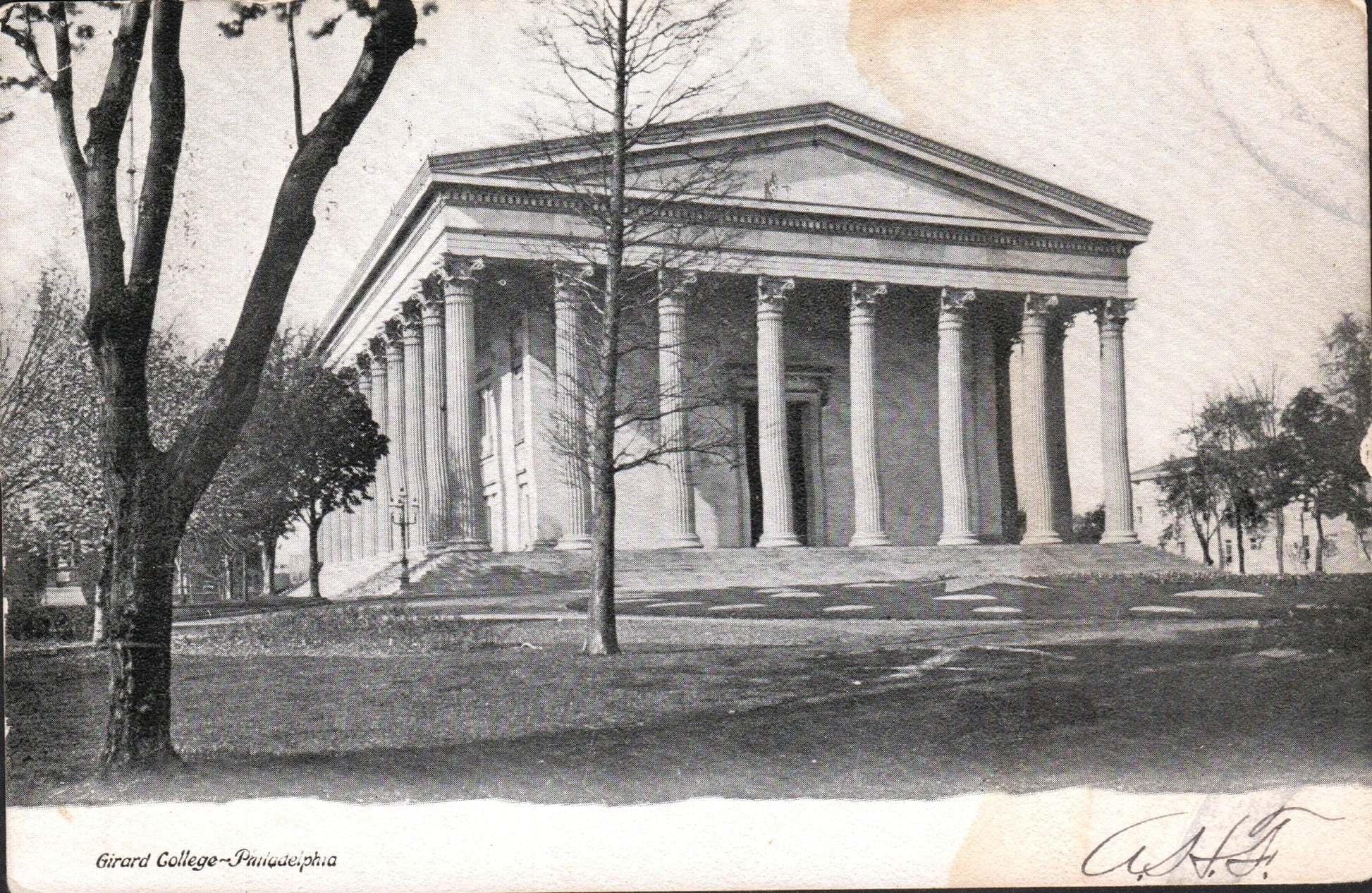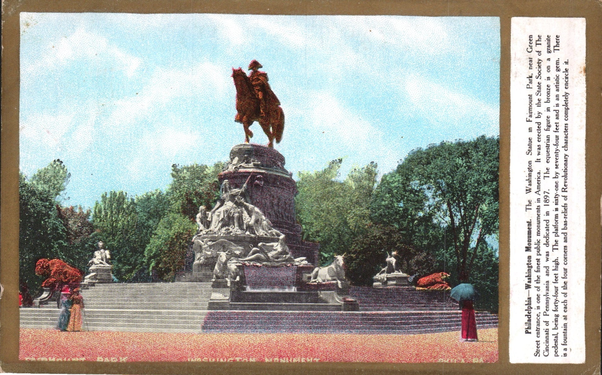 Post cards: “Broad Street North from Spruce” (B&W. corner damage; “Fidelity-Philadelphia Trust” art work [linen]; “Newspaper Building (B&W); “Bellevue Stratford Hotel” [2 views, 1906, c.1910]; Bookbinder’s Restaurant dining room [chrome]; Post office [linen]; City Hall [2views, 1916 and B&W];Wm. Penn statue atop City Hall [2 linen views]; Independence Hall [8 exterior views, 7 interior or thematic]; “Congress Hall” [linen]; “Public Library” [linen]; “Museum of Art” [3 views]; “Rodin Museum” [2 linen views]; “Drexel Institute of Technology” [linen]; Girard College” [3 early views]; “Cornwall Hall Temple University” [linen]; Temple University Hospital” [sepia]; Christ Church” [5 views]; “St. John’s Church” art [chrome]; “St. Peter’s and St. Paul’s Cathedral” [line ]; “Mouth of the Schuylkill River” [c.1910]; “Boat Houses, Schuylkill River” [c.1910]; “Elfreth’s Alley” [3 chrome views]; Betsy Ross