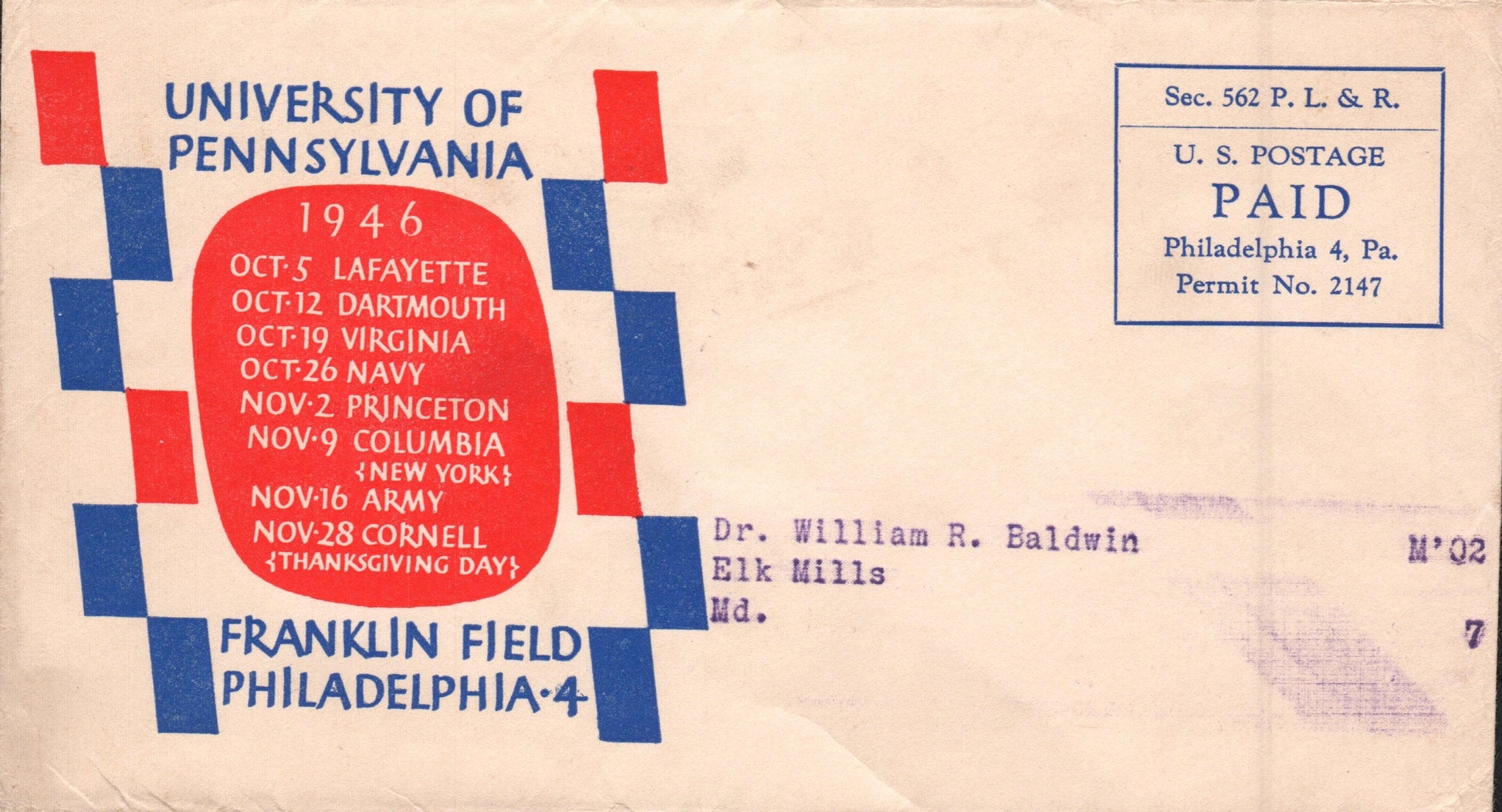 Unpostmarked Postage Paid cover with cachet showing 1946 U. of Pennsylvania football schedule, Elk Mills Md backstamp