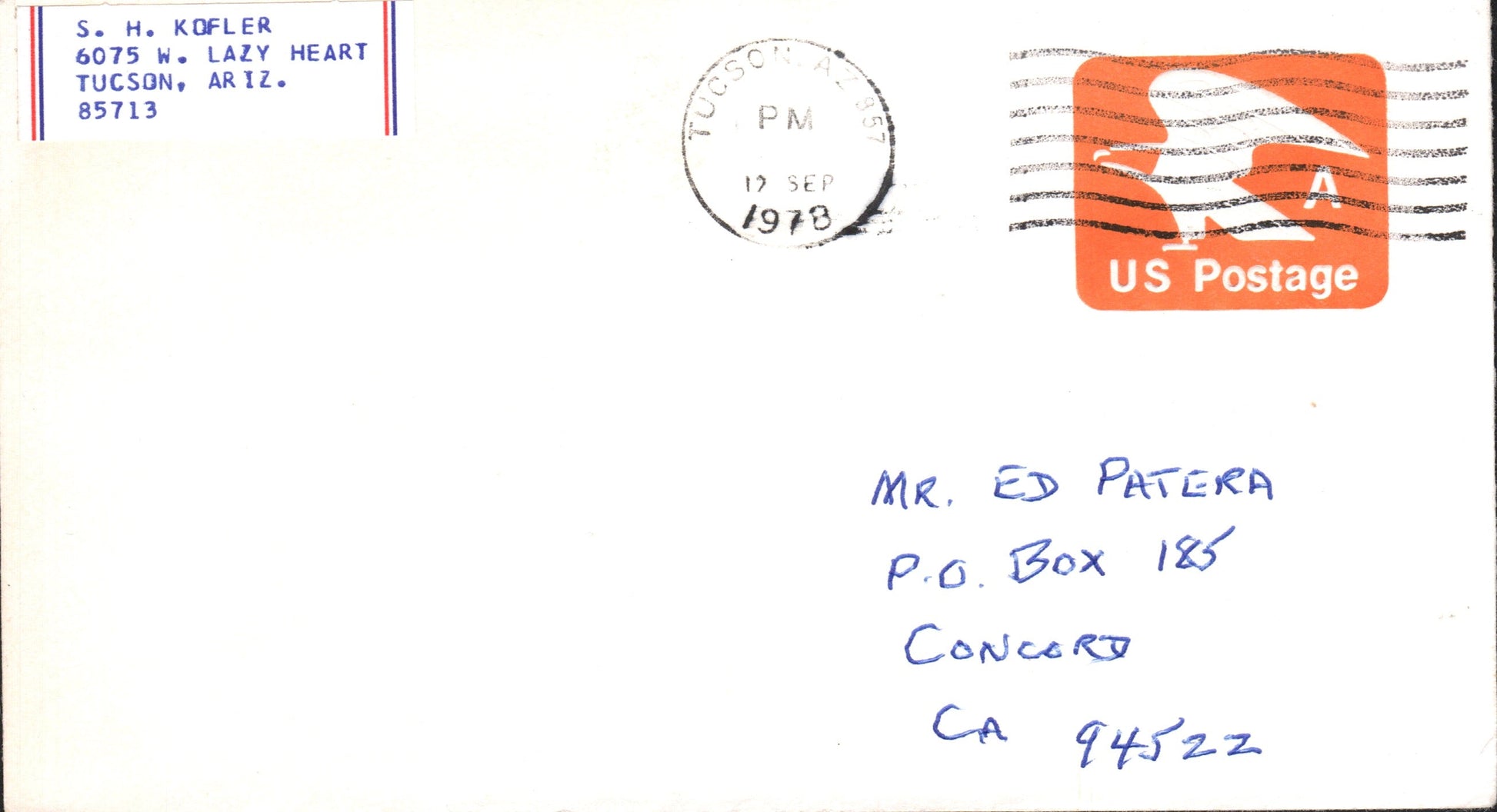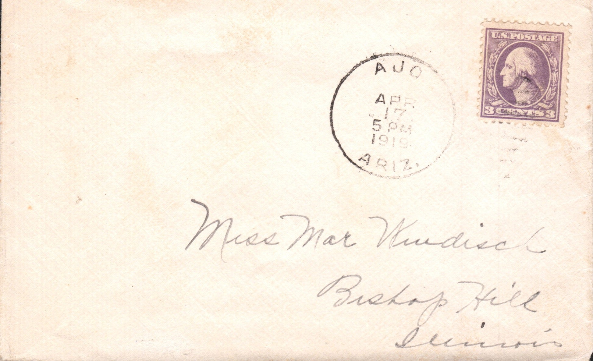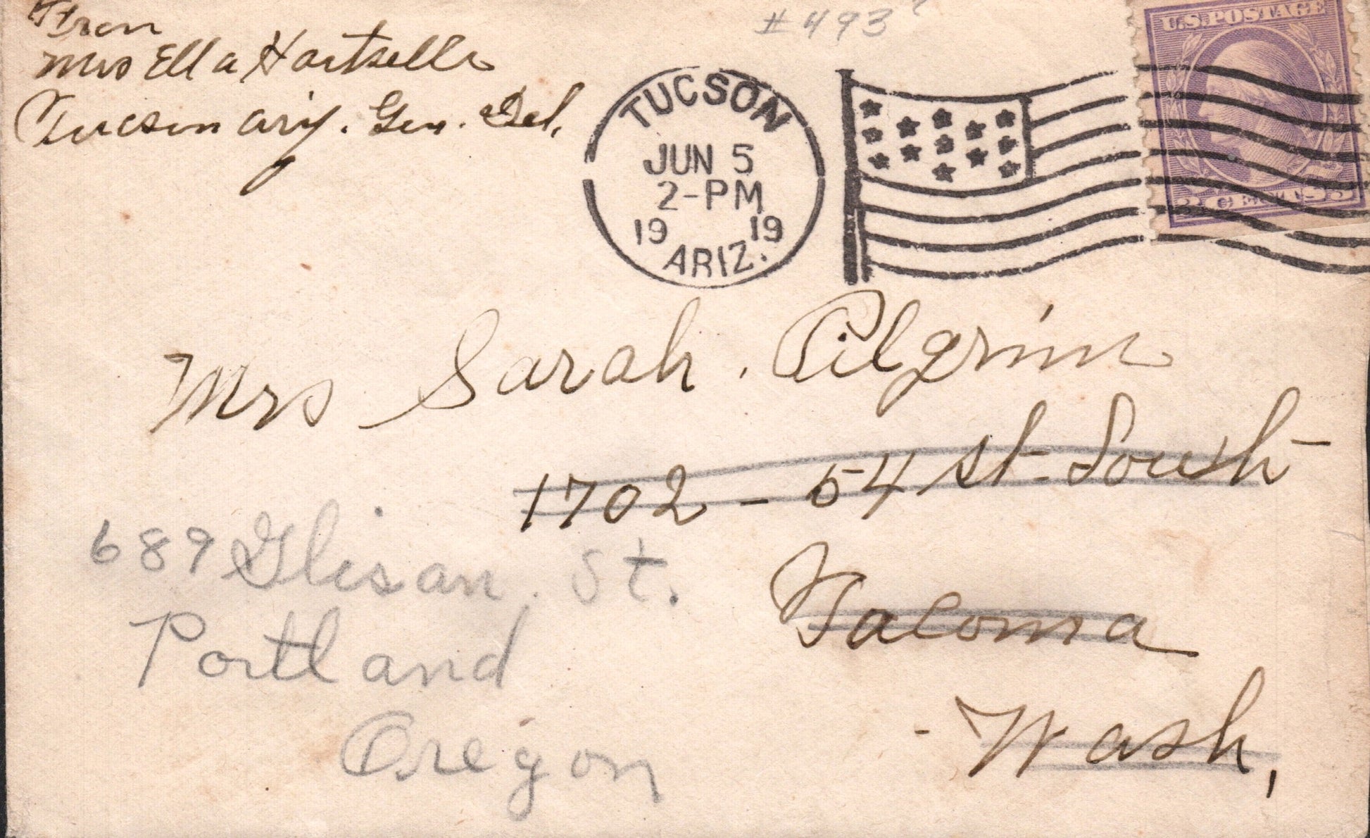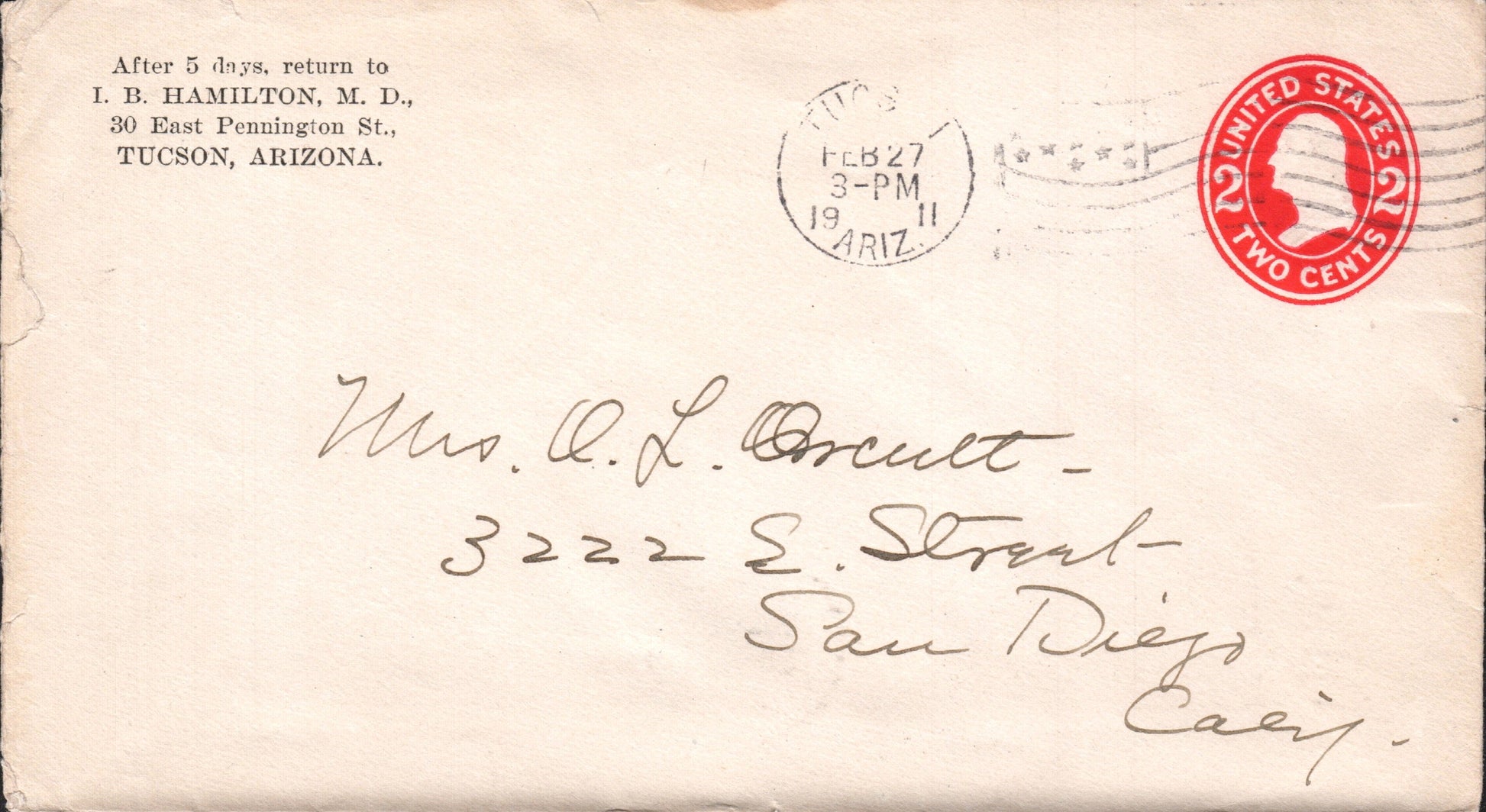 Tucson light 1911 Flag cancel (Territorial) on cover; bold 1919 Flag cancel on cover; 1932 machine cancel on cover, corner shows change of ownership of Garage; x,1950 double circle on 3x5 card; 1978 machine cancel on cover
