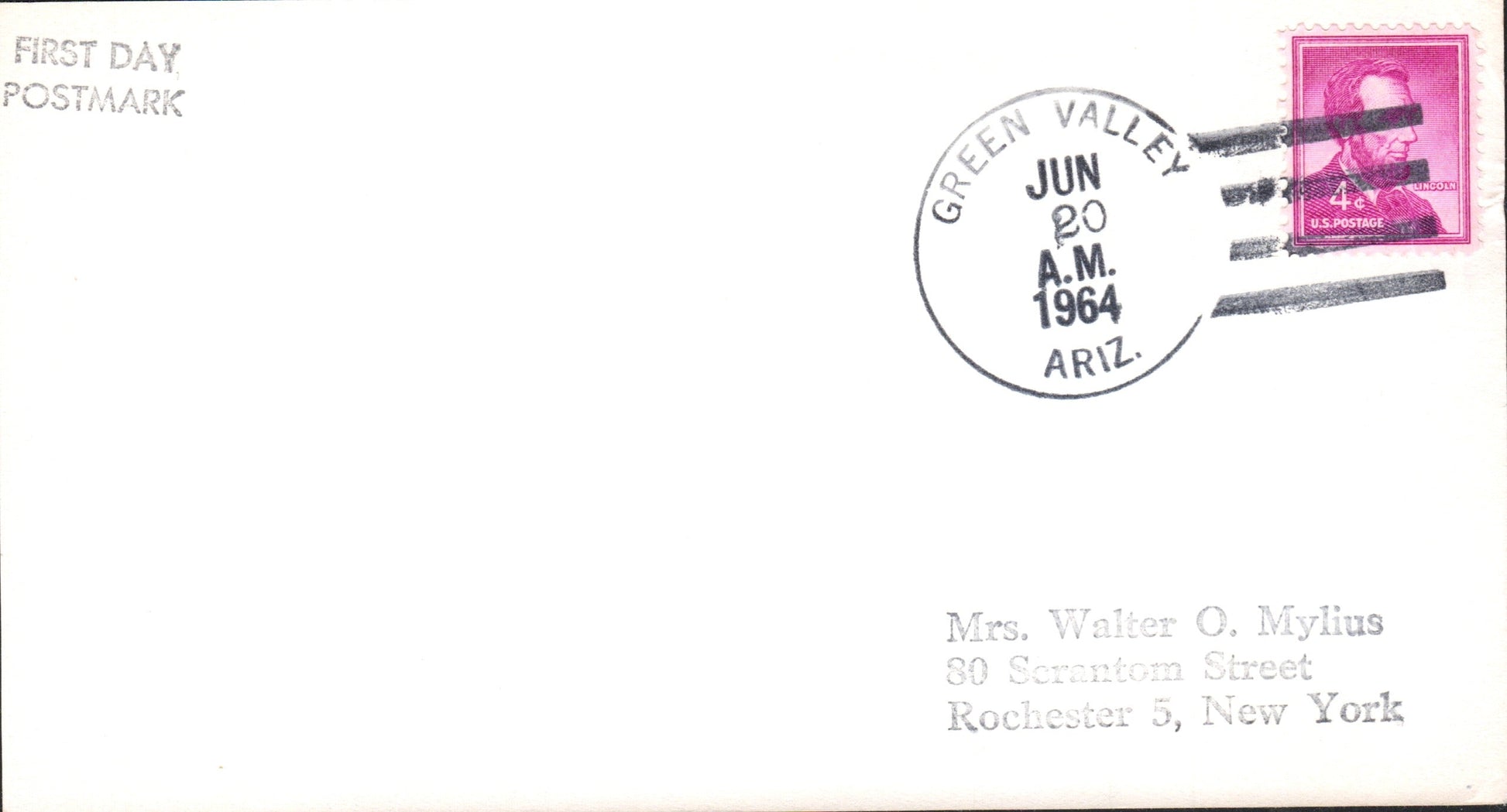 Green Valley 1964 4-bar on FD cover-sized card, PM autograph on back