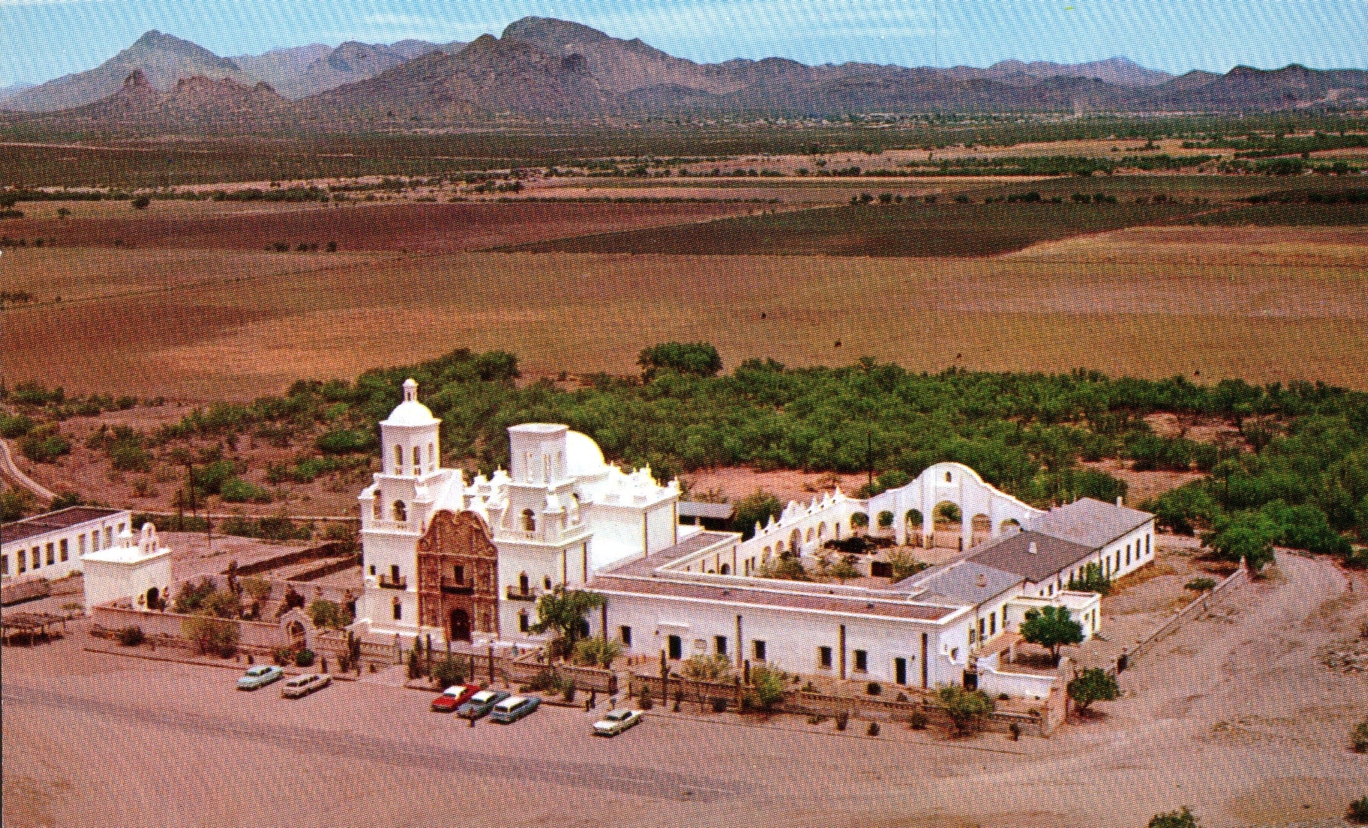 San Xavier del Bac Post card: Aerial view of mission [chrome]