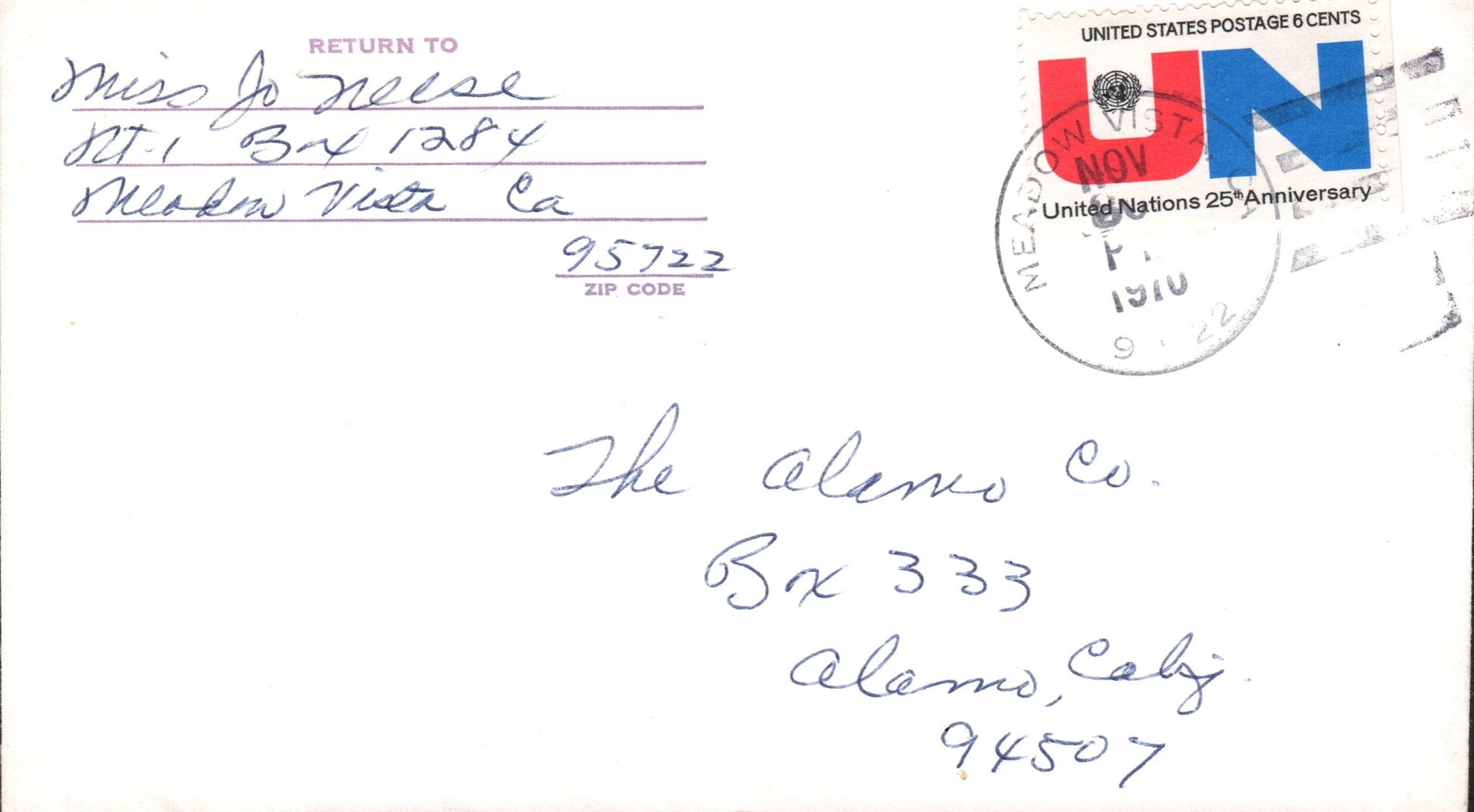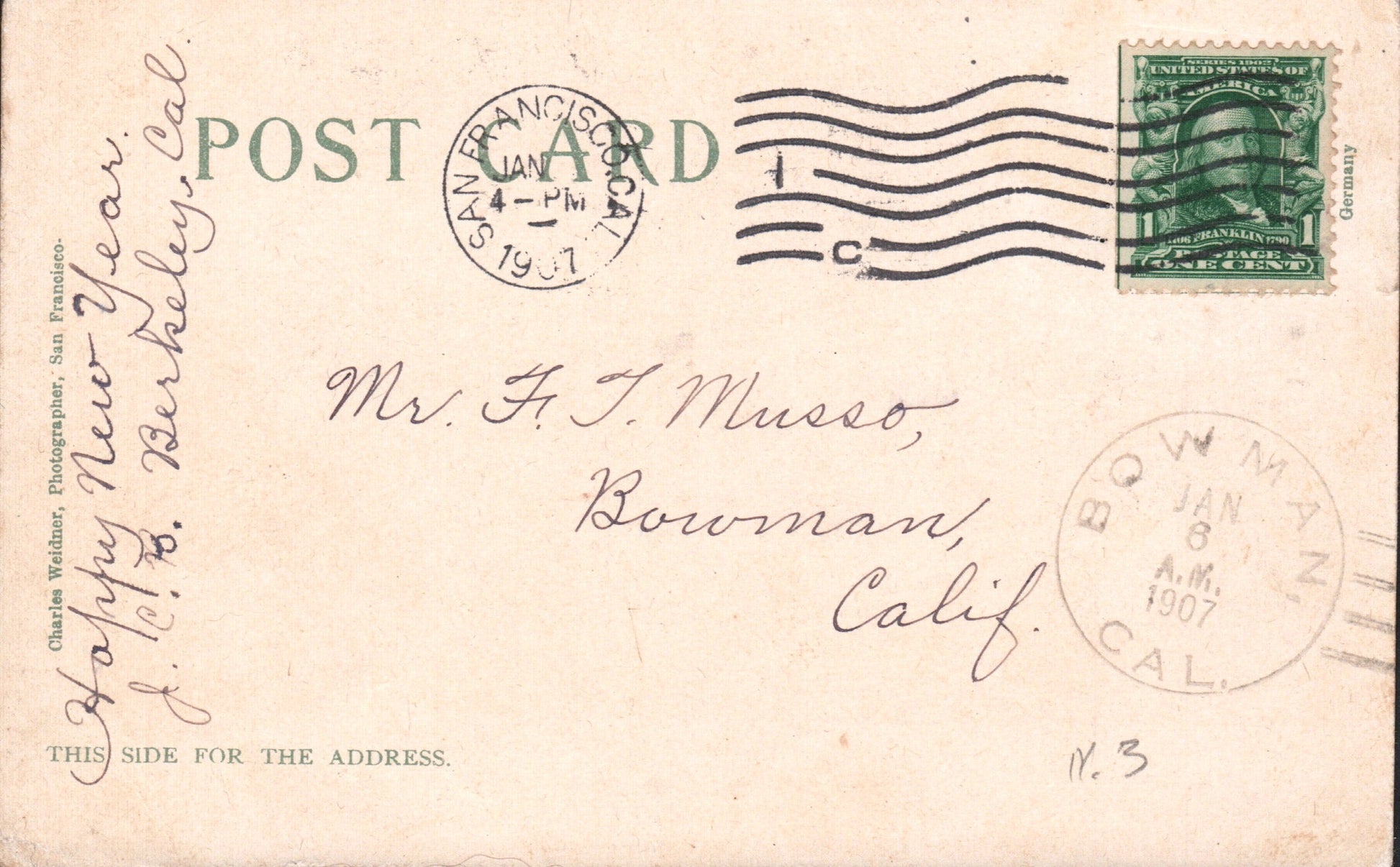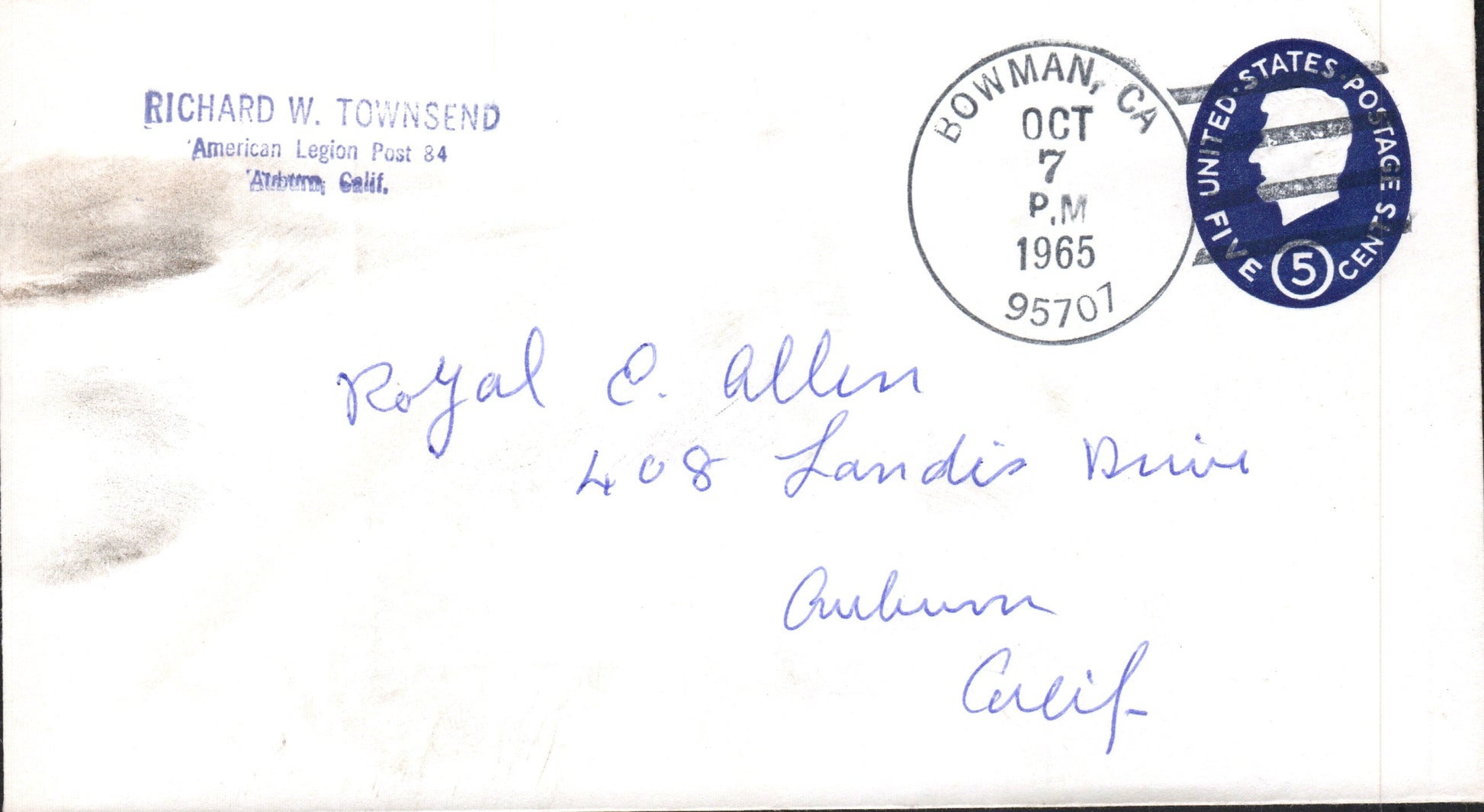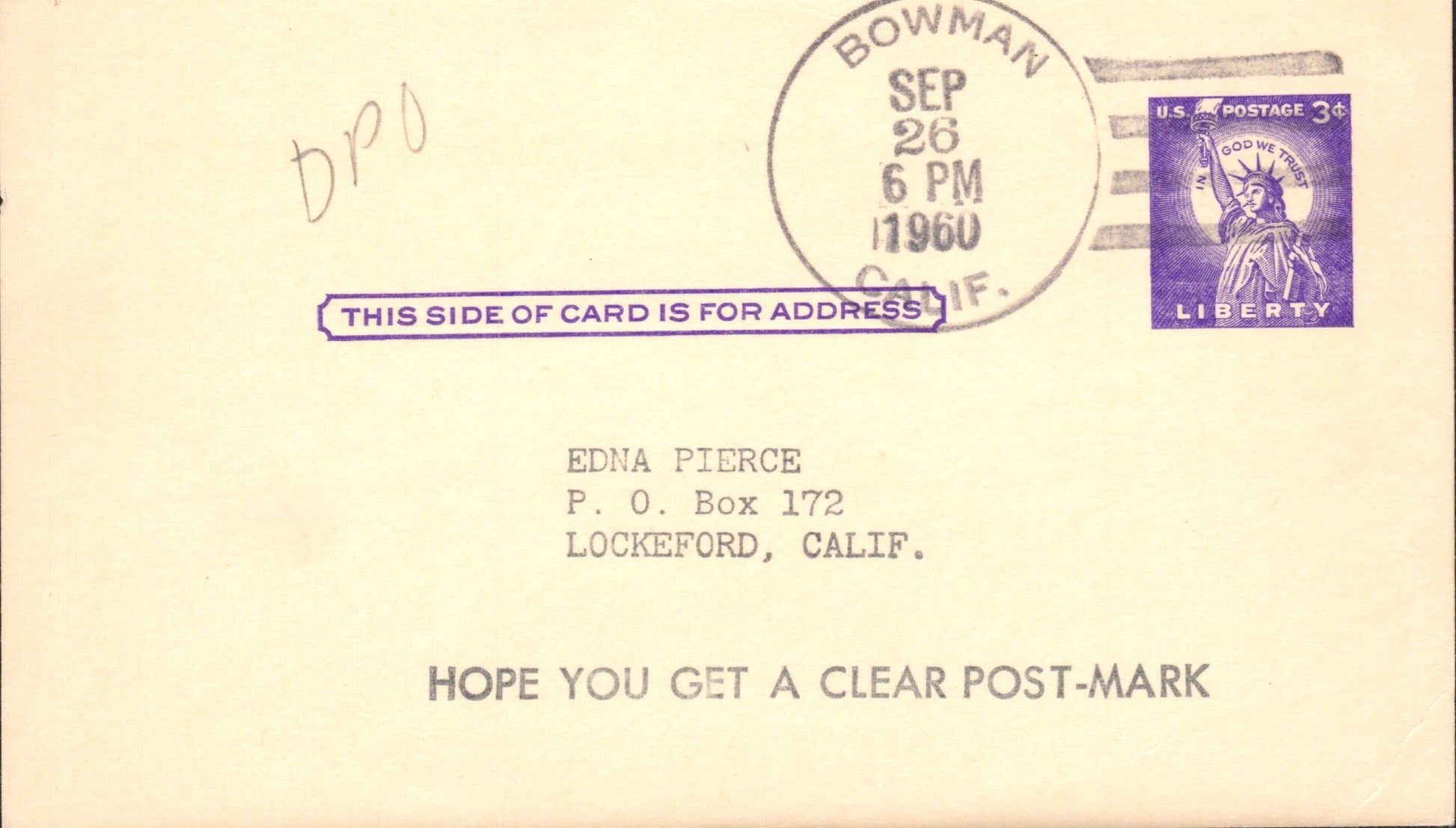 - Bowman 1907 probable Doane as rec’g mark on post card from San Francisco; 1960 4-bar on Postal Card; 1965 4-bar on cover