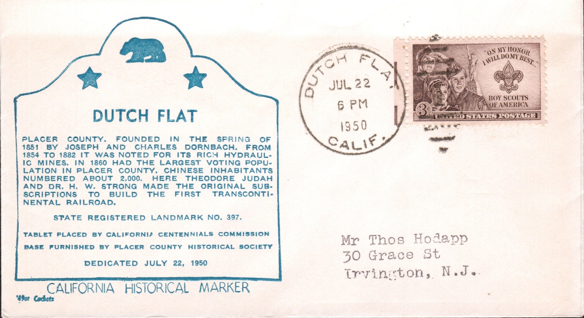 - Dutch Flat 1908 4-bar (5-bar?) on post card; 1950 duplex on cacheted cover, Historical marker