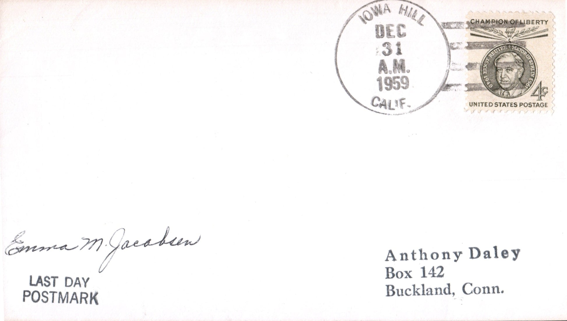 - Iowa Hill (1901-1959) 1912 4-bar on post card; 1959 4-bar on LD cover, PM autograph
