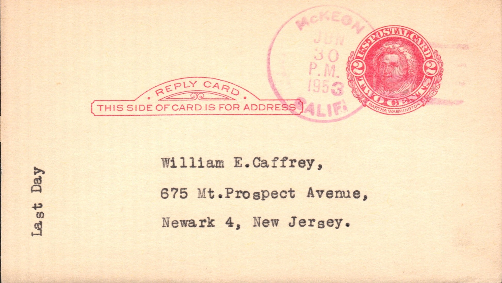 - McKeon (1920-1953) 1953 purple 4-bar on LD Postal Card