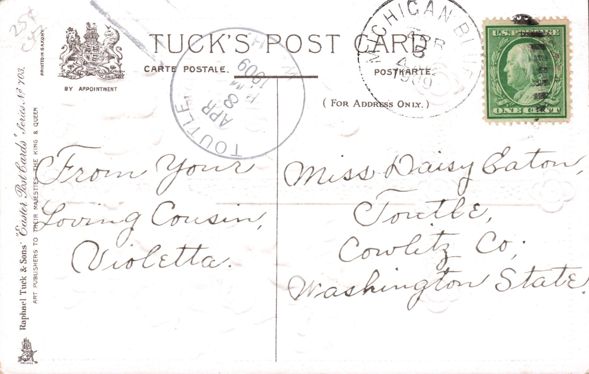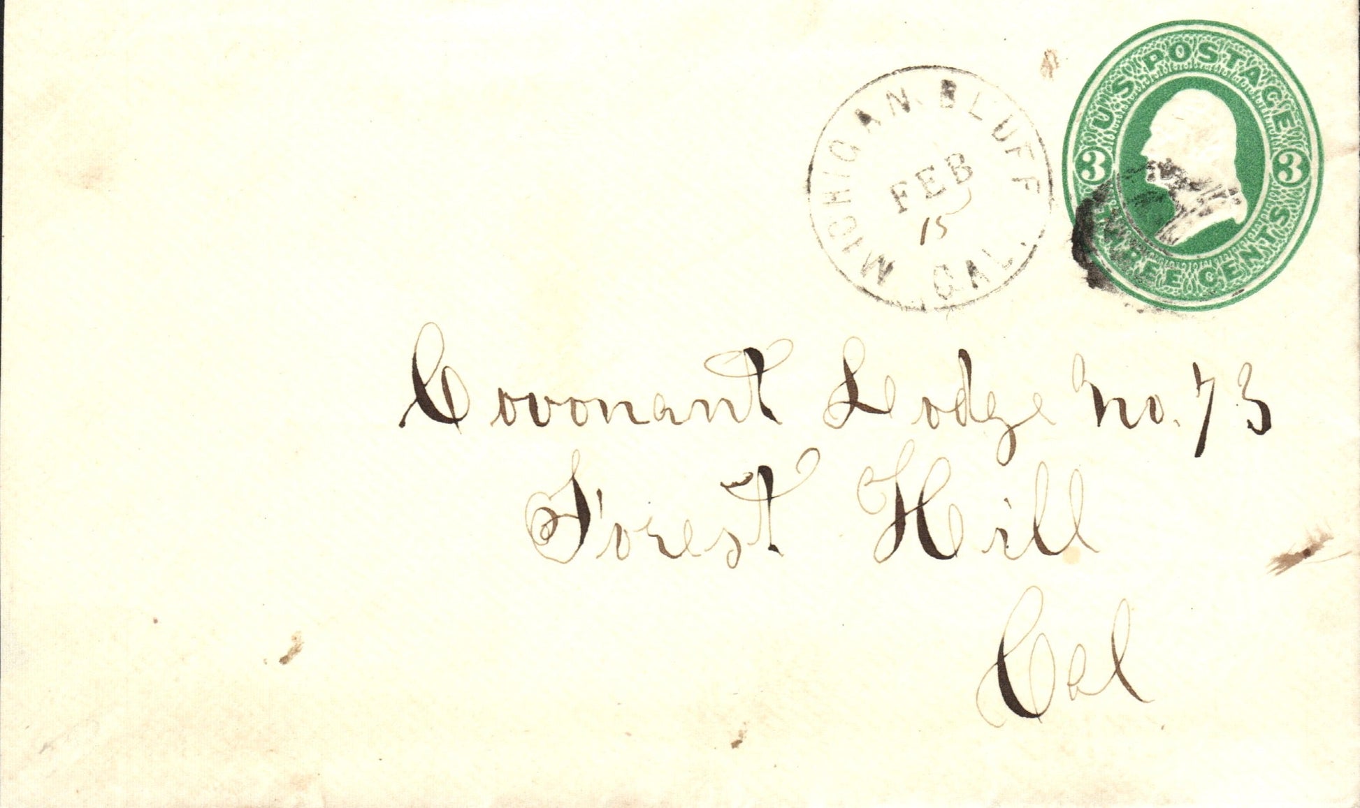 - Michigan Bluff (1854-1943) 1875 cds on cover with original contents, an invitation from one Covenant Lodge to another; 1909 duplex on post card, also Toutle Wash. 4-bar as rec’d