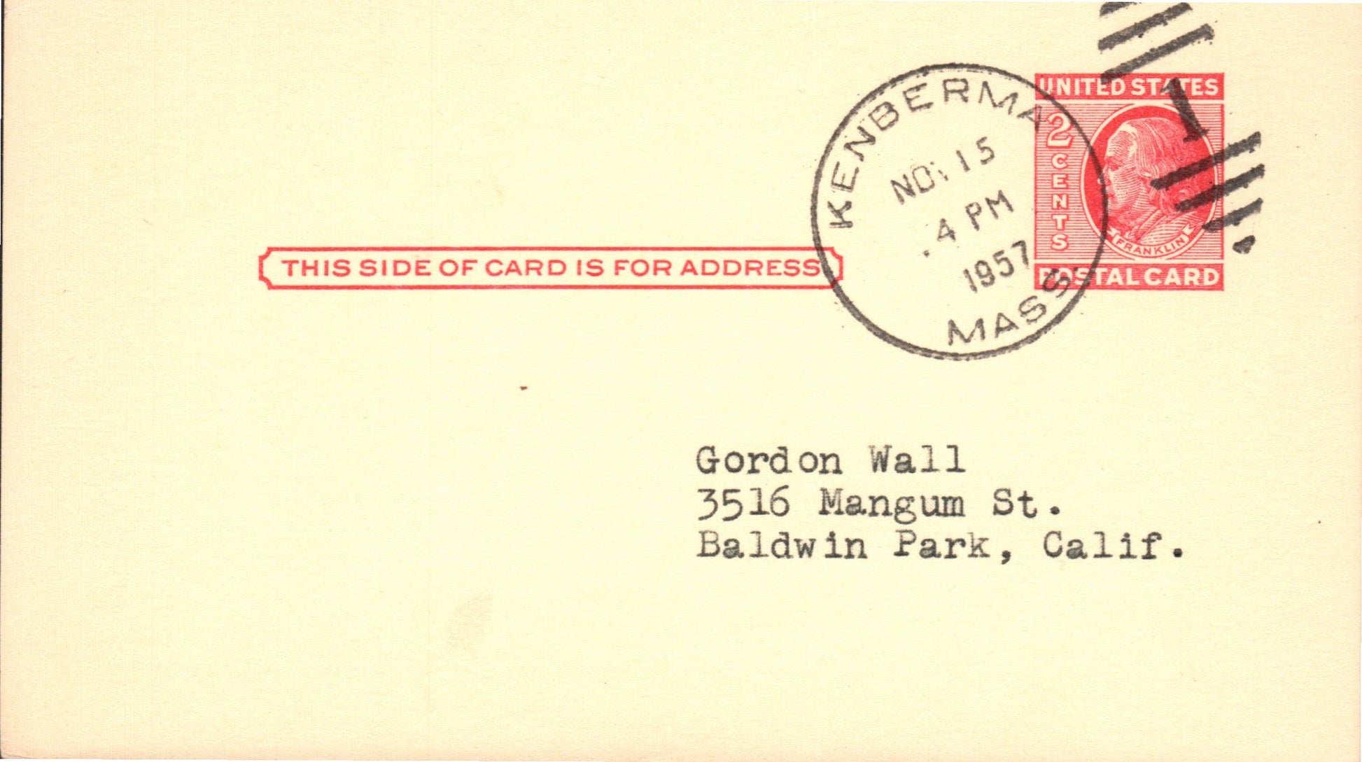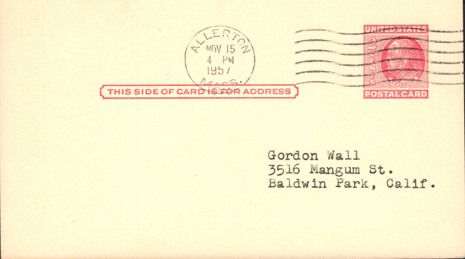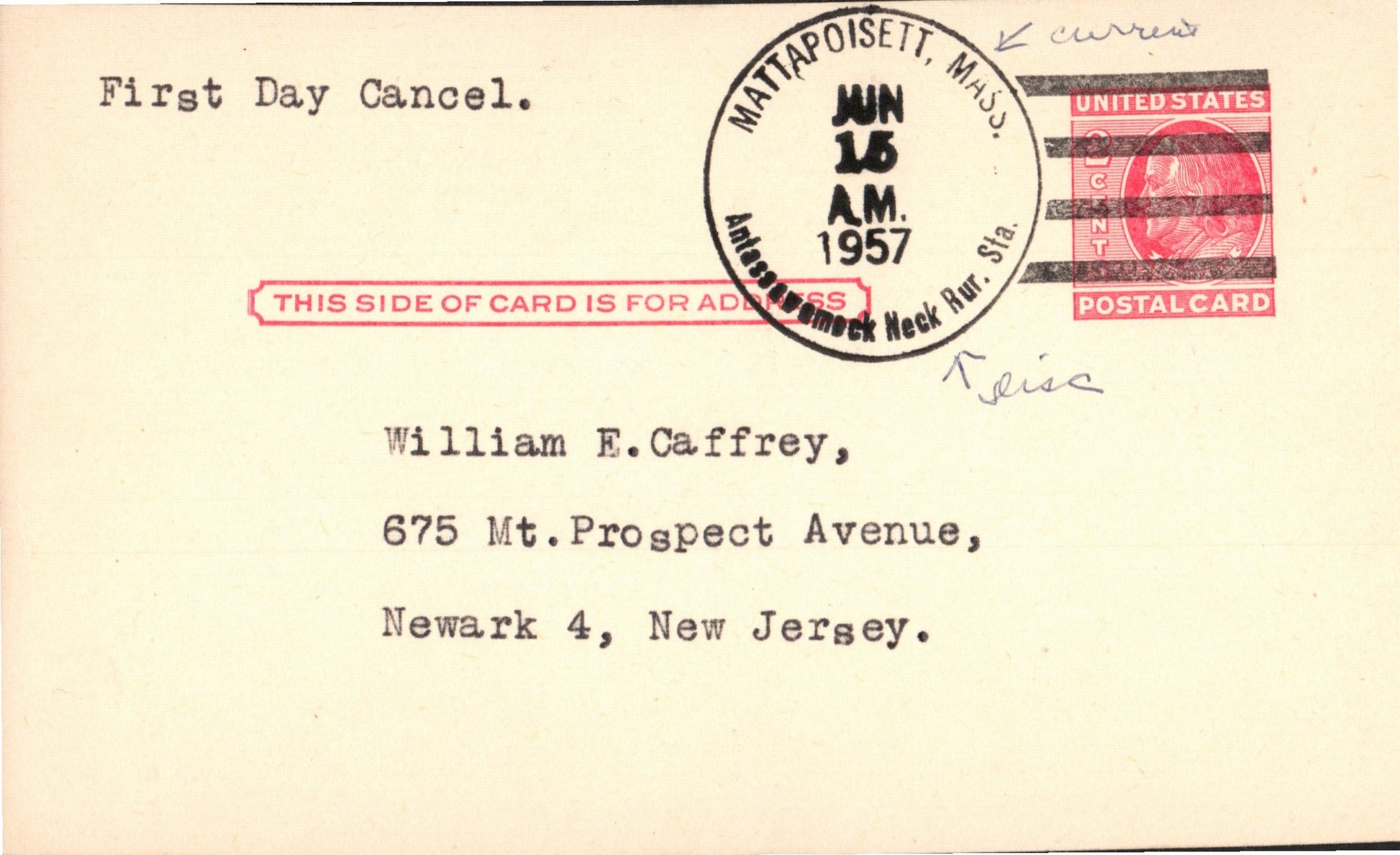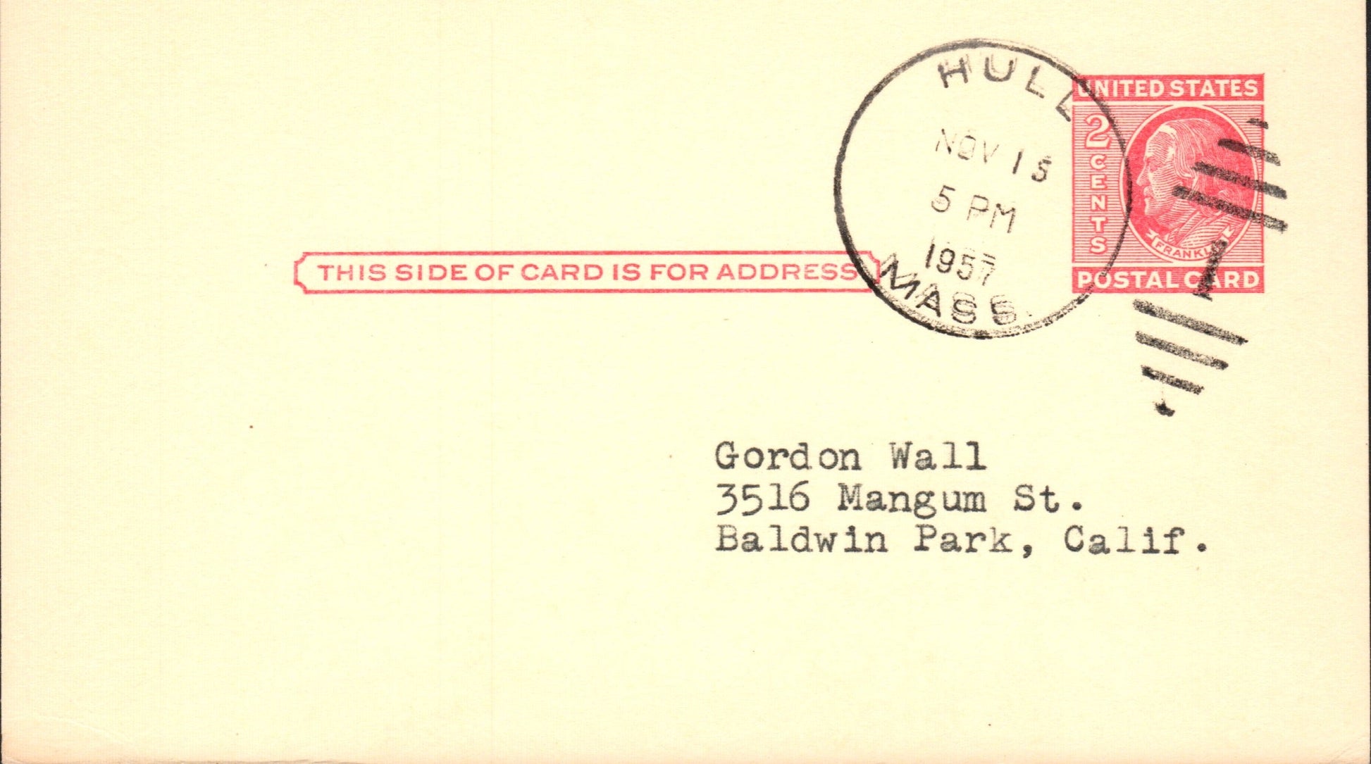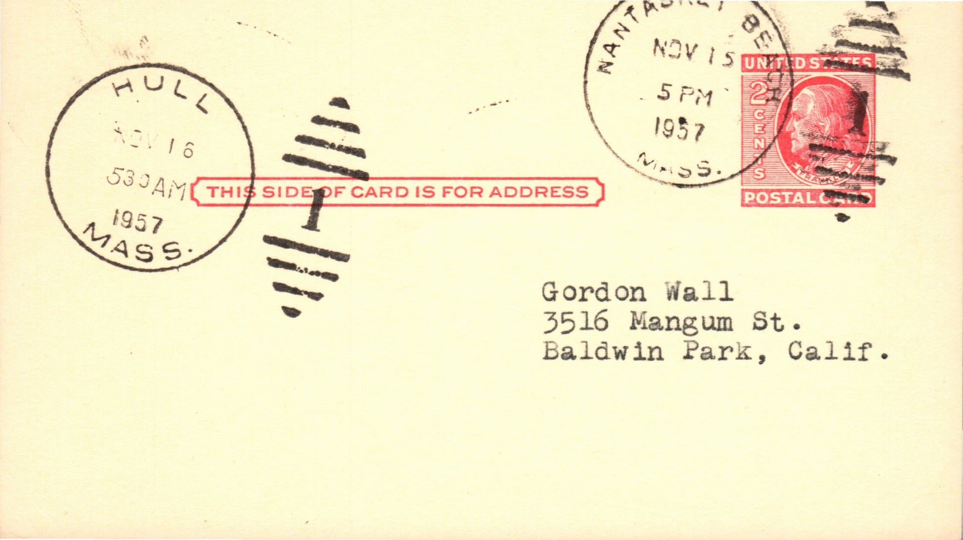 Nantasket Beach (1911-1957) 1957 duplex on FD [of name] on Postal Card, also LD of Hull