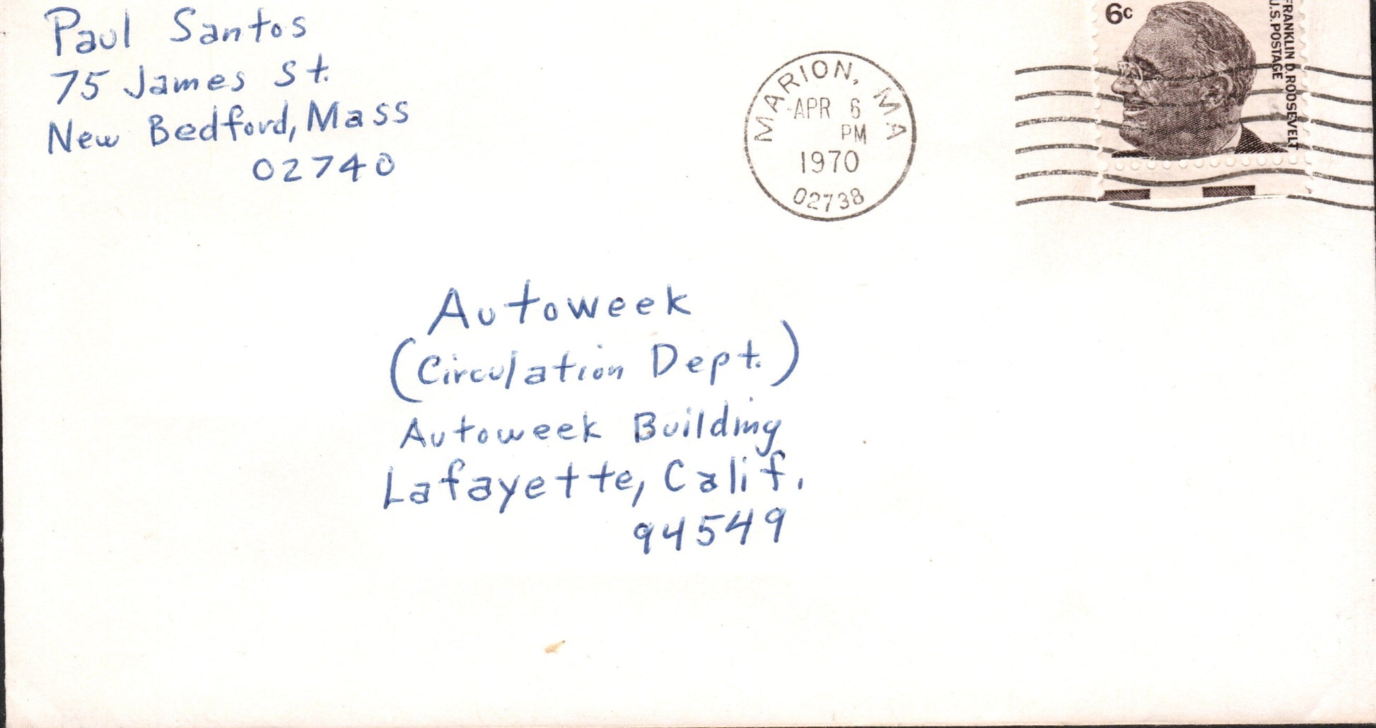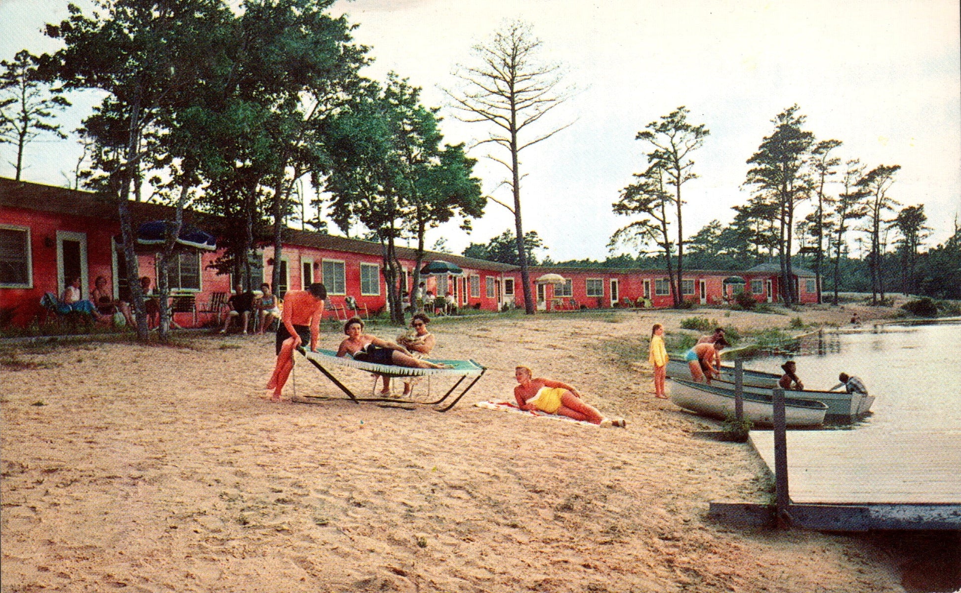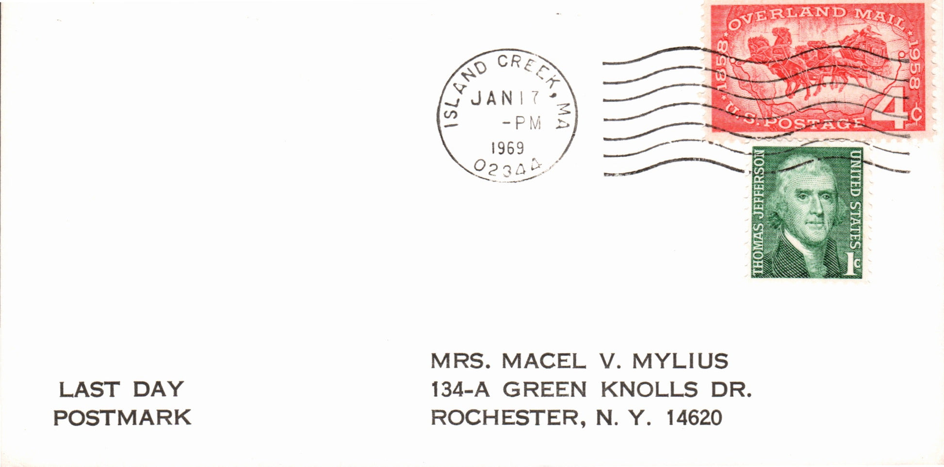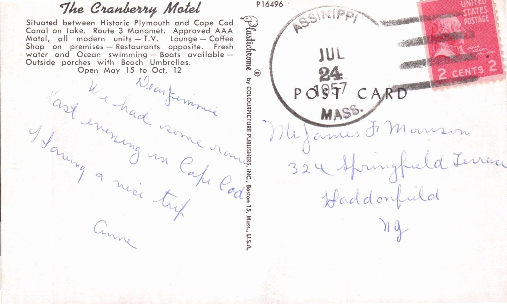 Assinippi (1892-1967) 1957 4-bar on post card, view of Cranberry Motel [chrome]; 1967 4-bar on LD cover-sized card