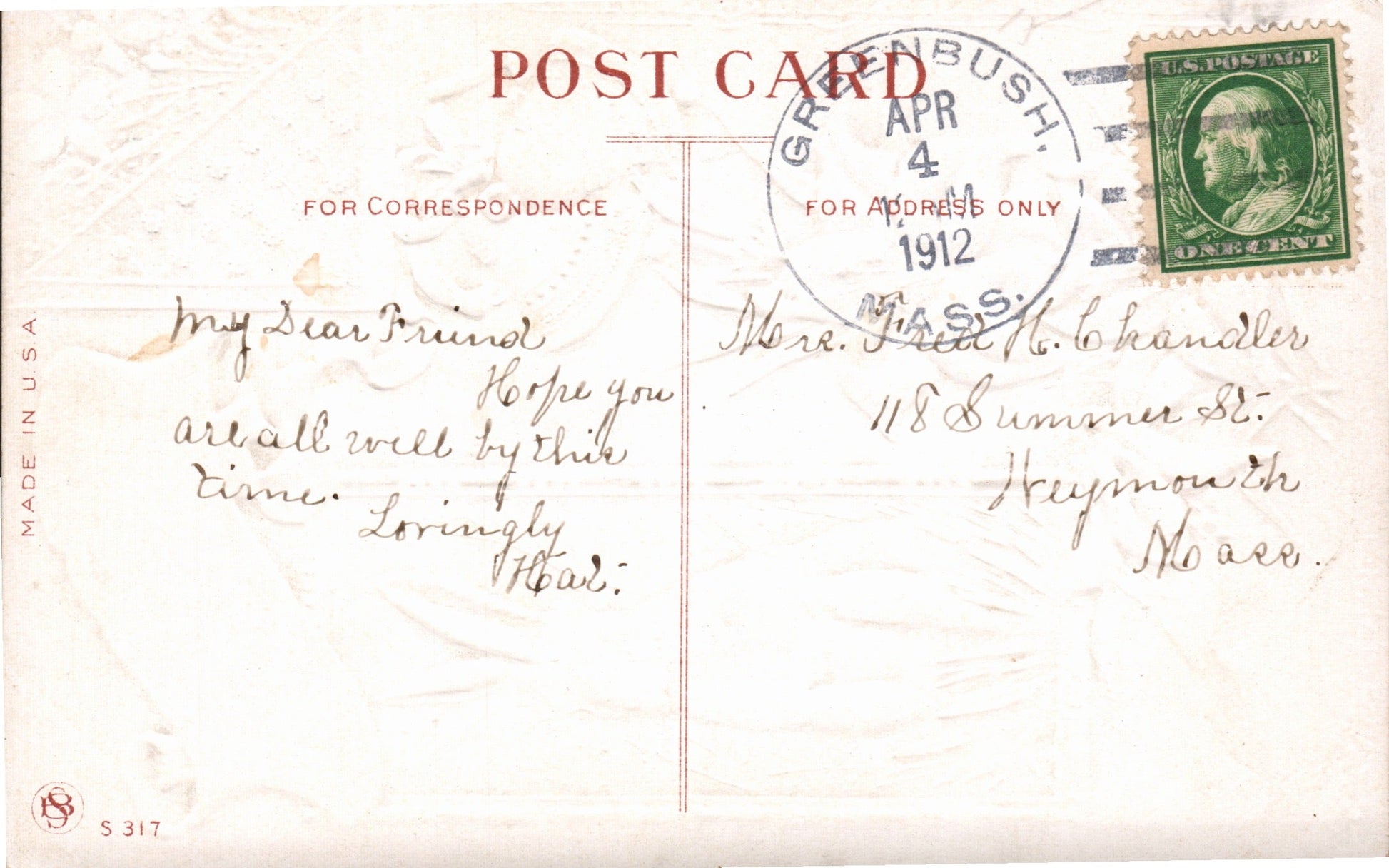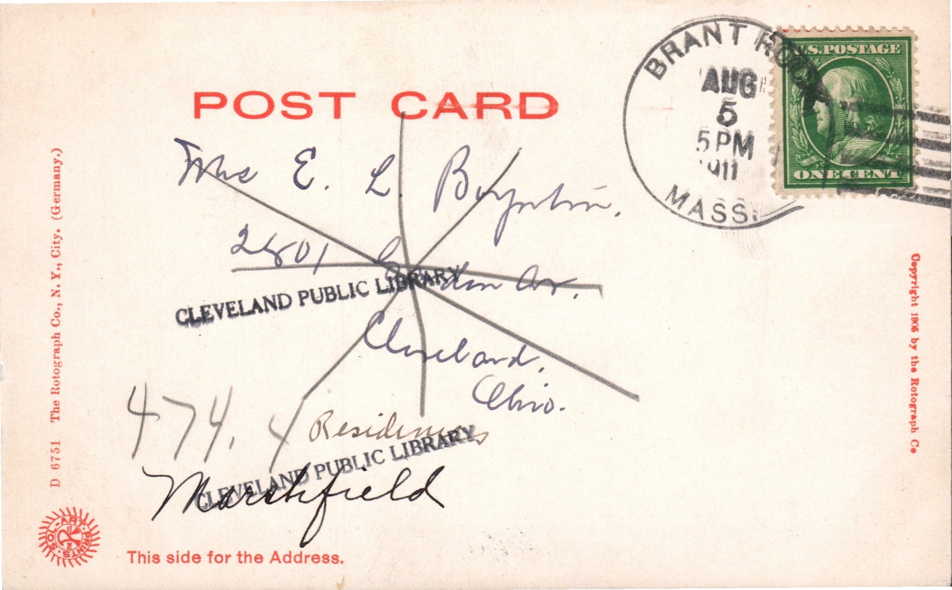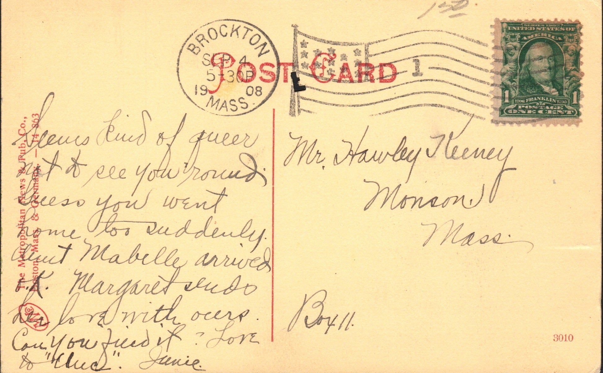 Post cards: “W.L. Douglas Residence” [1908]; “Main Street ‘Campello’” [1905]; “Horse Show, Brockton Fair” [1909]; “A Brook Scene” [1913]