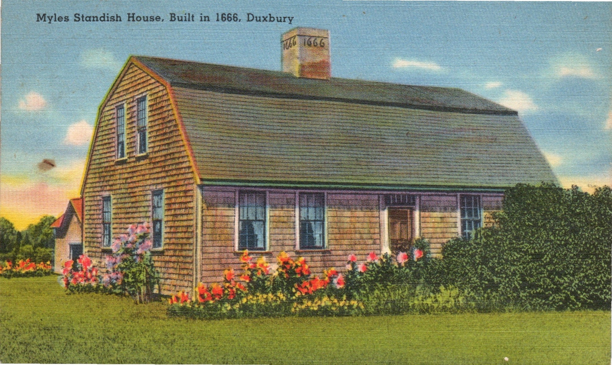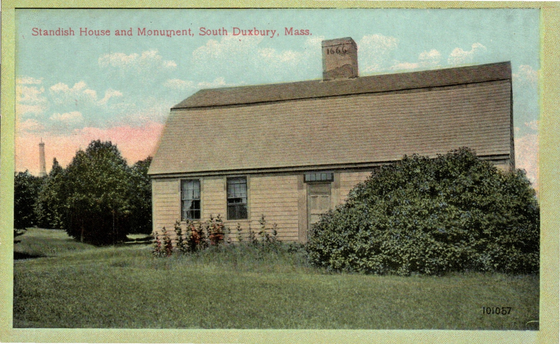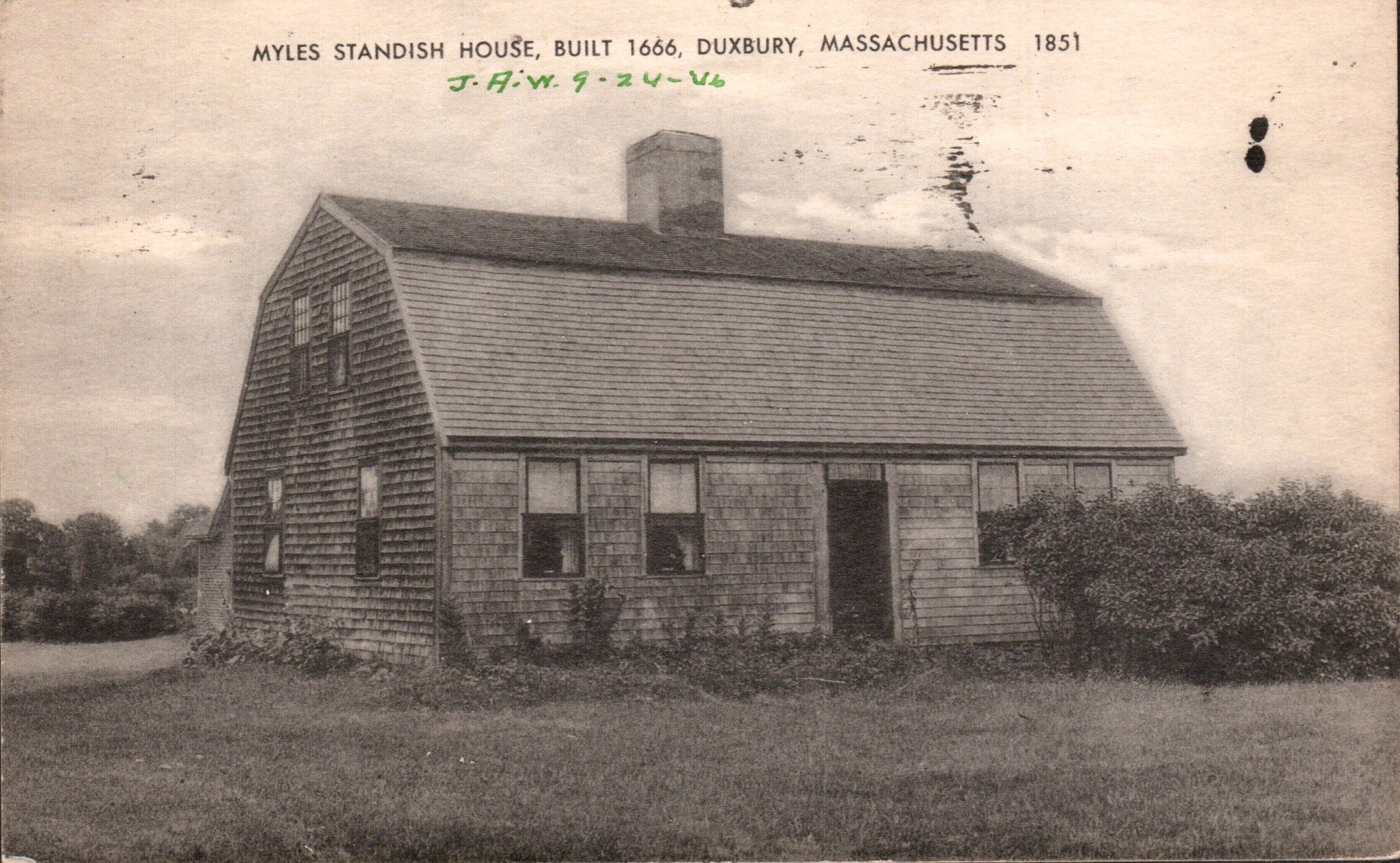 Duxbury Post cards: John Alden House [4 exterior views, 2 interior views]; Howland House [chrome]; Standish House [3 views, 2 are B&W, one linen]; Miles Standish Grave [B&W]