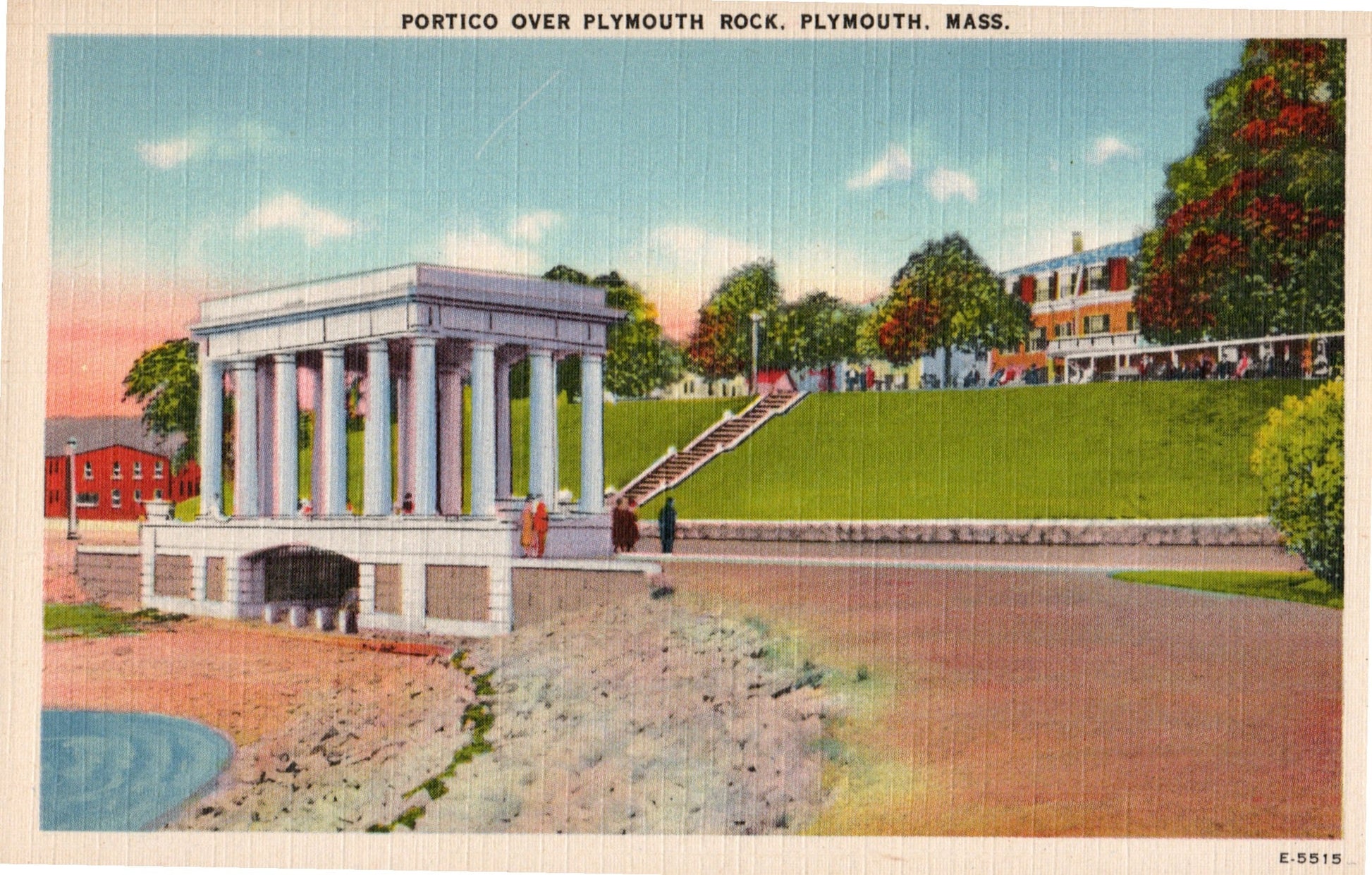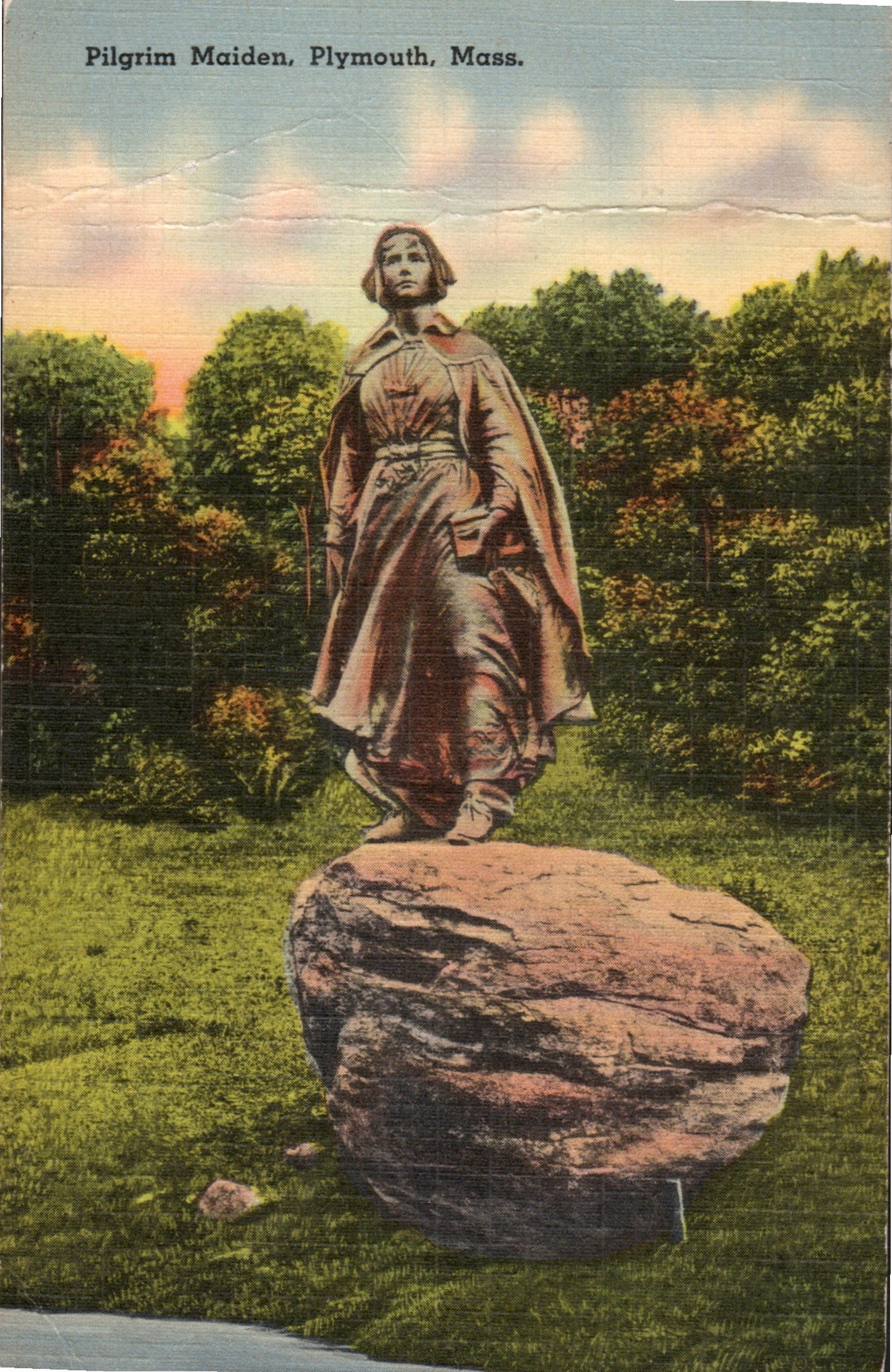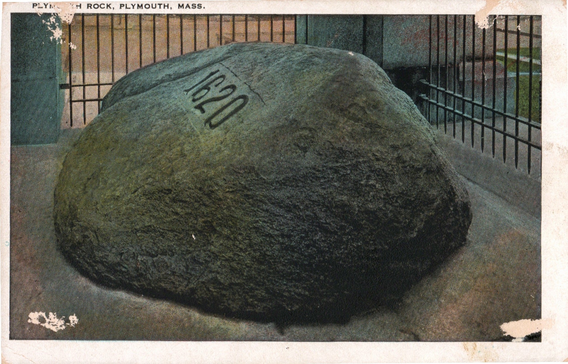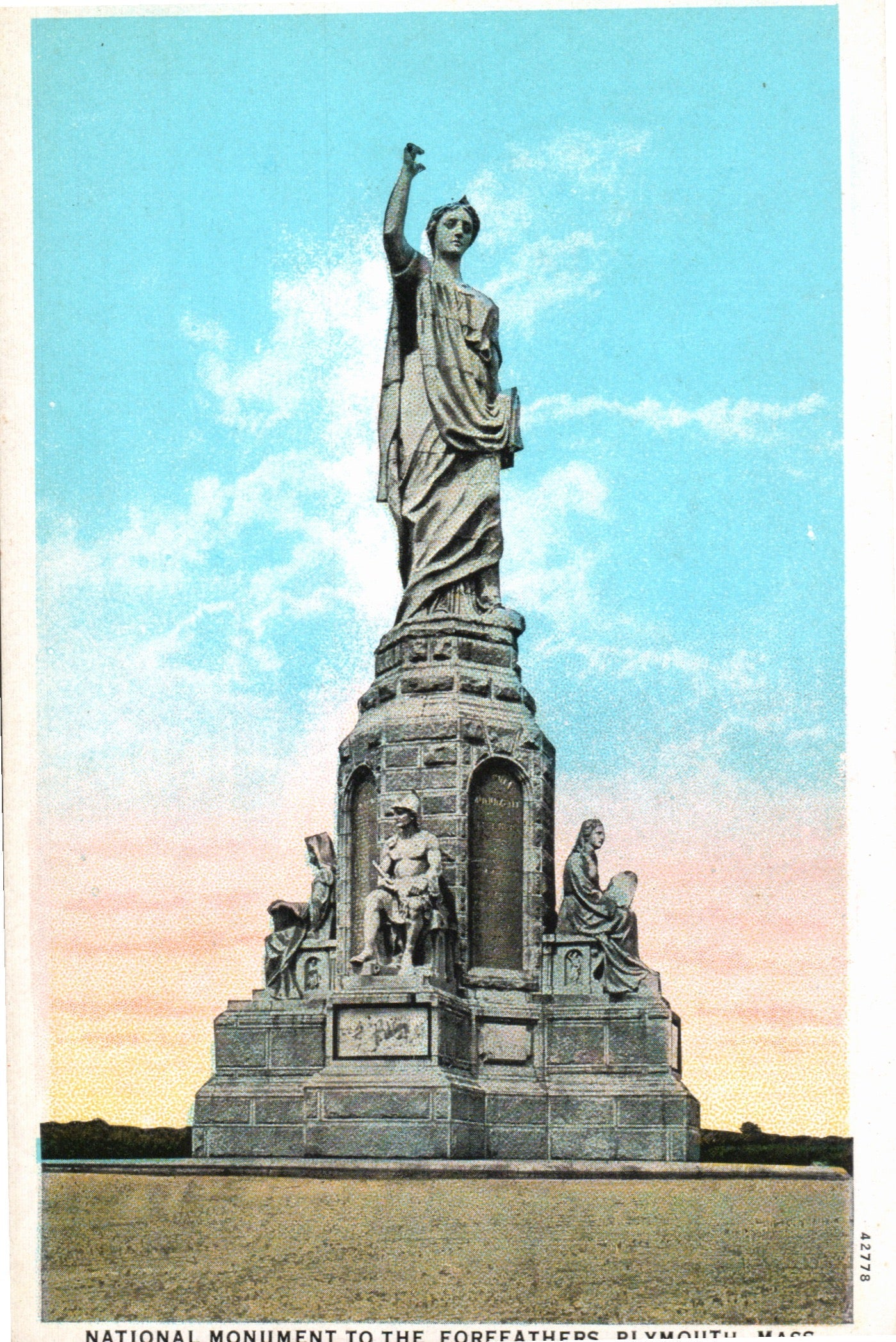 Post cards: Court House [c.1910]; “The First Church in Plymouth” {B&W reproduction]; Leyden Street [linen]; Pilgrim Hall [white border, c.1930]; Richard Sparrow House [2 views, 1 B&W, 1 chrome]; “Old Howland House [2 views, c.1910, c.1930]; “First Burying Ground of the Passengers of the Mayflower [linen]; “Burial Hill” [chrome]; “‘The First Fort’ - a Replica” [linen]; “Fishing Boat - Plymouth Harbor” [chrome]; Morton Park [1909]; “Greetings from Plymouth” [chrome]; Statue of Massaquoit [damaged]; “The Pilgrim Mother” [statue, 1929]; “National Monument to the Forefathers” [3 views -white border, c.1930, linen, chrome]; “Pilgrim Maiden” [statue, linen]; Plymouth Rock Portico {3 diff. linen views]; Plymouth Rock [damaged]; Jenney Grist Mill [chrome]; Plymouth Plantation replica [2 chrome views]
