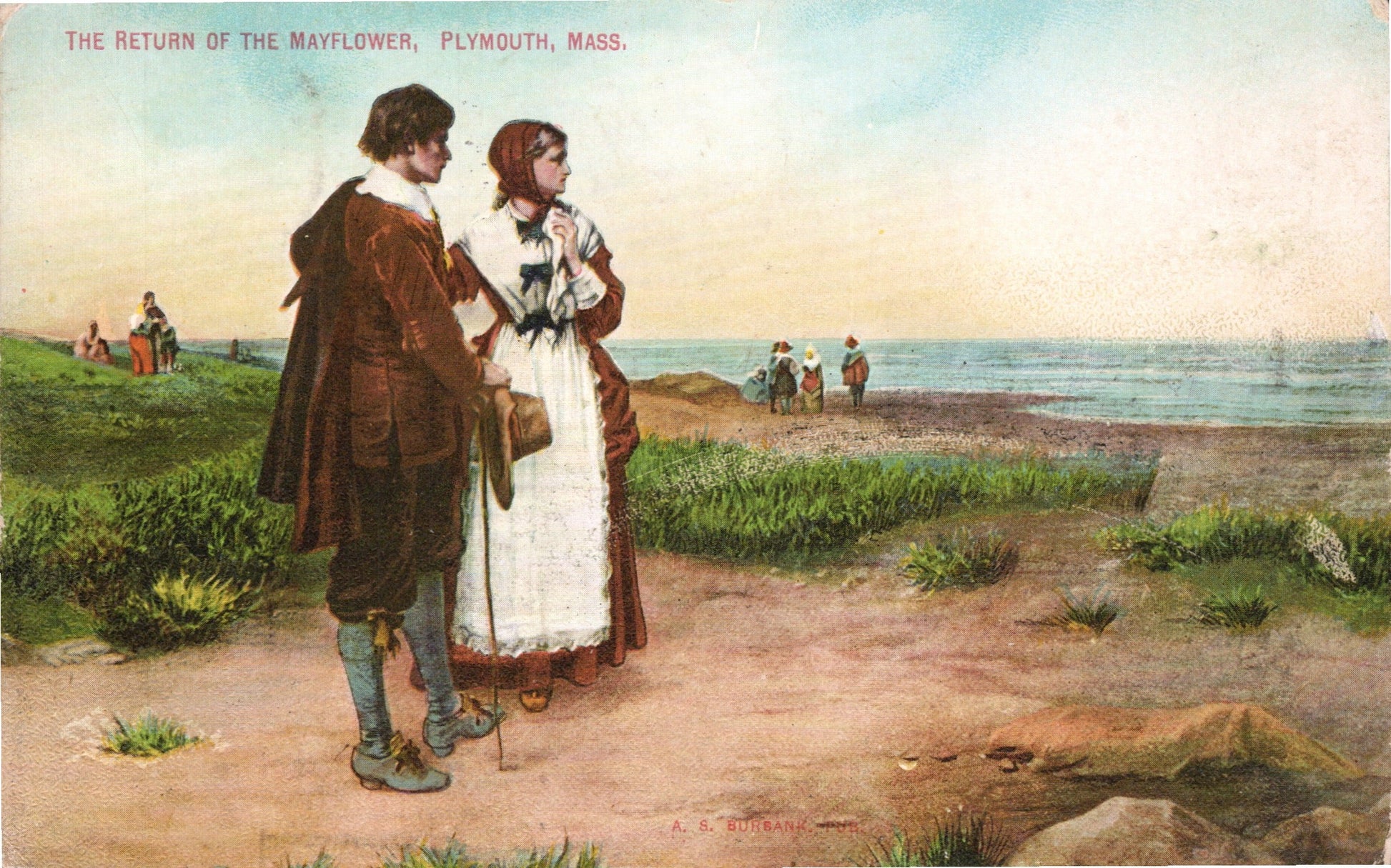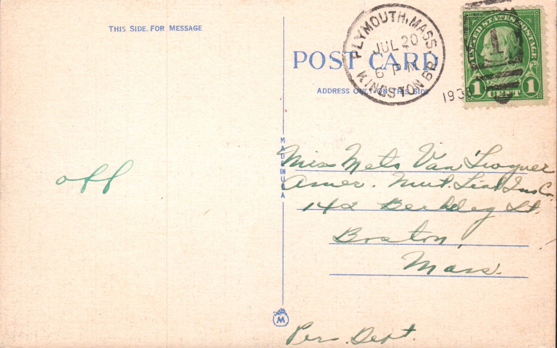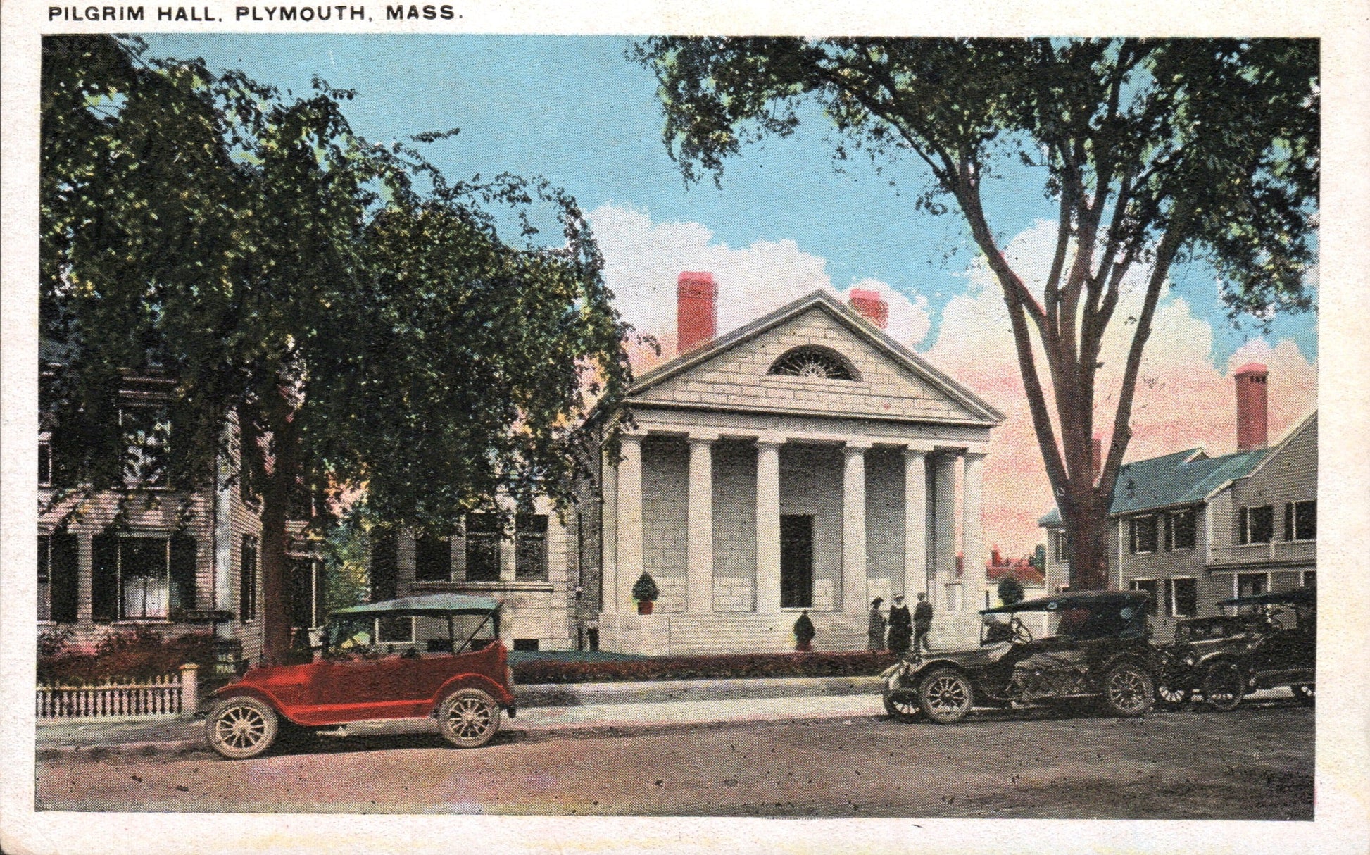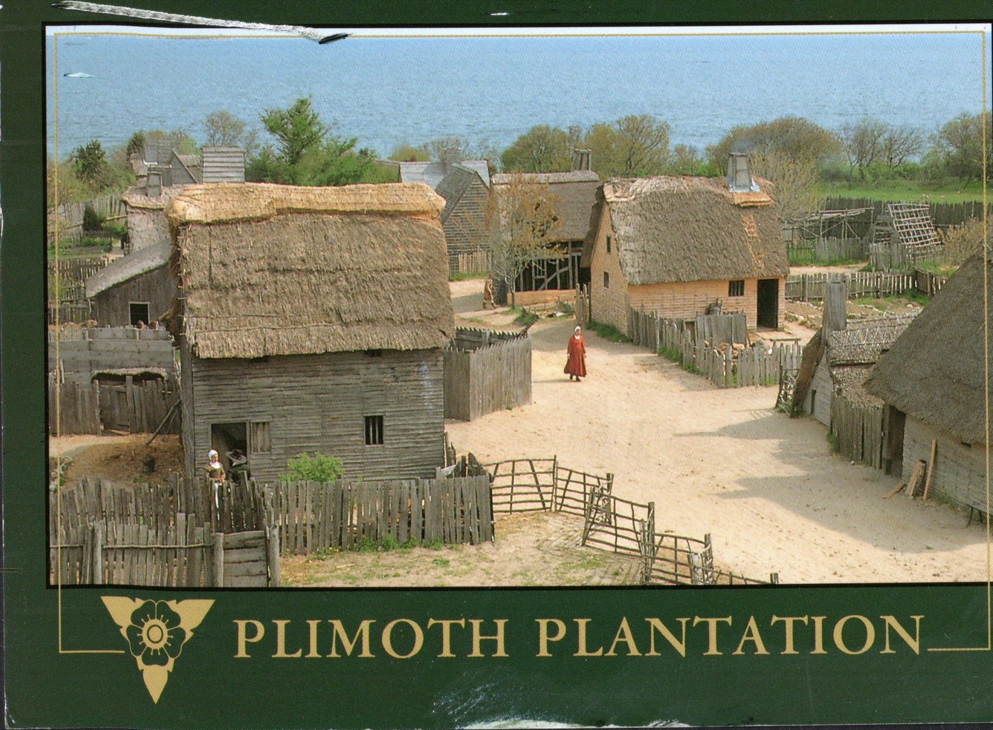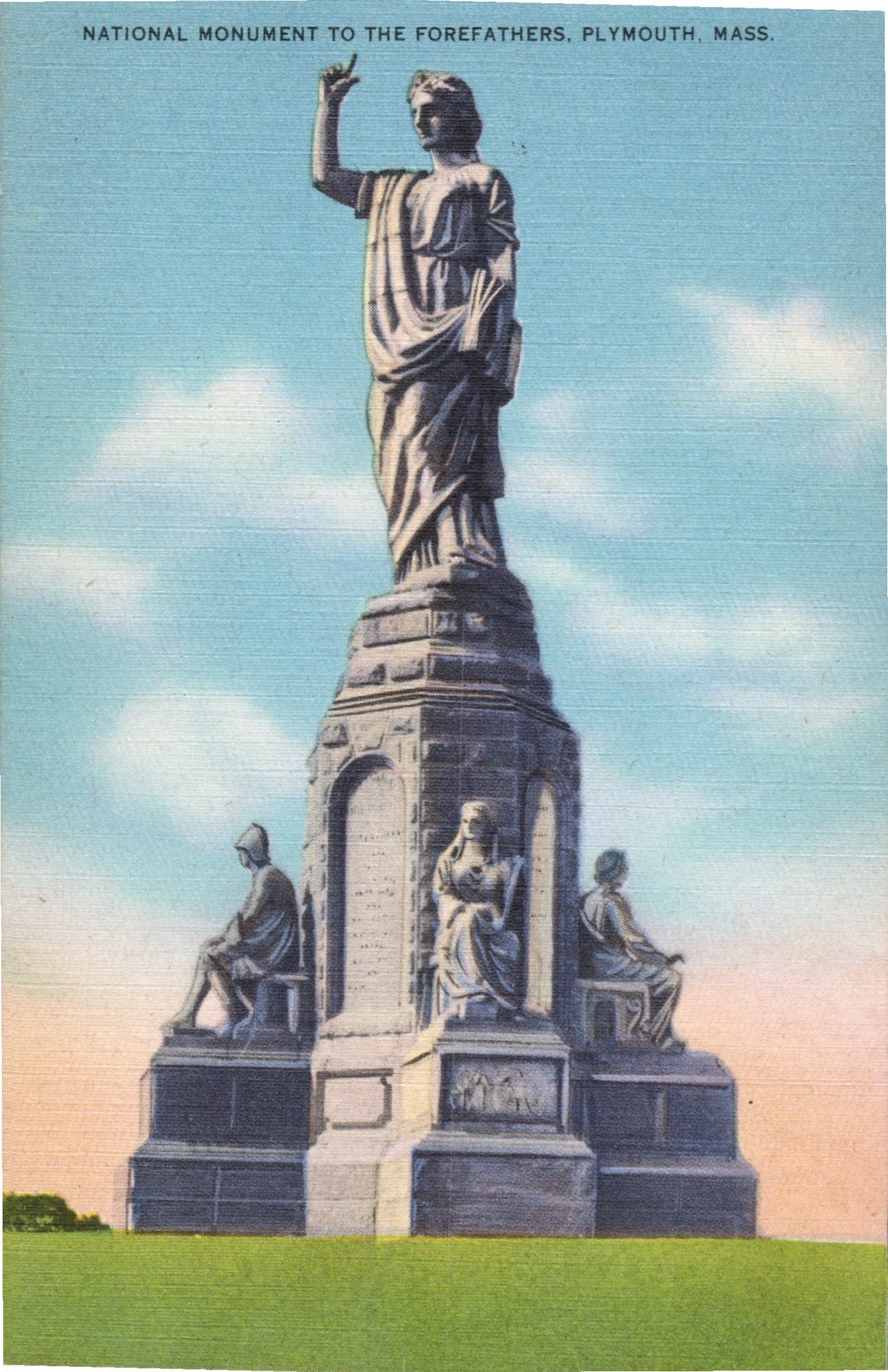 Post cards: Court House [c.1910]; “The First Church in Plymouth” {B&W reproduction]; Leyden Street [linen]; Pilgrim Hall [white border, c.1930]; Richard Sparrow House [2 views, 1 B&W, 1 chrome]; “Old Howland House [2 views, c.1910, c.1930]; “First Burying Ground of the Passengers of the Mayflower [linen]; “Burial Hill” [chrome]; “‘The First Fort’ - a Replica” [linen]; “Fishing Boat - Plymouth Harbor” [chrome]; Morton Park [1909]; “Greetings from Plymouth” [chrome]; Statue of Massaquoit [damaged]; “The Pilgrim Mother” [statue, 1929]; “National Monument to the Forefathers” [3 views -white border, c.1930, linen, chrome]; “Pilgrim Maiden” [statue, linen]; Plymouth Rock Portico {3 diff. linen views]; Plymouth Rock [damaged]; Jenney Grist Mill [chrome]; Plymouth Plantation replica [2 chrome views]