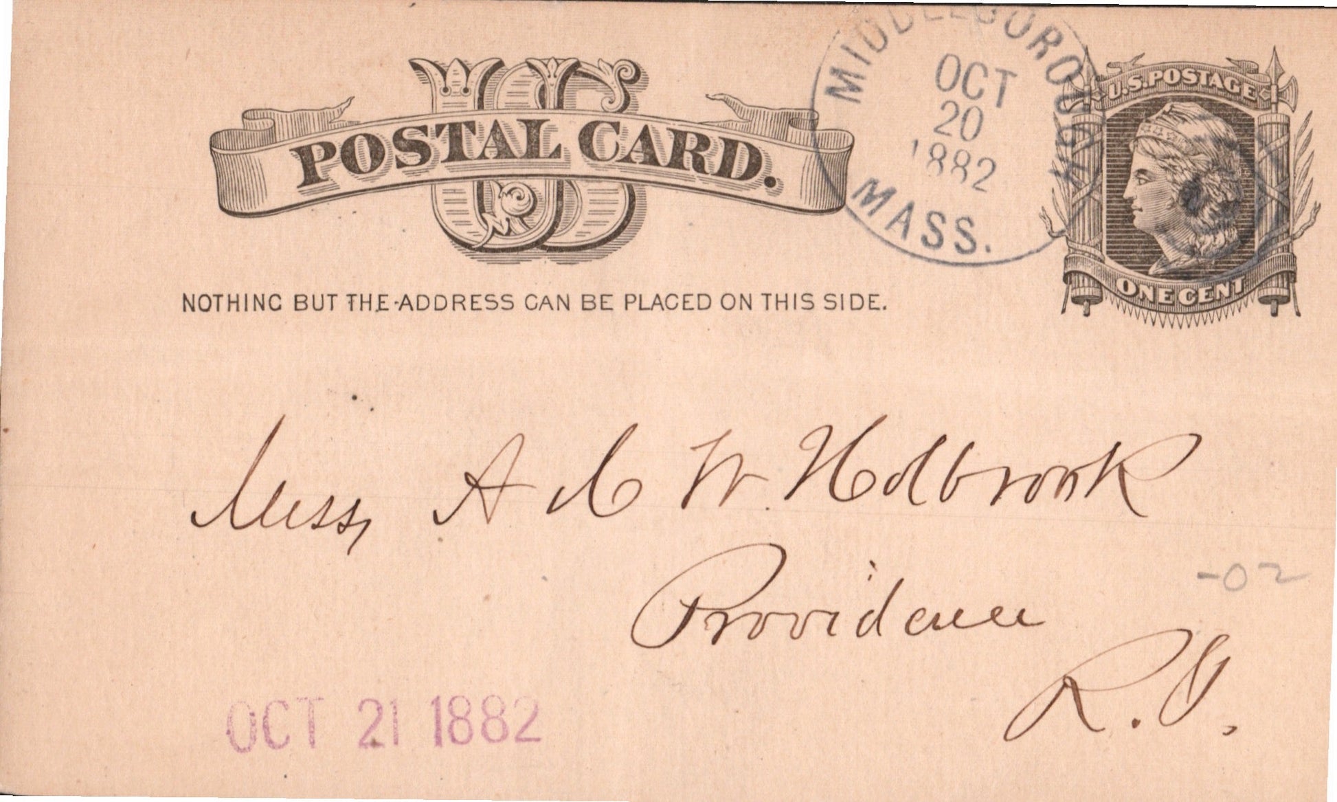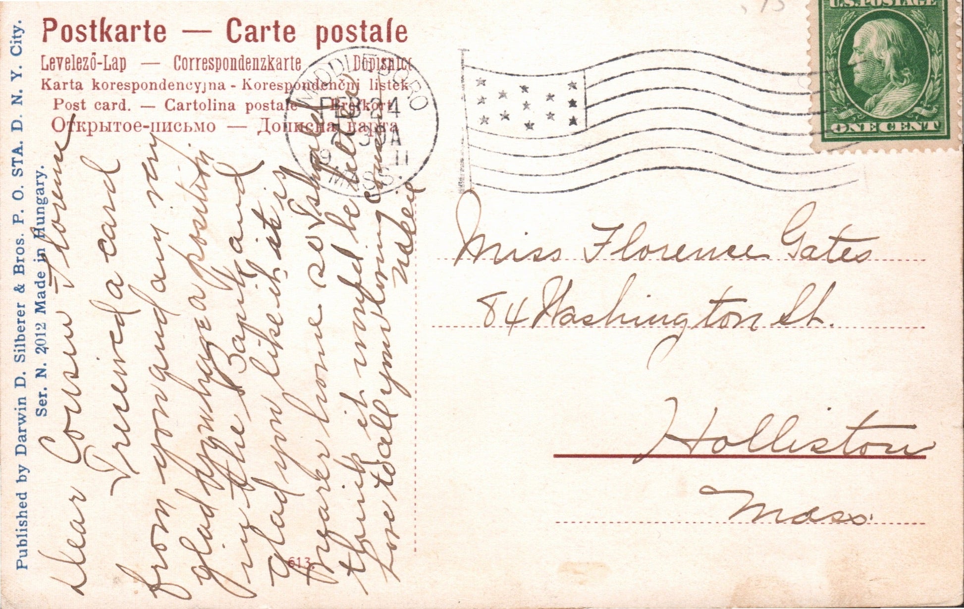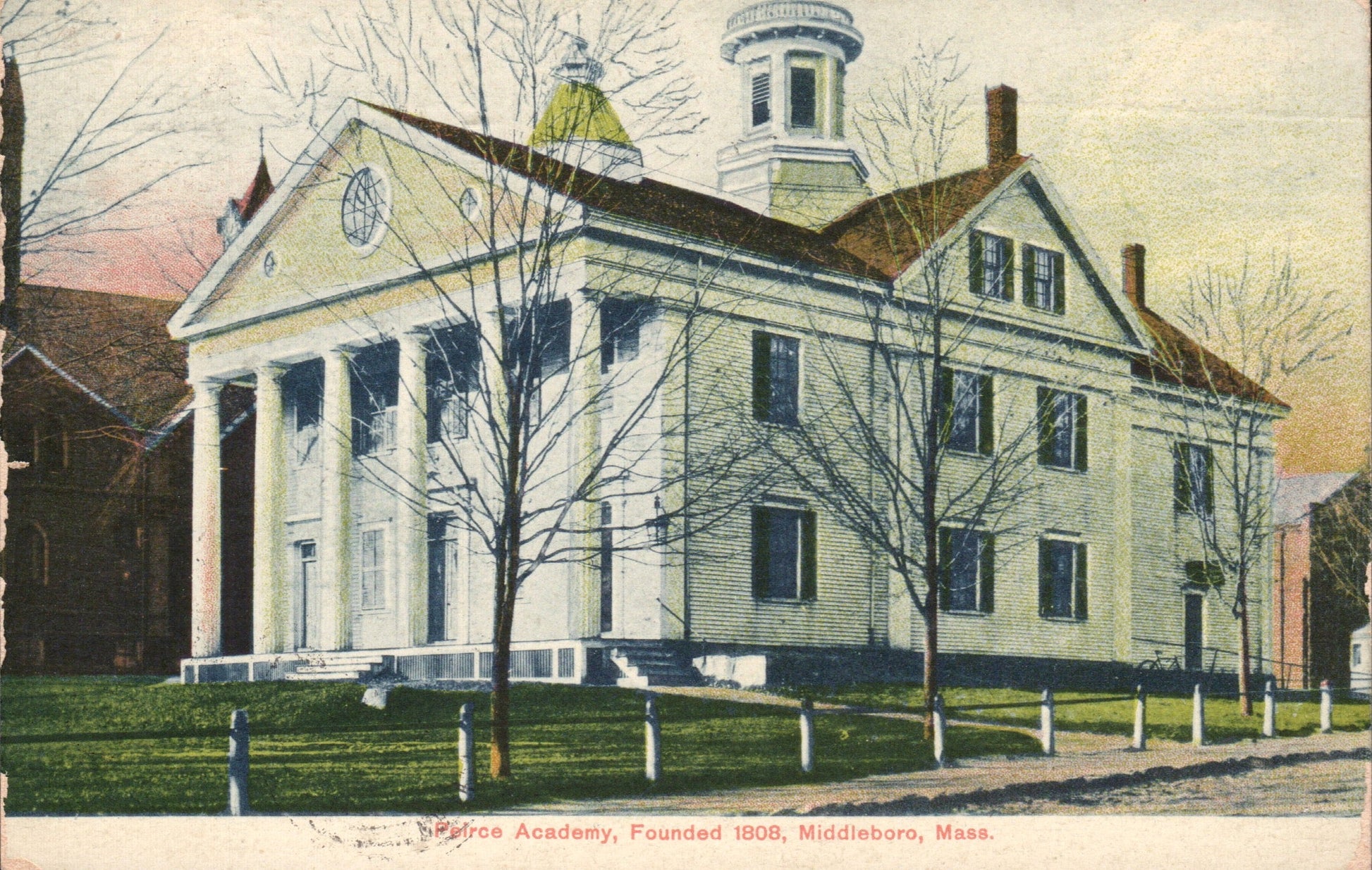 Middleboro 1907 duplex on post card [view of Pierce Academy]; 1911 Flag cancel on post card.