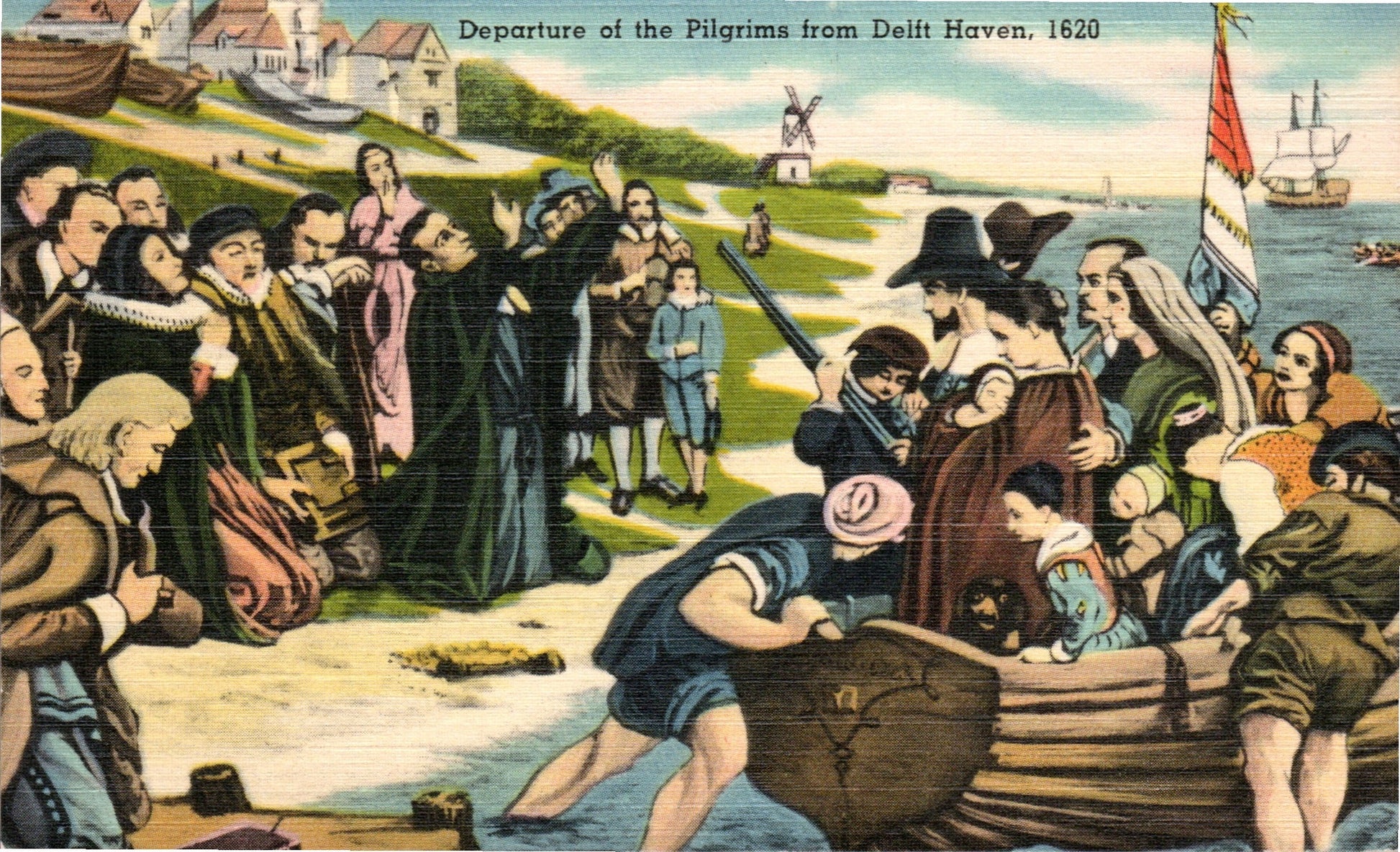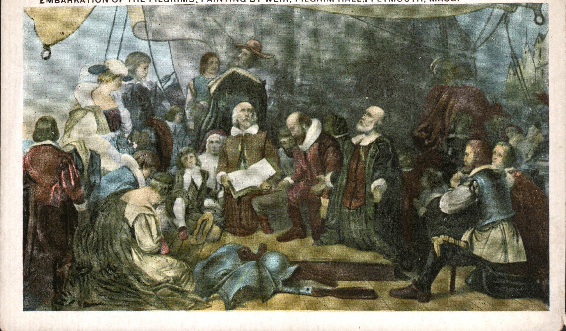 Pilgrims Post cards: 2 Departure of Pilgrims from Europe; “The Compact” [document signed on the Mayflower]
