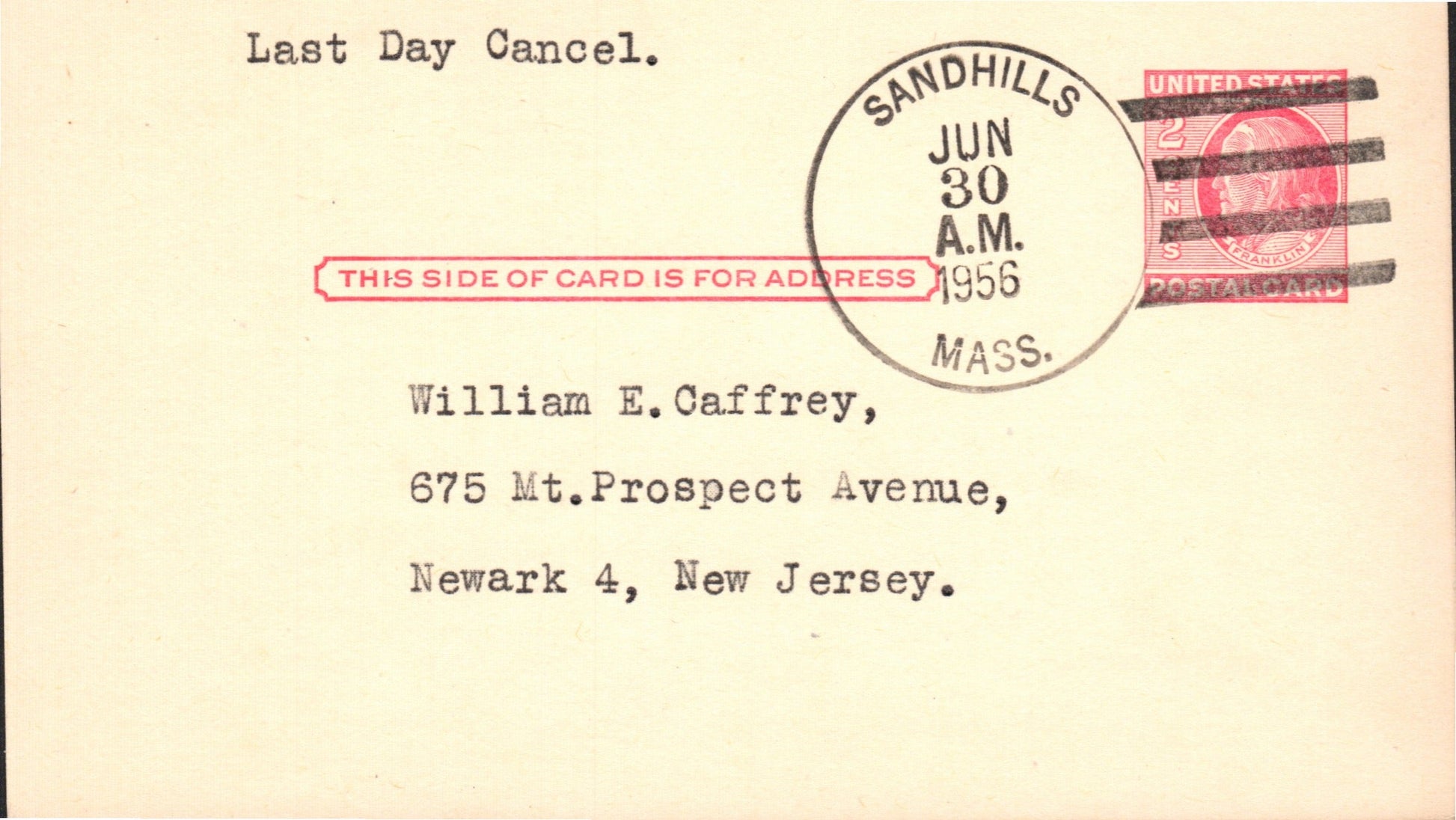 Sandhills (1896-1956) 1956 4-bar on LD Postal Card