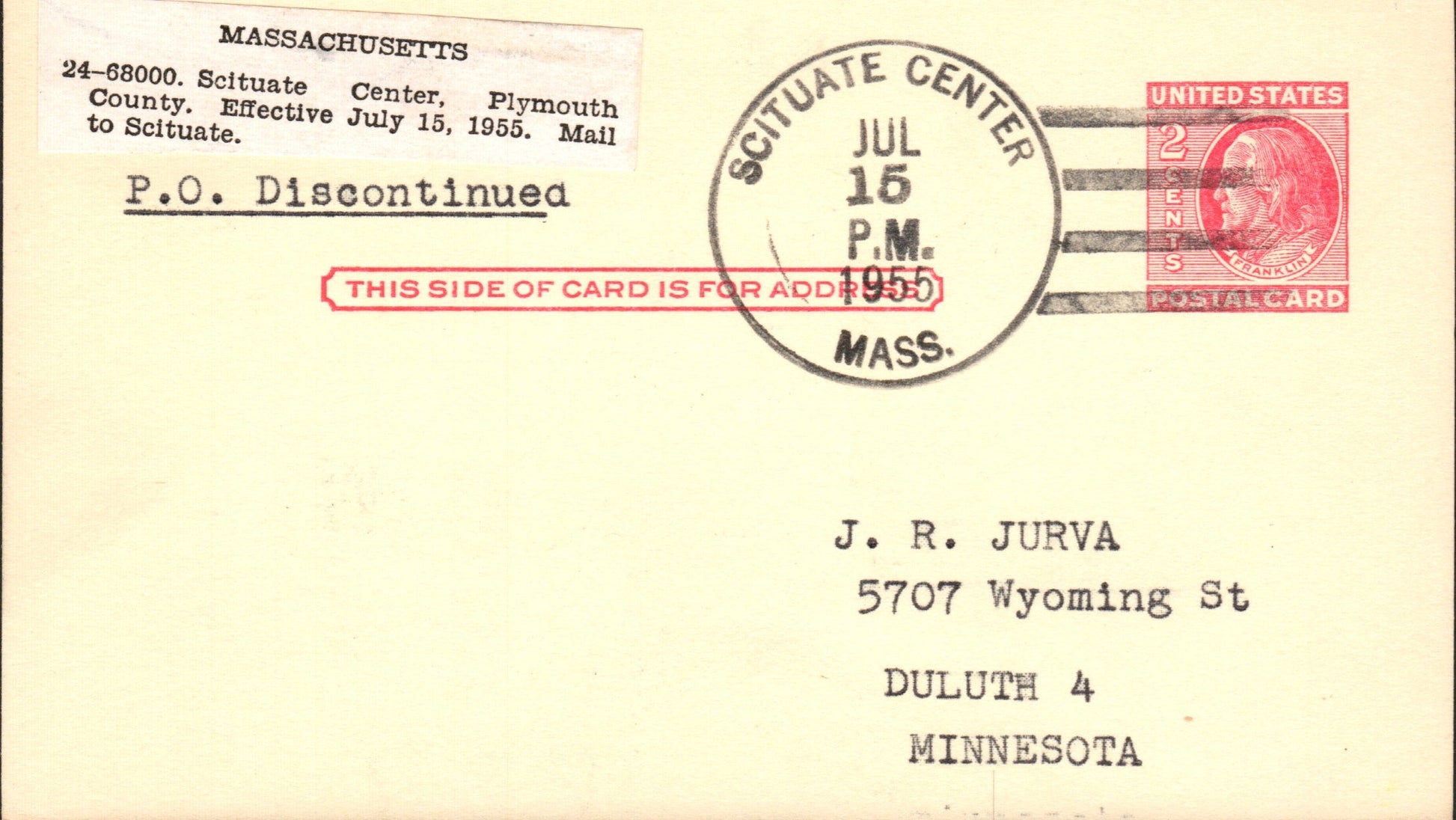 Scituate Center (1872-1955) 1955 4-bar on LD Postal Card