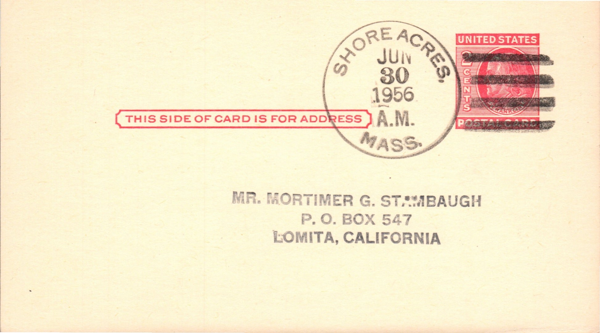 Shore Acres (1915-1956) 1956 4-bar on LD Postal Card