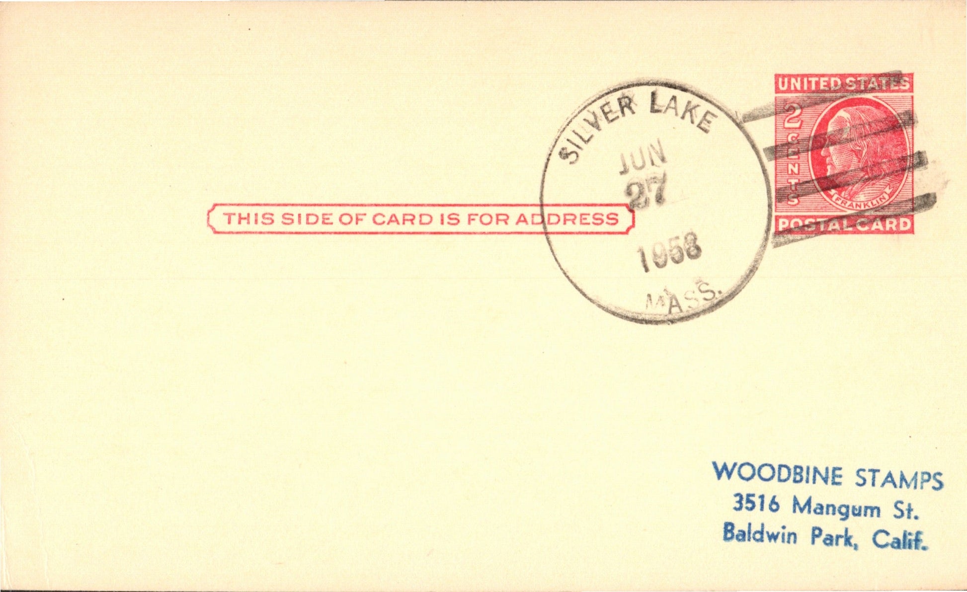 Silver Lake (1879-1958) 1958 4-bar on Postal Card