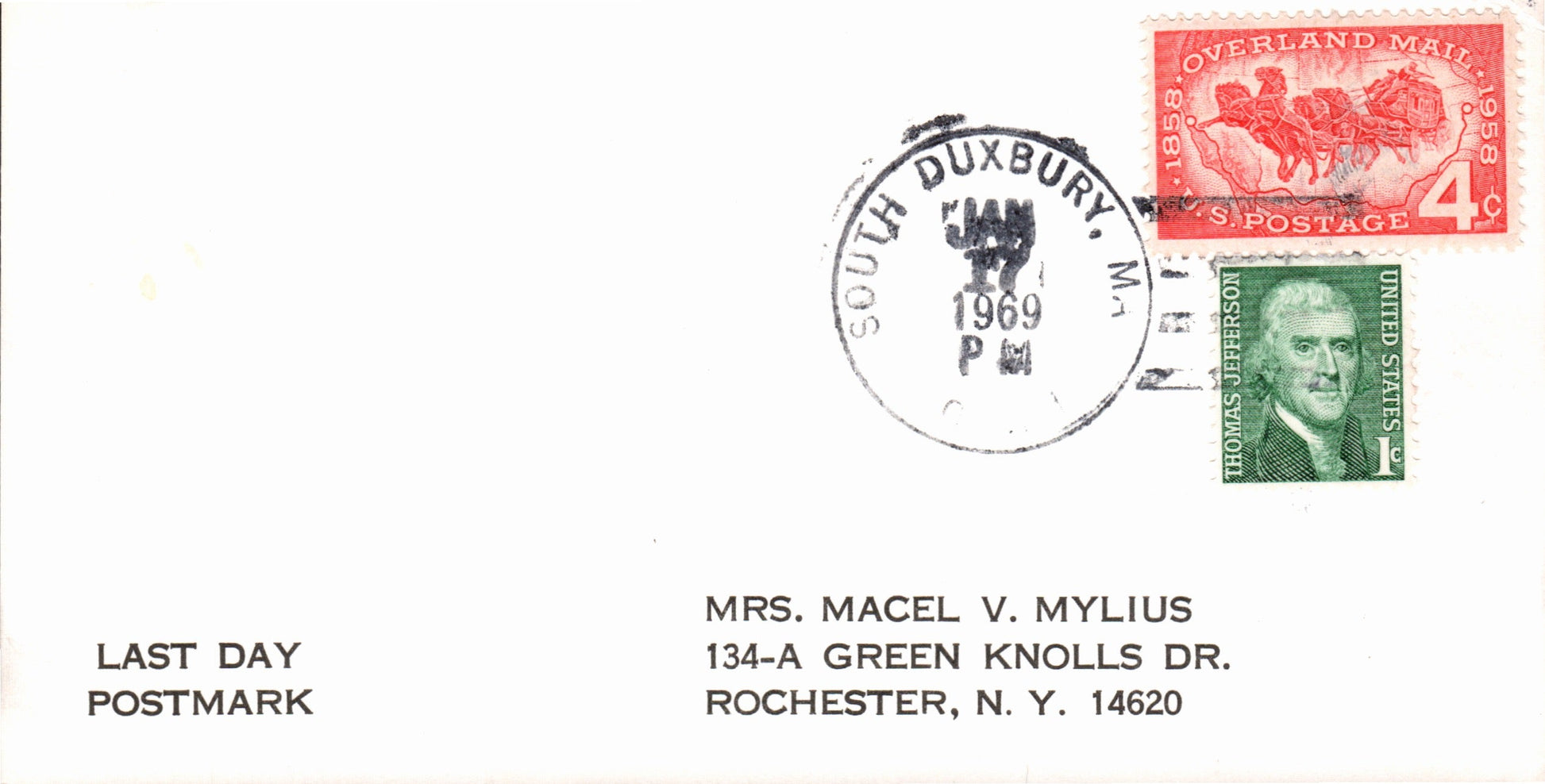 South Duxbury (1870-1969) 190? 4-bar on post card; 1969 4-bar on LD cover-sized card, PM autograph; Post card: Standish House [c.1910]