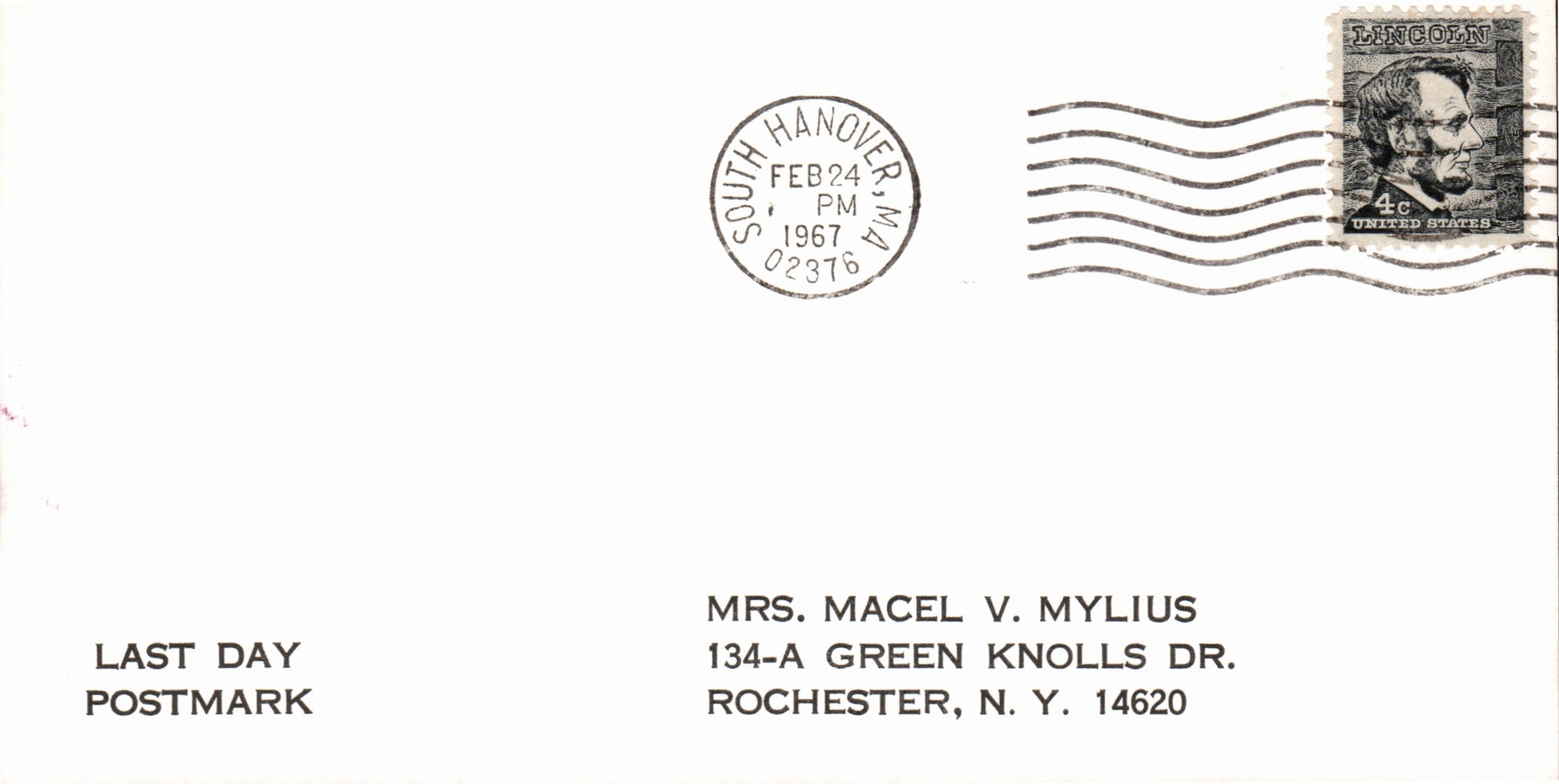 South Hanover (1864-1967) 1967 machine cancel on LD cover-sized card, round dater & PM autograph on back
