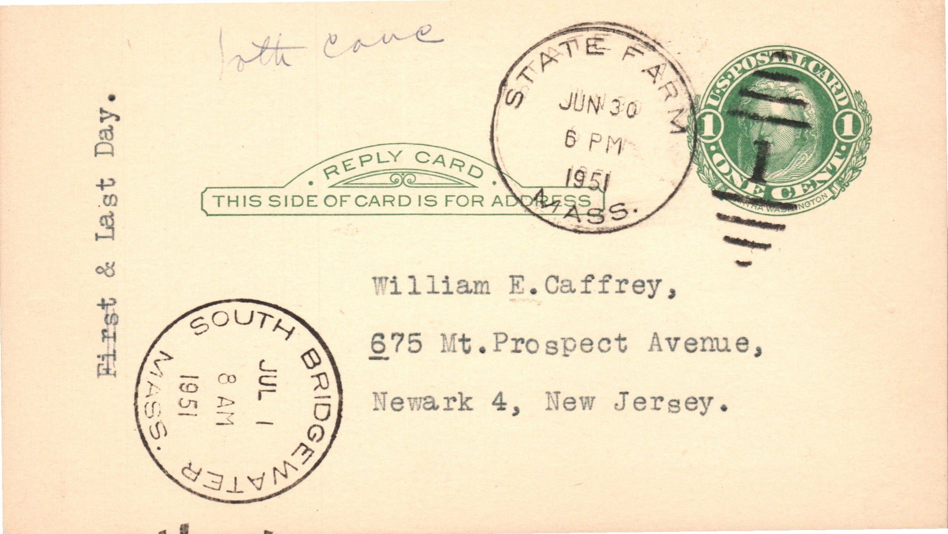 State Farm (1887-1951) 1951 duplex and South Duxbury on Postal Card, on the occasion of the name change