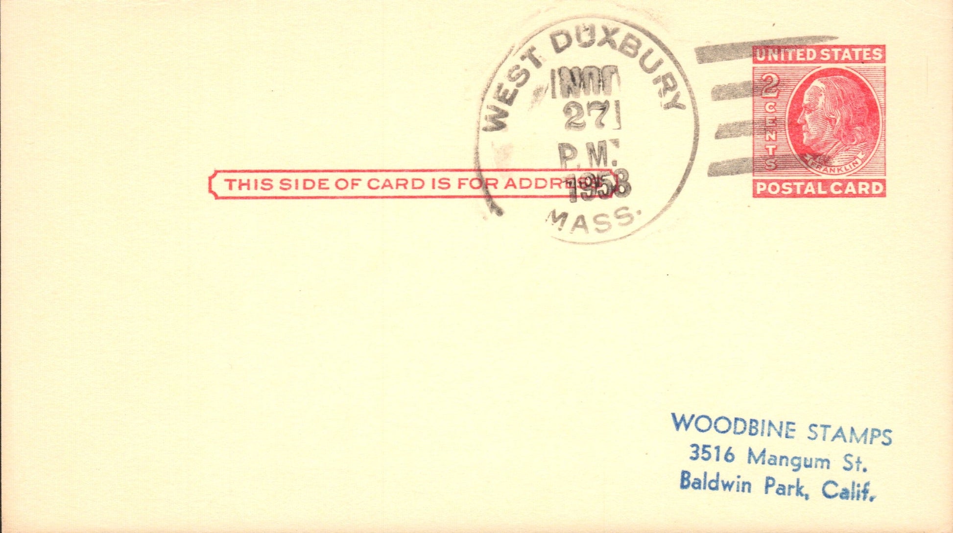 West Duxbury (1844-1958) 1958 4-bar on LD Postal Card