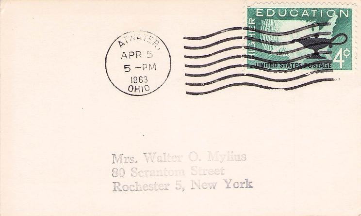 Atwater 1963 machine cancel on 3x5 card, PM autograph on back