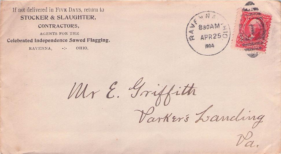 Ravenna 1904 duplex on cover with “Stocker & Slaughter, Contractor, Agents for the Celebrated Independence Sawed Flagging; 1917 machine cancel (Barr-Fyke?) on post card