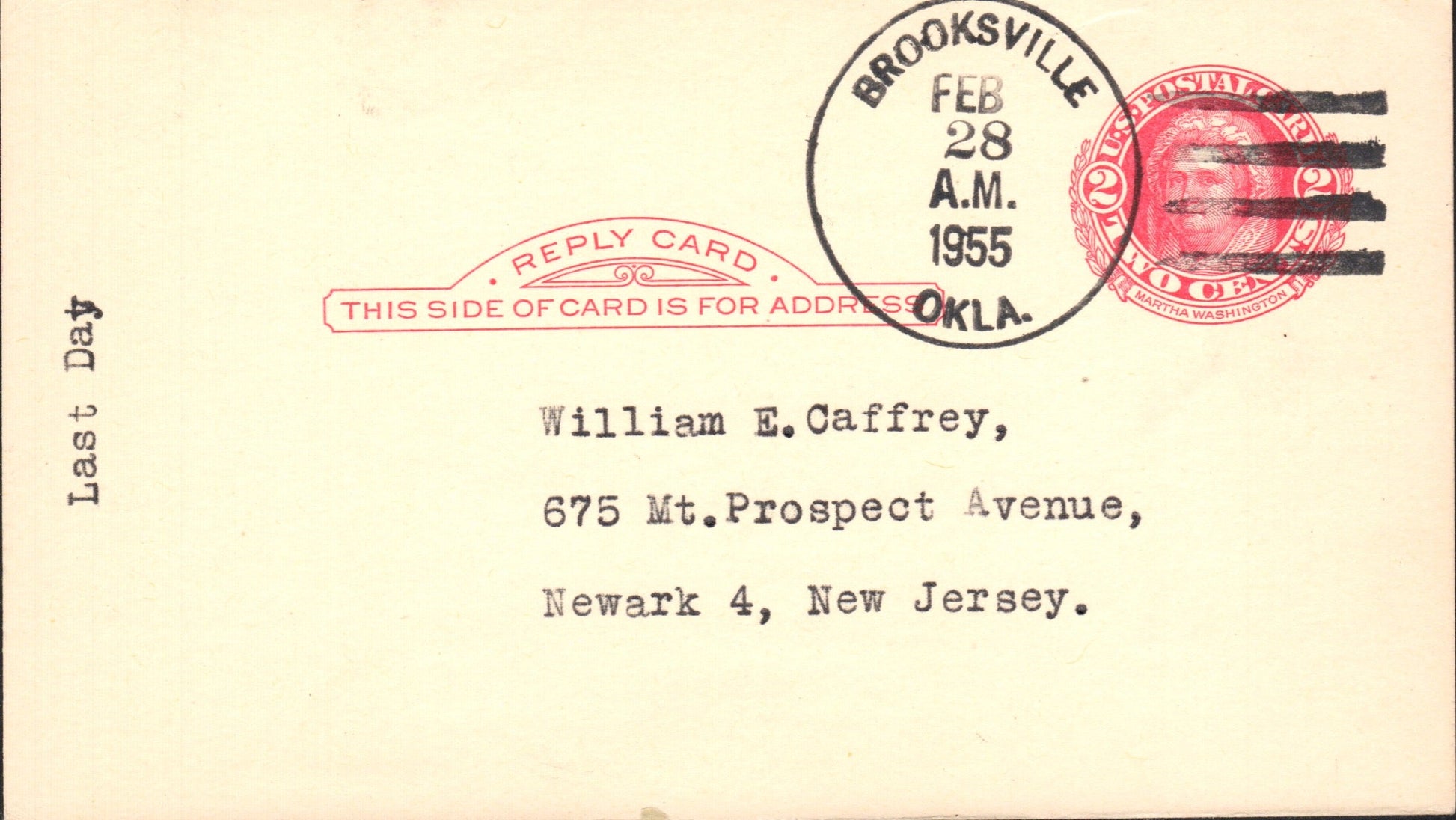 Brooksville (1909-1955) 1955 4-bar on LD Postal Card