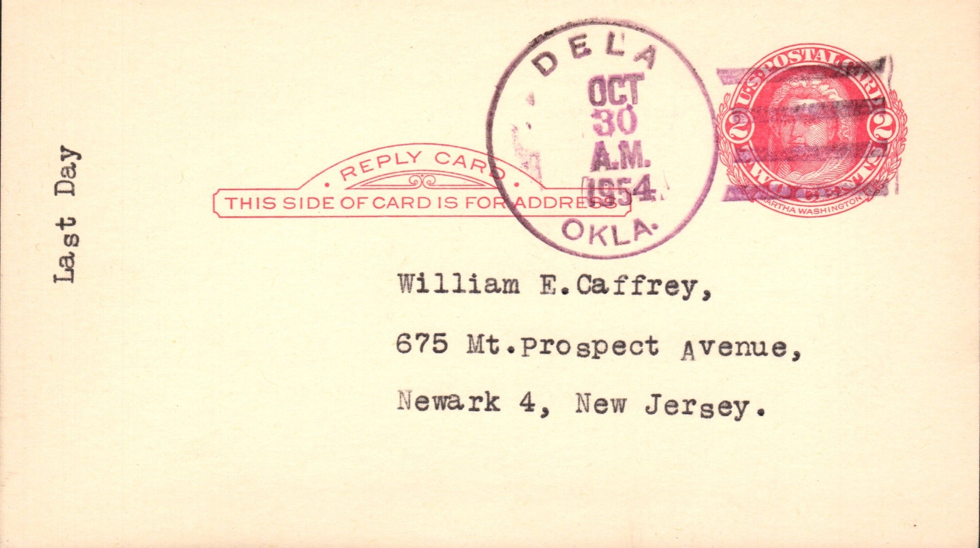 Dela (1920-1954) 1954 4-bar on LD Postal Card